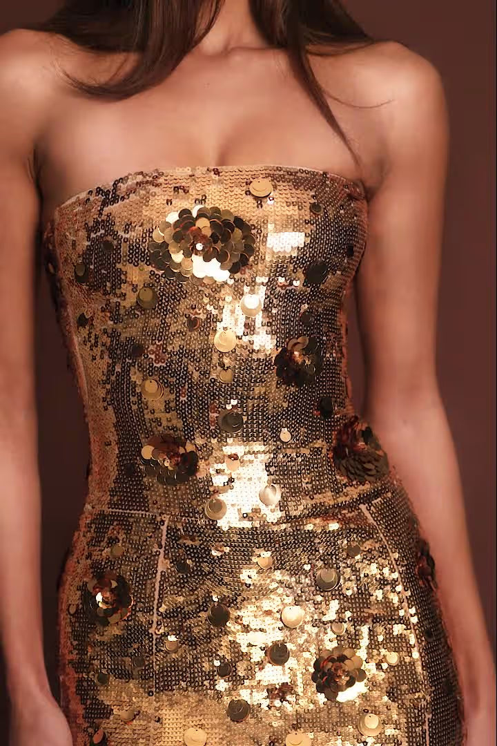 Embellished and bold. Ideal for unforgettable events, the Nottola dress is crafted from premium 20D mesh fabric, adorned with 3D sequin embellishments and cut to a striking maxi length. Designed with a bandeau neckline and finished with a luxurious puddle train, it’s perfect for your most extravagant nights.
