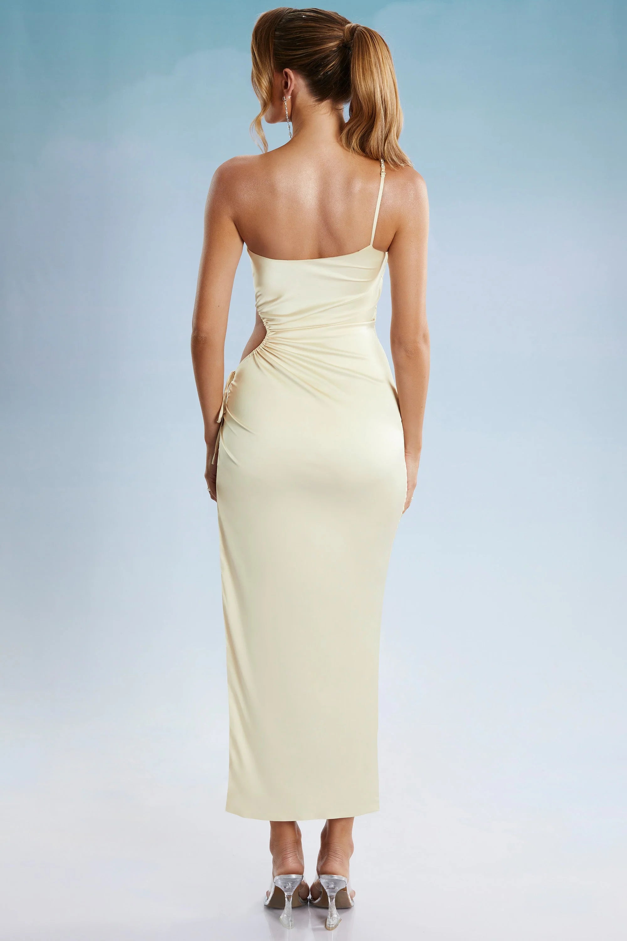 Decadent, premium and luxurious. The Behati satin maxi dress features an embellished crystal shoulder strap, an asymmetric neckline and an adjustable cut-out at the waist. The seductive thigh-split starts at the hip and runs along the length of the dress.