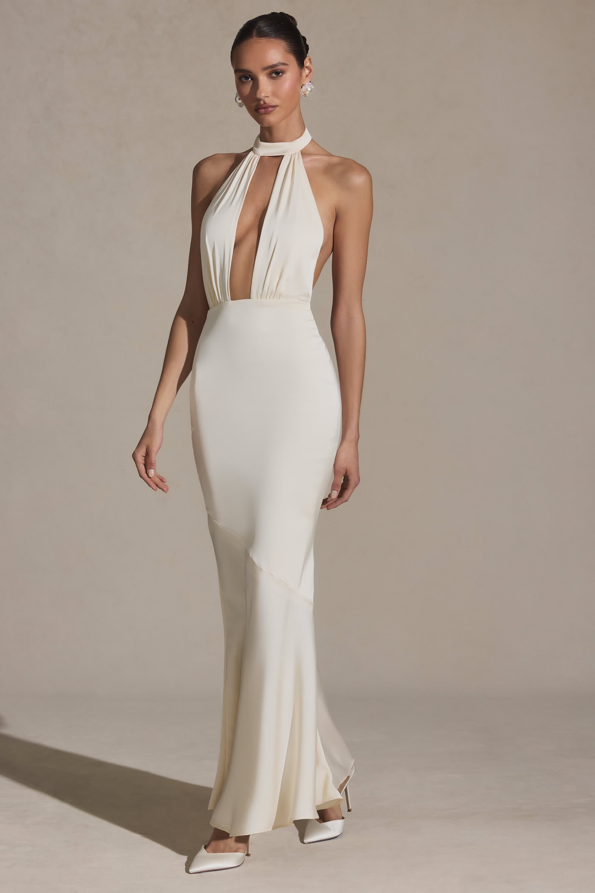 Designed for grand entrances, the Desiree gown is cut to a head-turning fishtail silhouette with a plunging neckline and a curved open back. Rendered in two timeless hues, it’s made from premium lightweight slinky satin that moulds to your figure and falls to a floor-skimming fishtail skirt, complete with shaping seams.