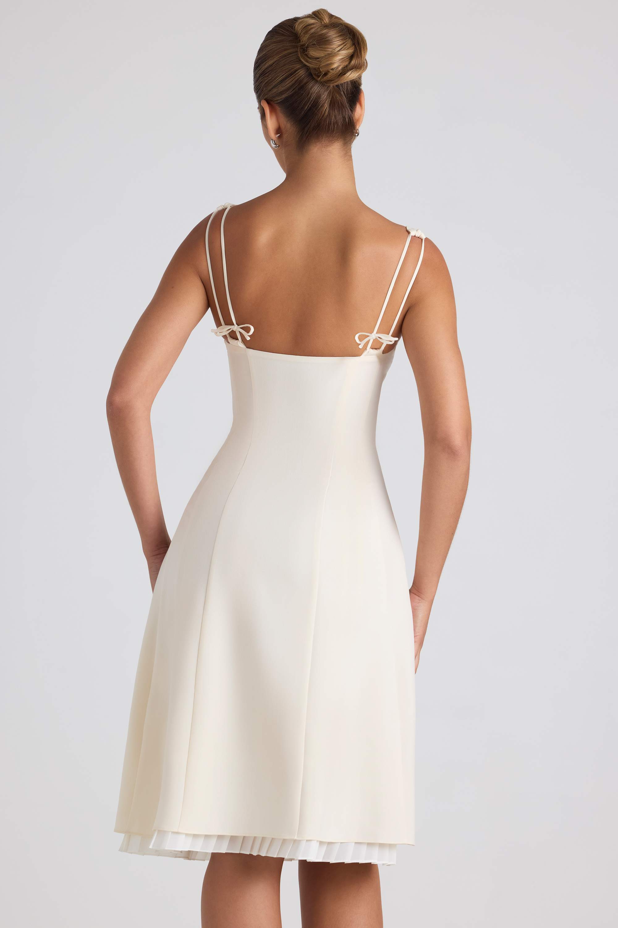Channelling the essence of spring. Rendered in two crisp hues, the Isadora midi dress is cut from sculpting stretch woven fabric and underlaid with a contrasting pleated georgette skirt. The A-line silhouette is enhanced with shaping princess seams and framed with a Bardot neckline, complete with bow embellishments at each side. It’s finished with adjustable rouleau shoulder straps that tie at the back.