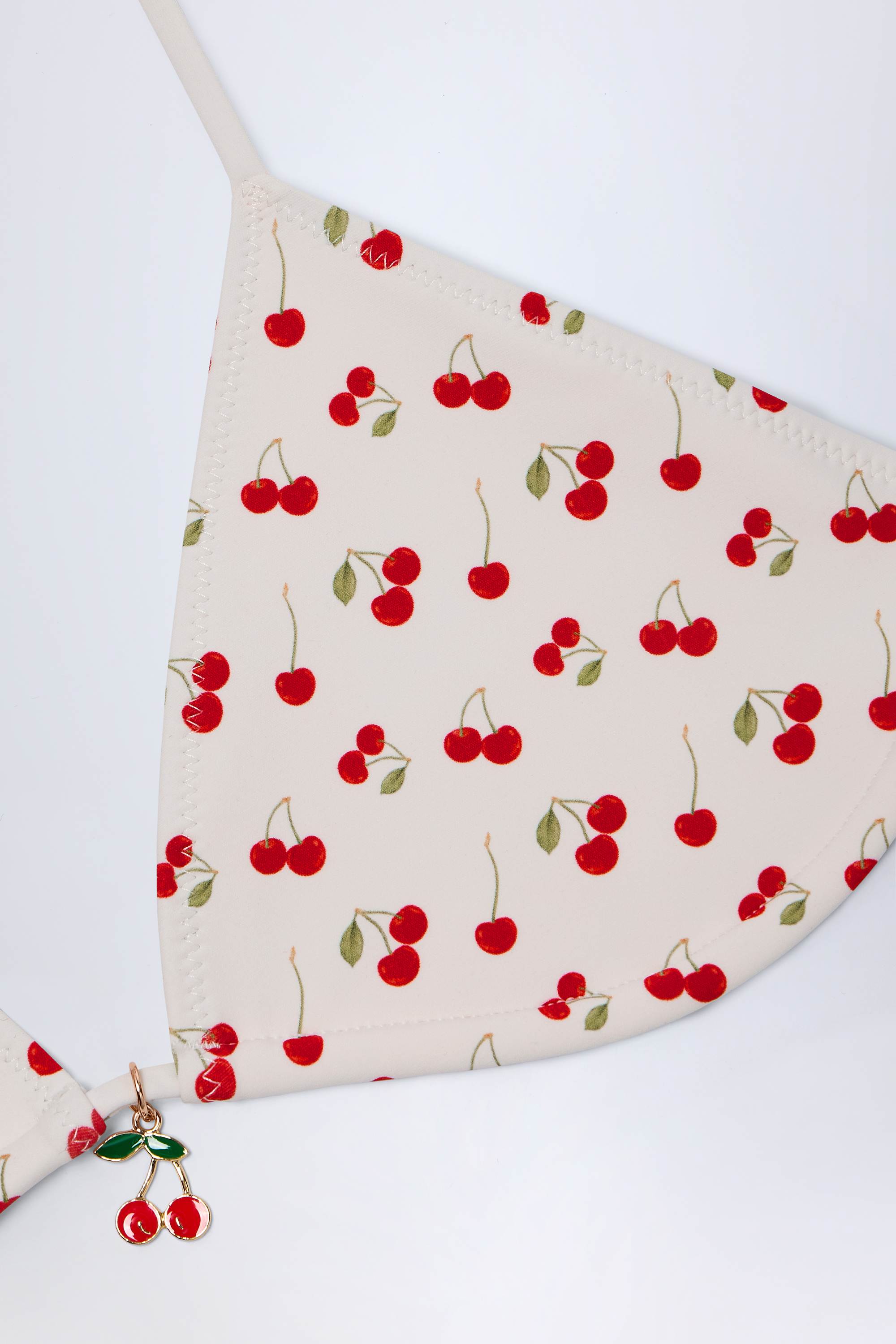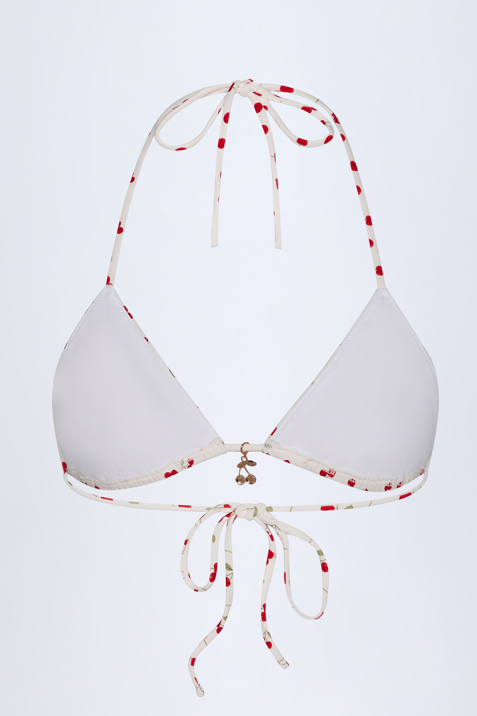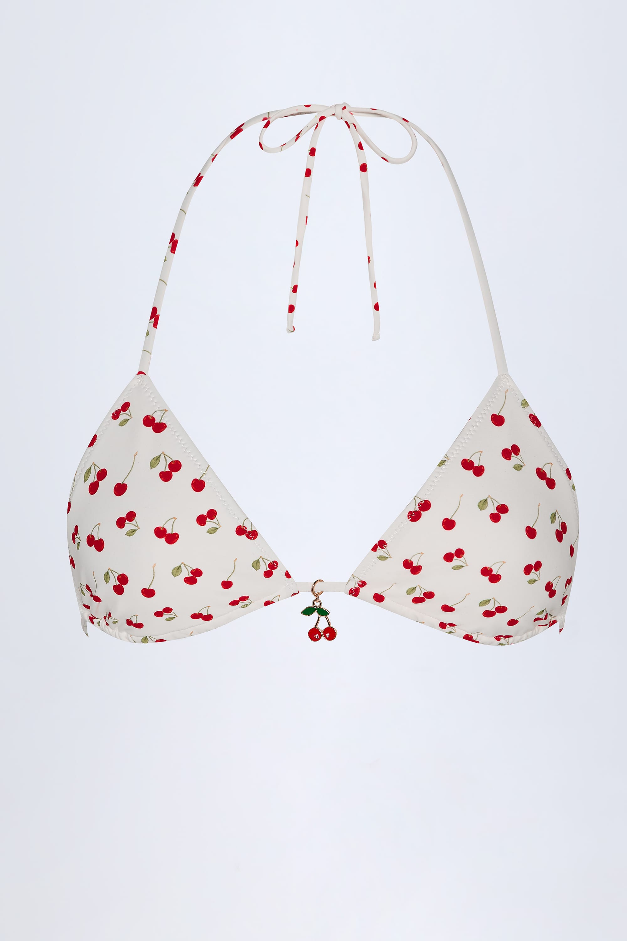 The cherry on top. A fresh take on everyone’s favourite shape, the Calella bikini top is crafted from our premium stretch swim jersey to a classic triangle silhouette with a ruched underbust for custom coverage. It features halterneck and back straps that can be adjusted for your perfect fit and is strung with a glossy cherry charm, in keeping with the playful aesthetic.