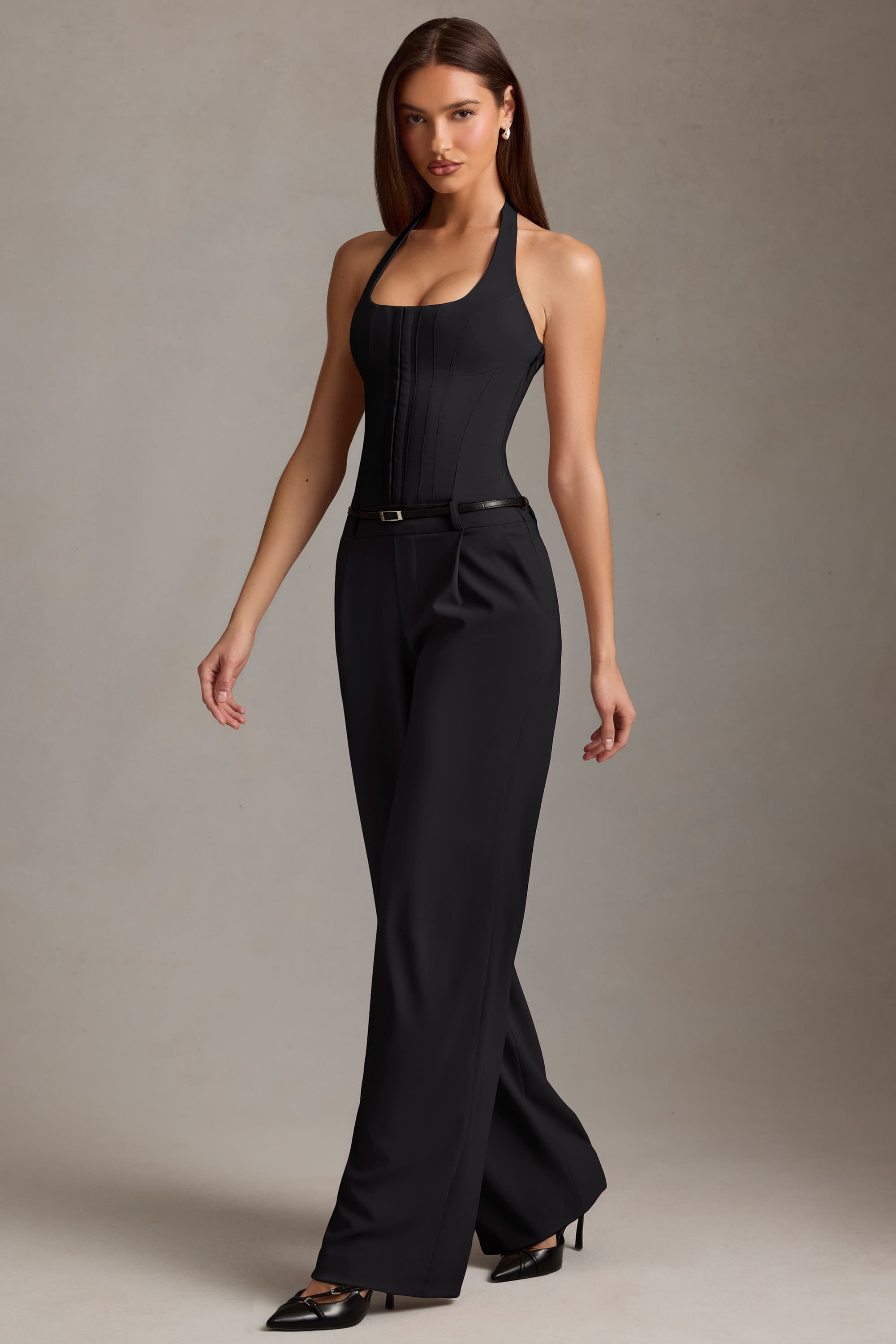 Corset-Detail Halterneck Jumpsuit in Black