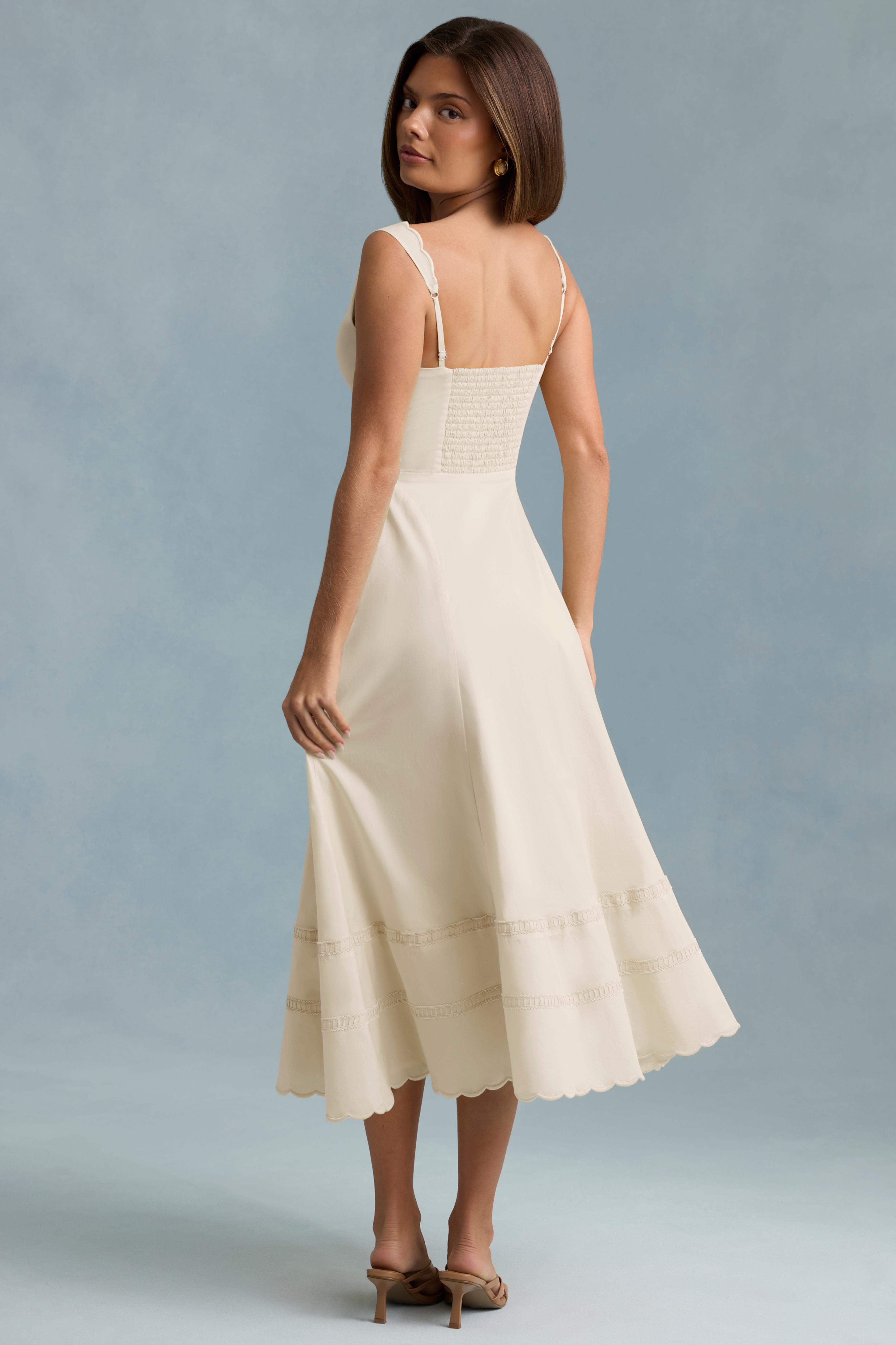 Ready for summer stories, the Aralisse midaxi dress is crafted from premium cotton poplin with a lightweight feel and a touch of stretch. Cut to a universally flattering A-line silhouette with a fitted, pintucked bodice and full skirt, it’s framed with a scalloped V-neckline and adjustable rouleau straps. The fabric-covered buttons nod to classic styles.