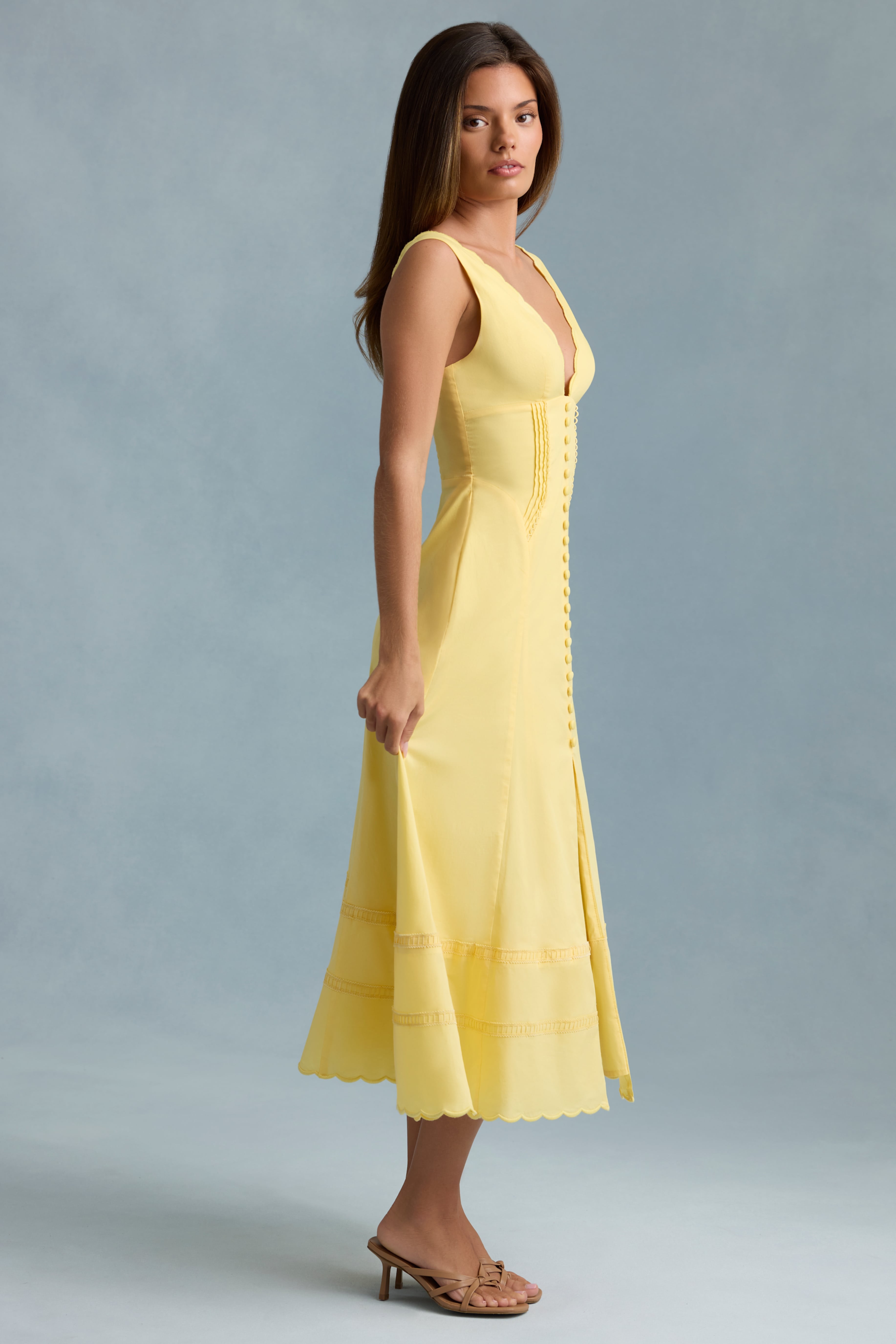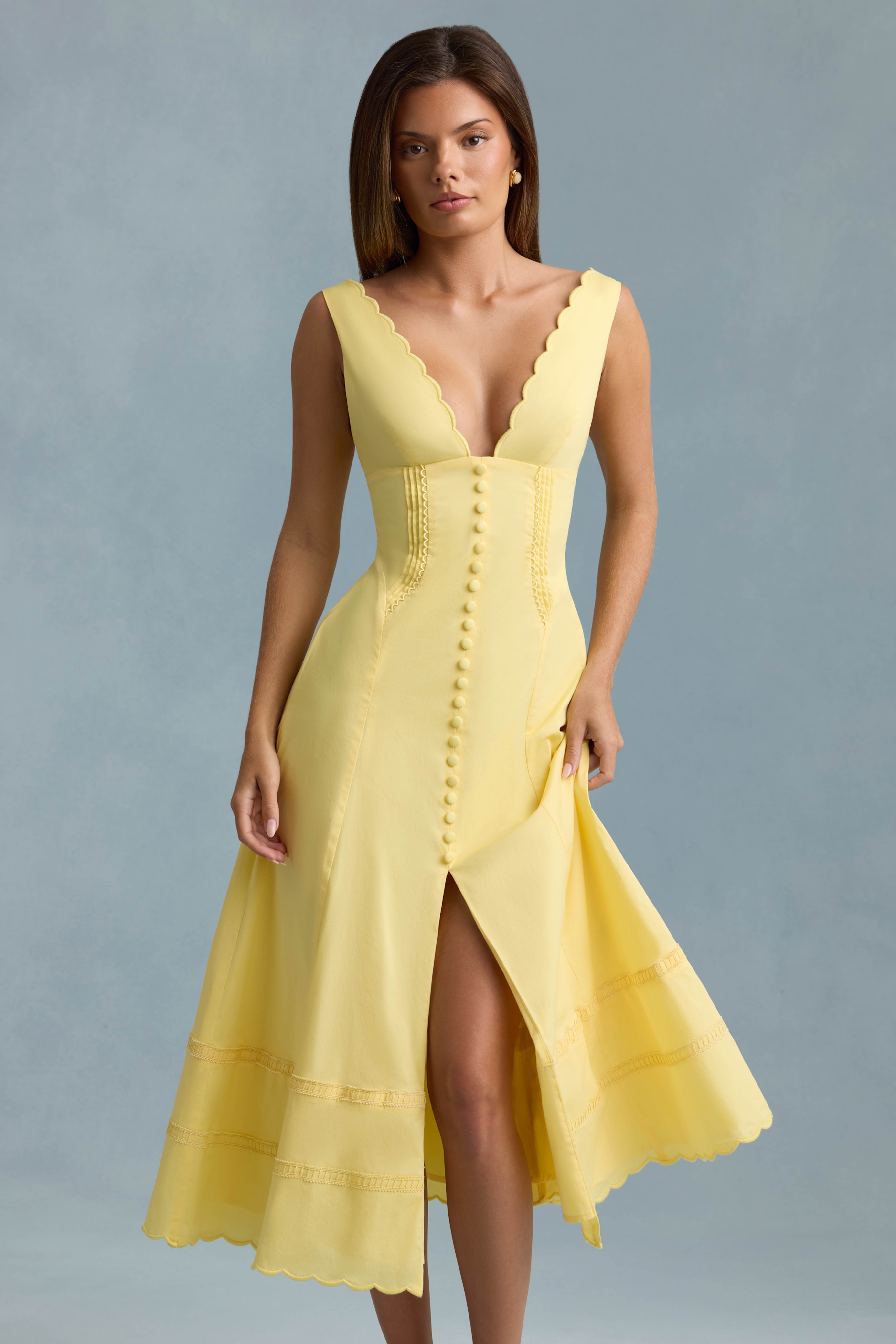 Ready for summer stories, the Aralisse midaxi dress is crafted from premium cotton poplin with a lightweight feel and a touch of stretch. Cut to a universally flattering A-line silhouette with a fitted, pintucked bodice and full skirt, it’s framed with a scalloped V-neckline and adjustable rouleau straps. The fabric-covered buttons nod to classic styles.