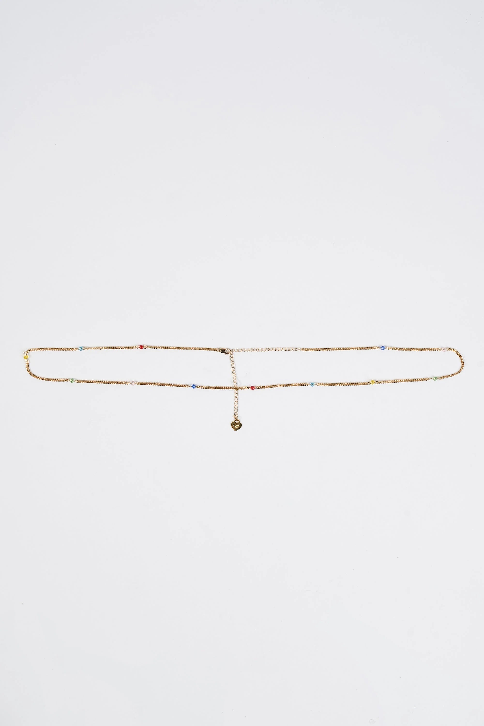 A statement finishing touch. Ideal for adding a touch of glamour to beach club looks, this waist chain is crafted from gold-tone metal with chunky curb links and punctuated with faceted crystal embellishments that add a pop of colour. It comes in a soft-touch branded pouch for safekeeping and easy packing.