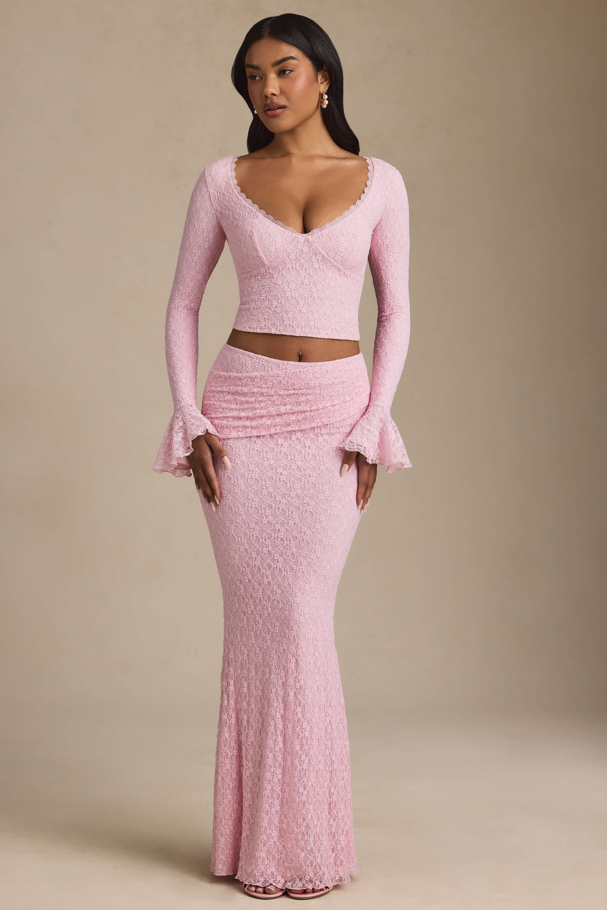 Draped Low-Rise Lace Maxi Skirt in Soft Pink