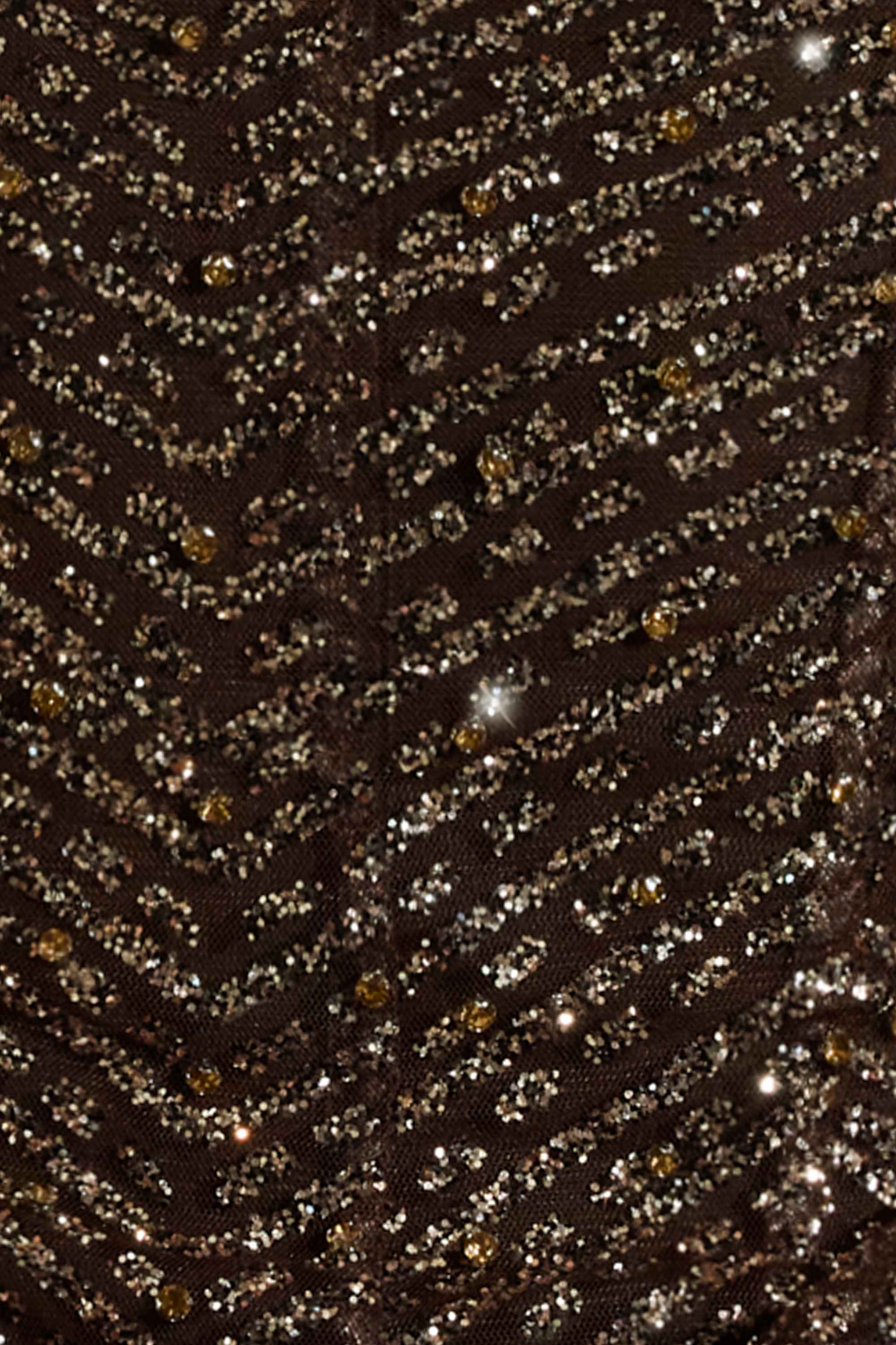 Opulent nights start with the Amalina mini dress. Crafted from our premium lightweight mesh in a chevron glitter design and adorned with three-dimensional beads for maximum impact, it’s a statement style made for your next event. Cut to a universally flattering A-line silhouette with a built-in corset and precise draped detailing, it delivers drama from every angle.