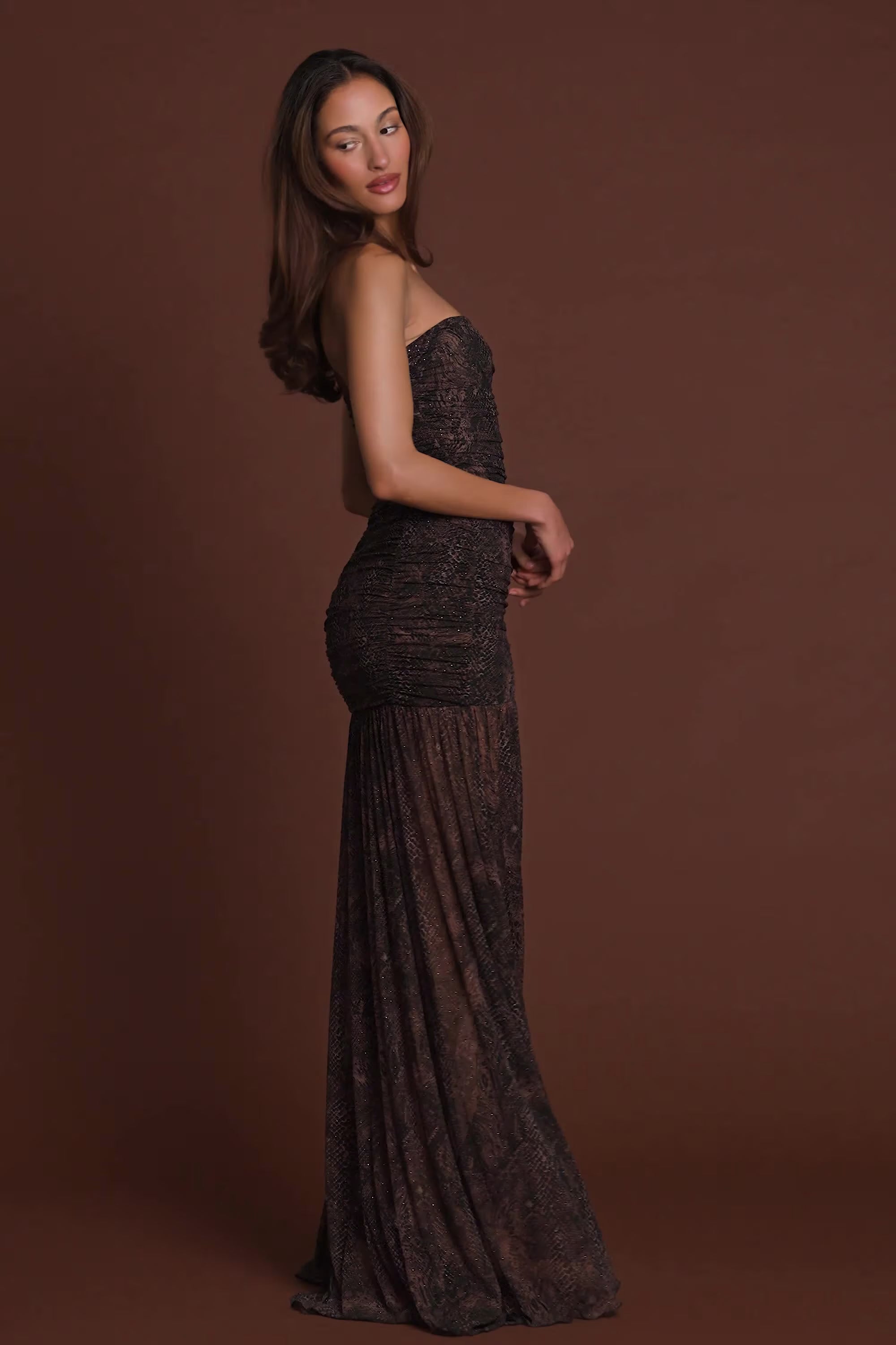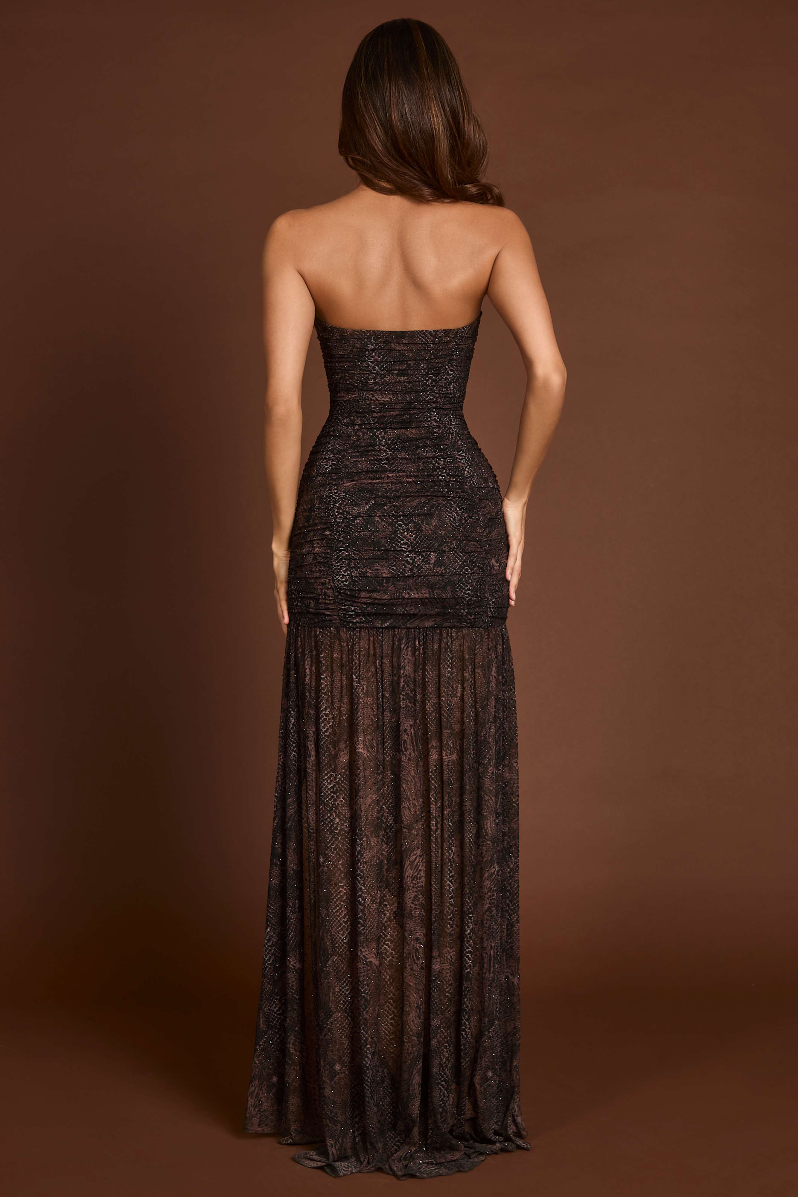 Inspired by 90s couture and Italy’s golden era of fashion, the Ersilia dress is rendered in a bold snake print dotted with HOTFIX embellishments. It’s crafted to a figure-hugging silhouette, featuring an asymmetric thigh-high split for a seductive edge. Designed with ruched detailing and a concealed side zip, it screams high-octane glam.