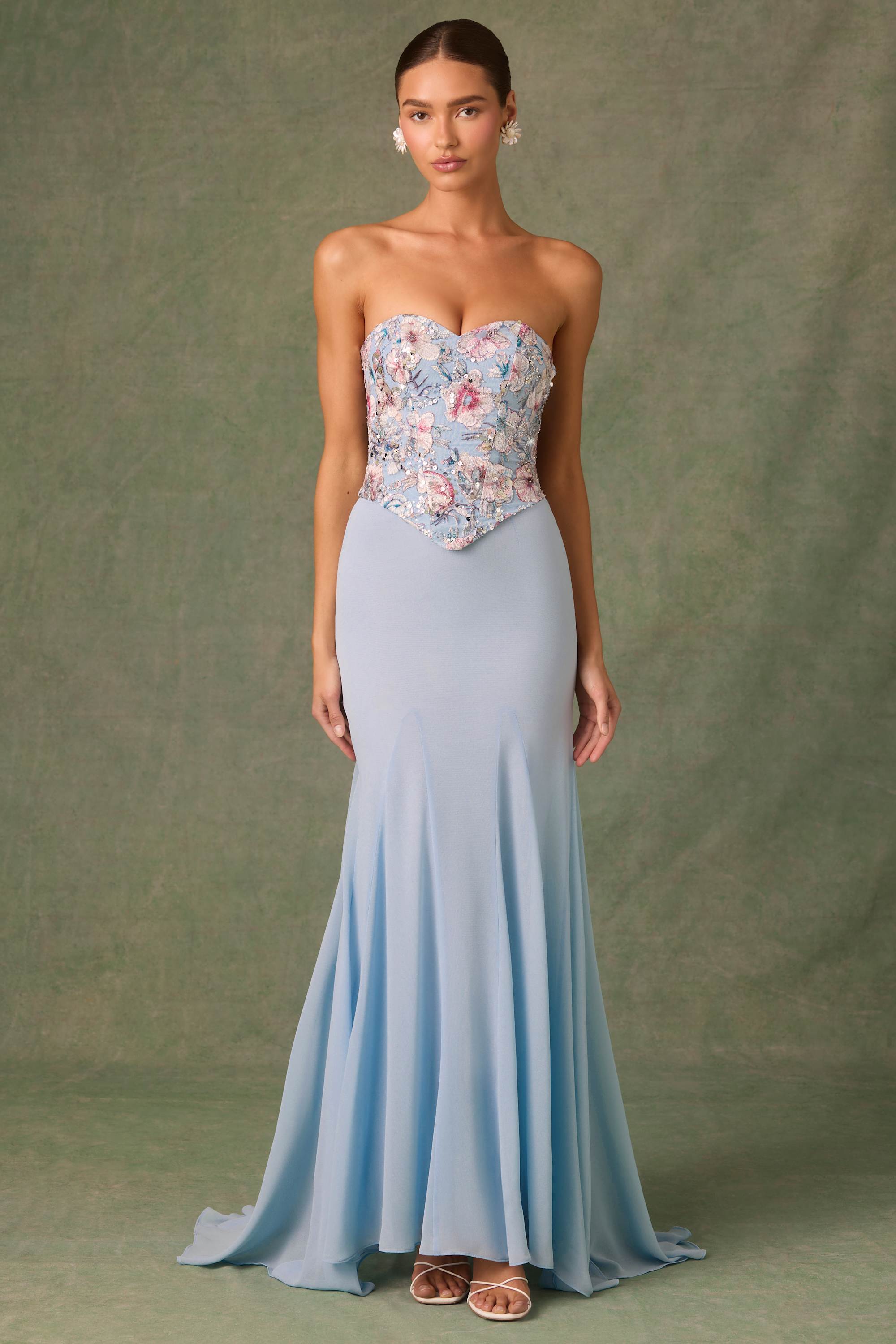 Divinely crafted. Spotted on the runway first, the Lysana gown is designed for extra-special occasions and features a fully embellished corset bodice overlaid with watercolour-inspired custom floral appliqués brought to life with sparkling sequin embellishments. It features a floor-skimming chiffon skirt with godet pleats for dynamic movement and is complete with signature lace-up detailing at the back that can be adjusted for your perfect fit.