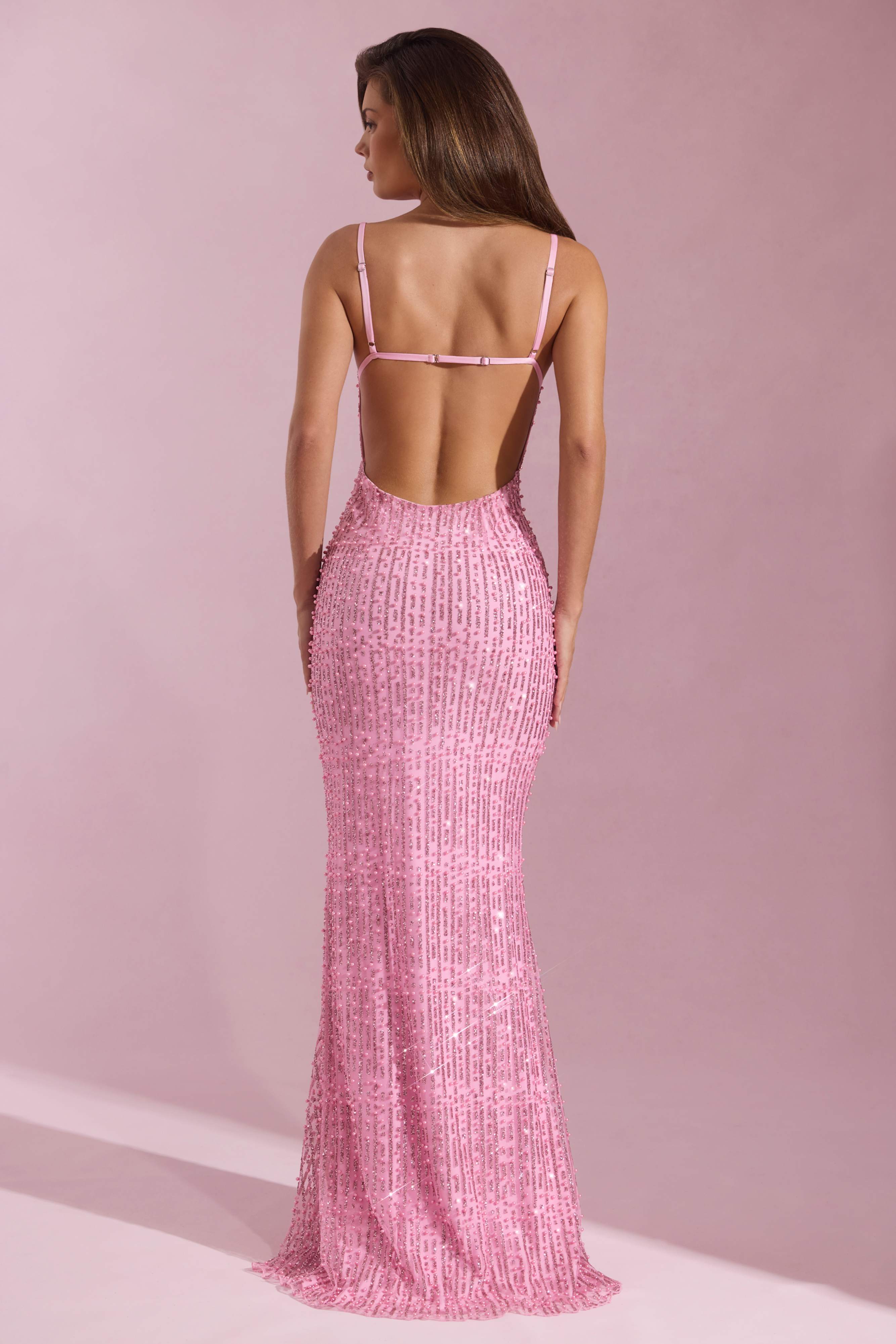 Embellished Cowl-Neck Backless Maxi Dress in Pink