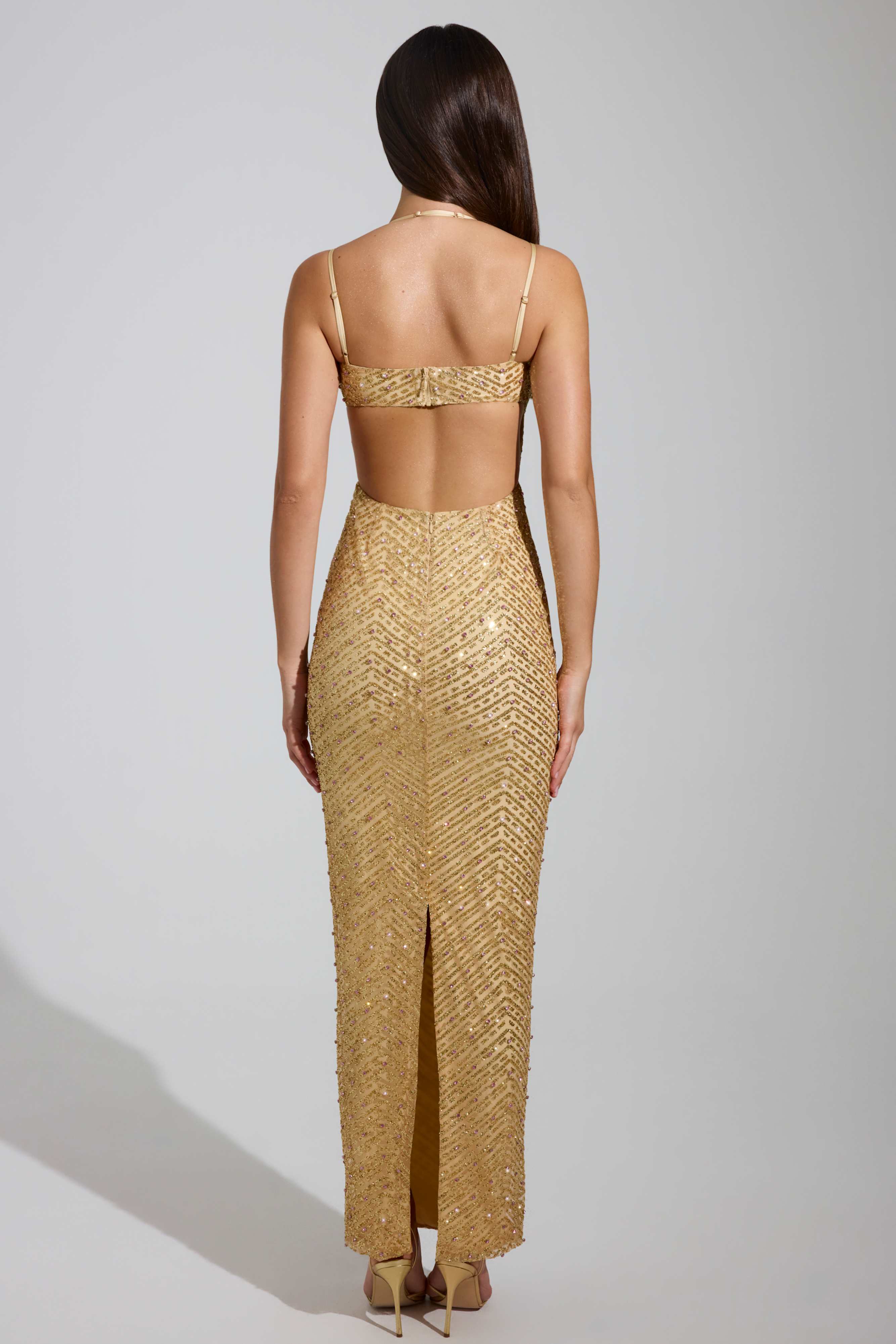 Unapologetically glam – that’s the Constance maxi dress. Featuring an all-over glitter chevron design with contrasting pink diamantés, it’s crafted from our premium mesh fabric and fully lined for just the right amount of coverage. Designed with a bust-flattering cowl neckline, a reverse kick split, and adjustable multi-strap detailing, it’s made to leave a lasting impression at your most opulent events.