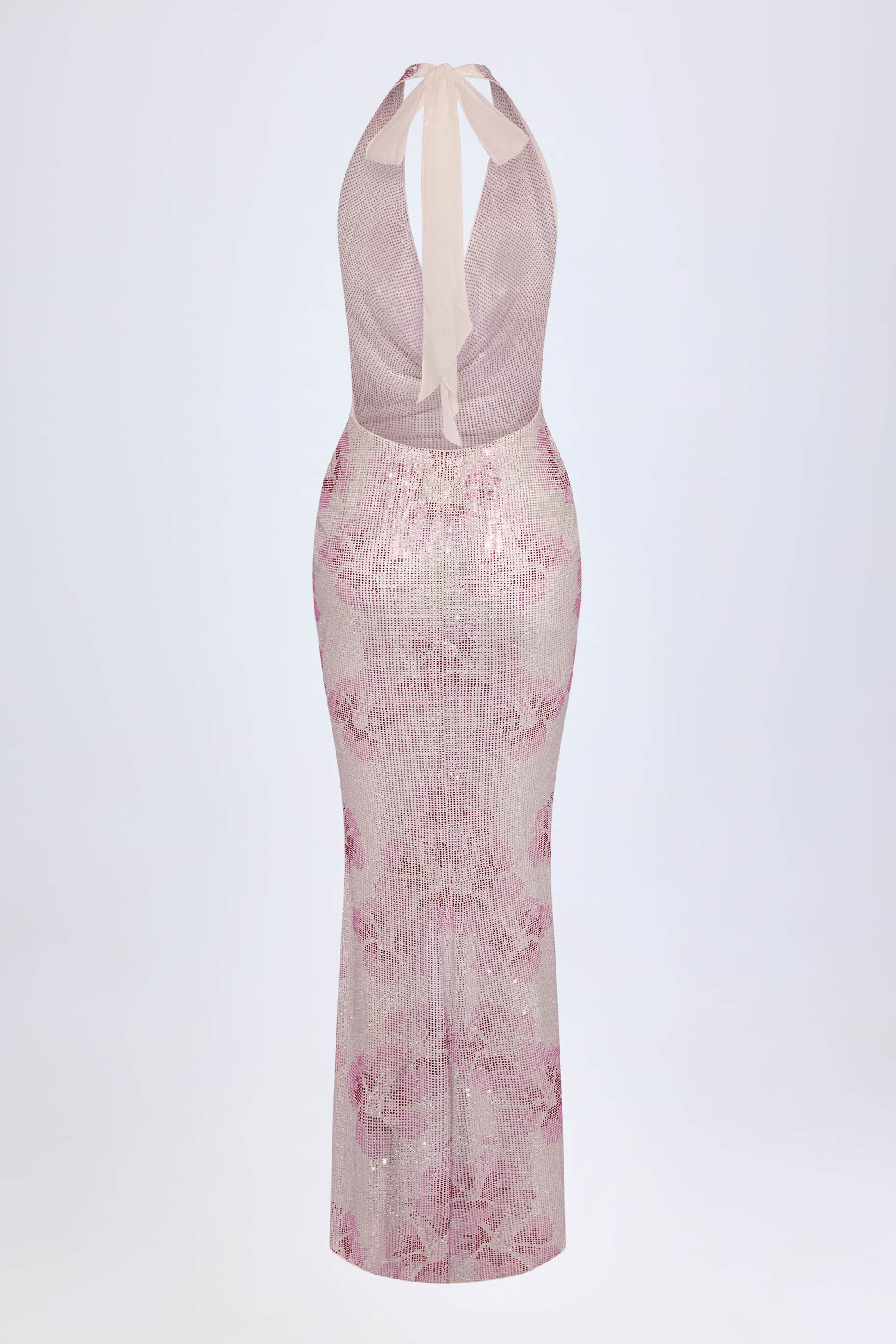 Sparkles for sunset. The Soleya maxi dress is crafted from stretchy and slinky 20D mesh, unlined for a barely-there feel, and adorned with signature HOTFIX embellishments arranged to resemble tropical-inspired flowers. Designed to drape effortlessly, it’s elevated with a low cowl neckline, statement thigh-high leg spit, and a low open back. It’s cut to a column silhouette with a puddle hem and framed with adjustable halter ties for your perfect level of support and coverage from golden hour to after dark.