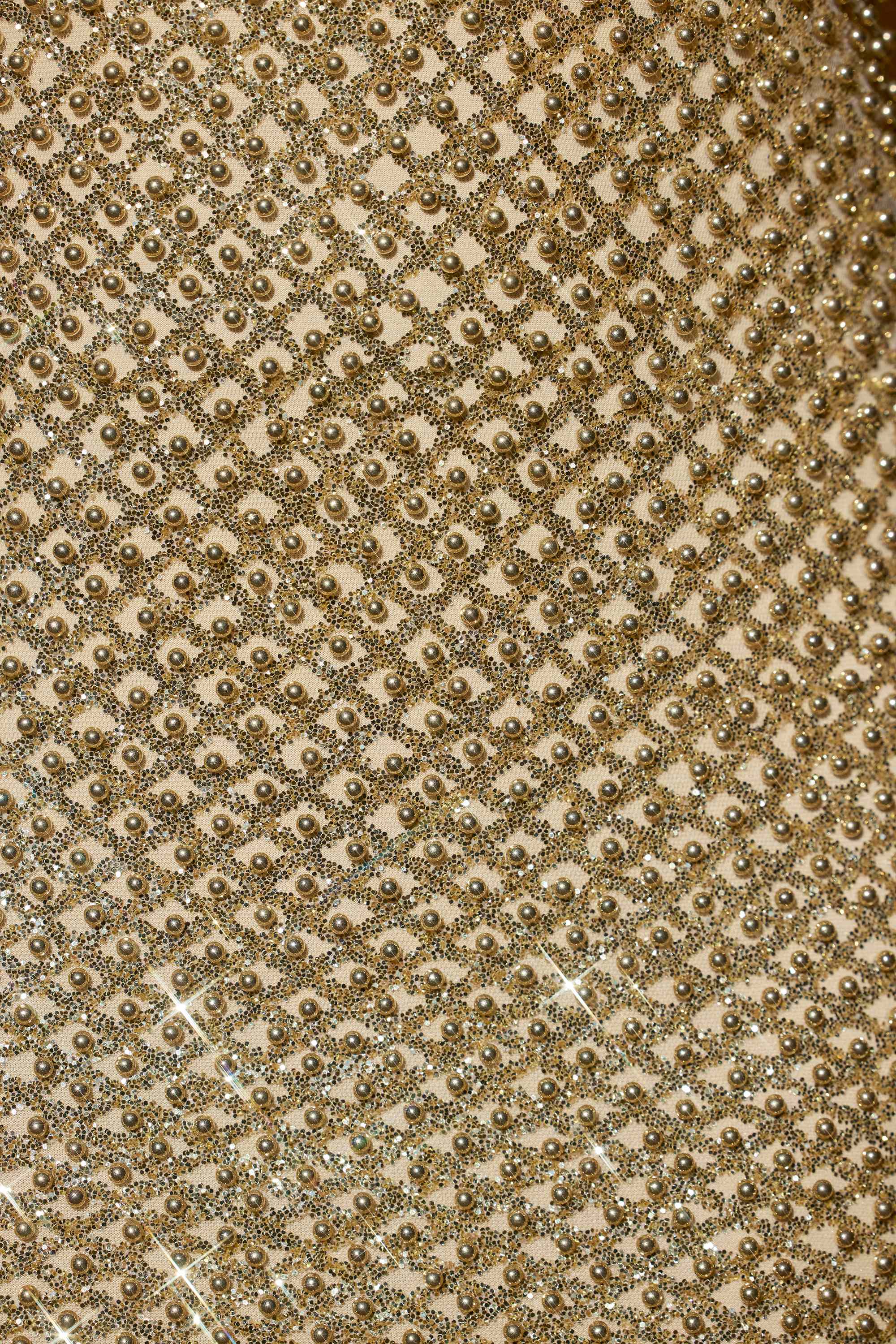 Made from premium glittered mesh with a stretch jersey and mesh lining (Shell: 100% Polyester, Lining1: 95% Polyester, 5% Elastane; Lining2: 82% Polyester, 18% Elastane). Fully lined.