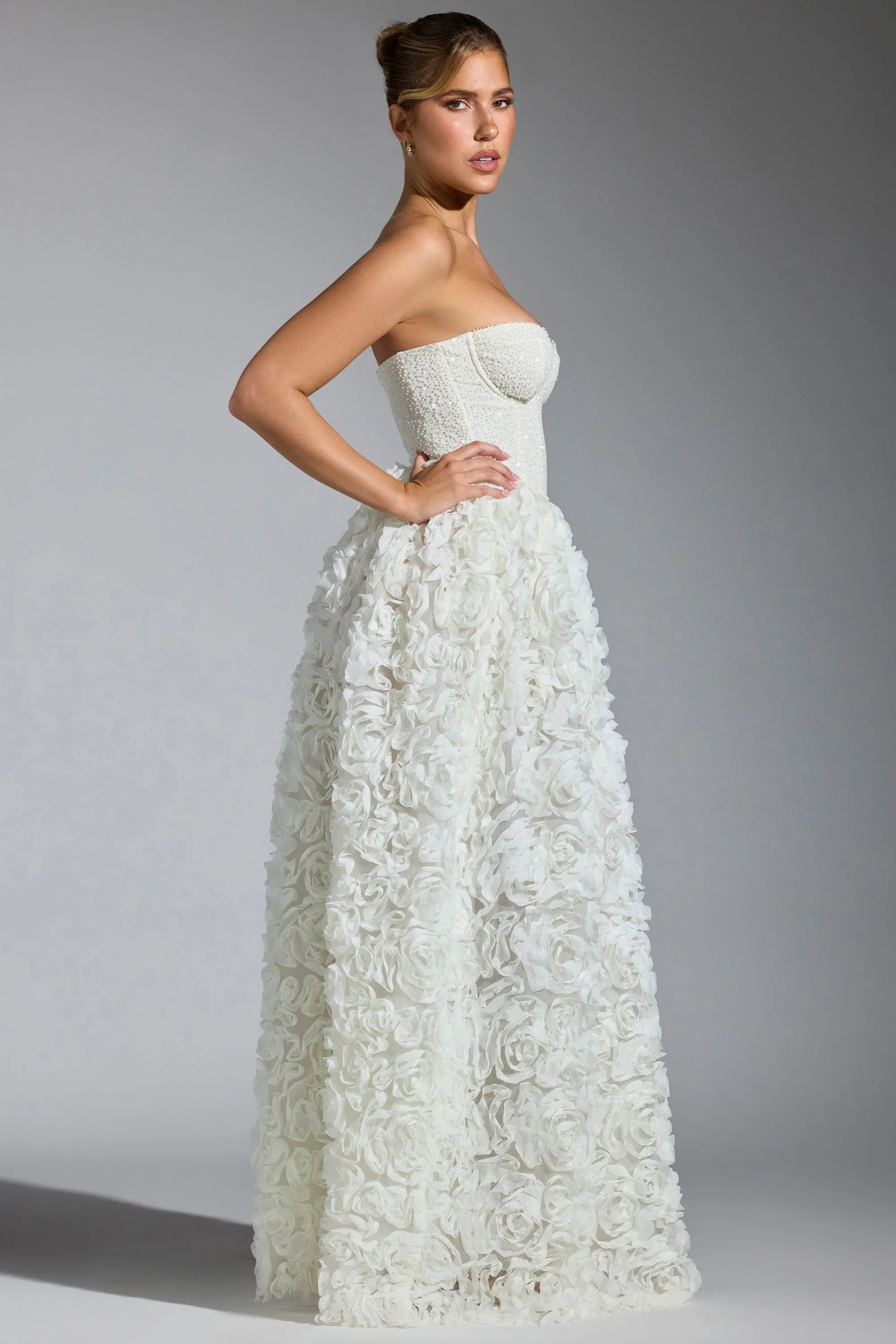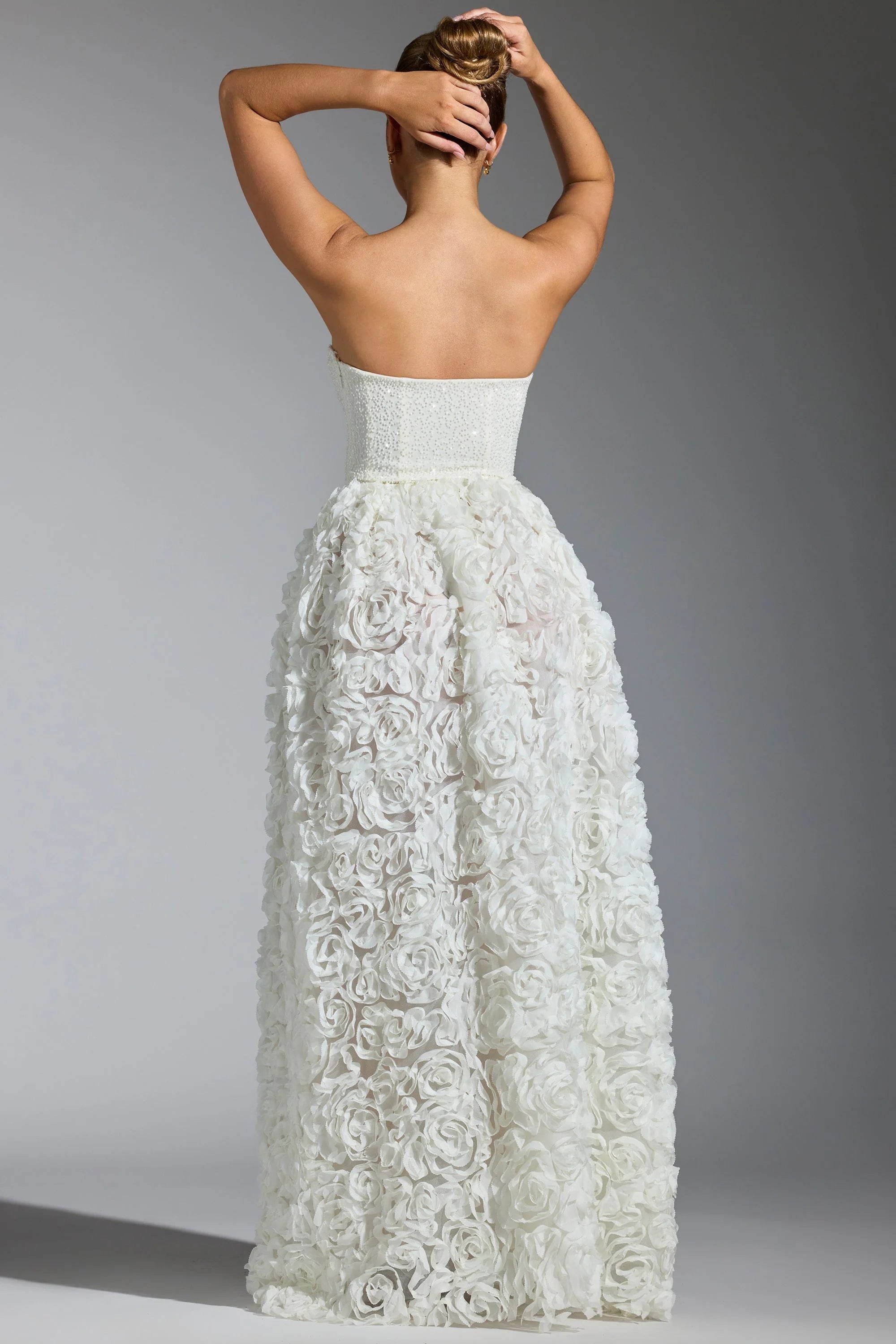 Classic corsetry meets ethereal, couture-led elements with the Camellia gown. An extraordinary piece designed for memorable events, the embellished bodice falls to a frothy full-length skirt crafted in our custom 20D mesh fabric and enhanced with delicate tulle rosette appliqués: each one is lovingly hand-applied to create a stunning three-dimensional finish. The sweetheart neckline is framed with slender detachable straps, allowing you to create multiple custom looks.