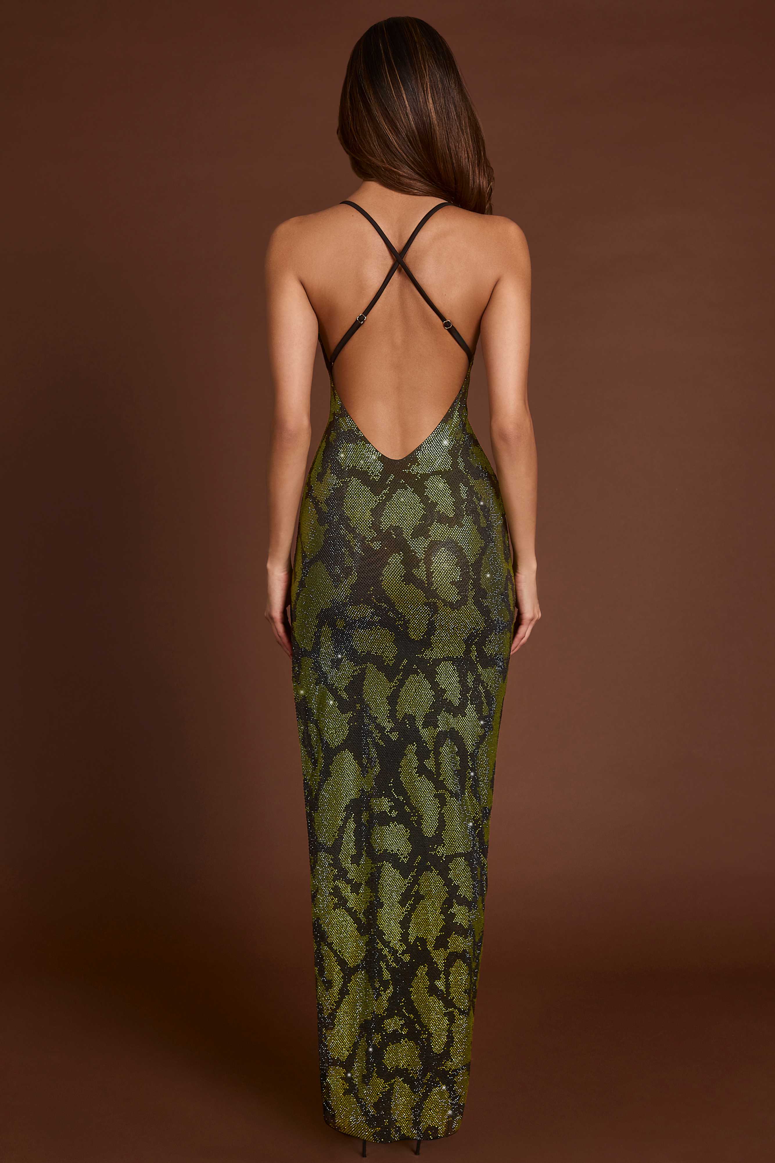 High-glam nights start with our Luserna maxi dress. Designed with a plunging halter neckline, adjustable cross-back straps, and a low open back, it’s bold, sexy, and made for you to play muse. The all-over snake HOTFIX embellishment seals the look with unapologetic glamour.