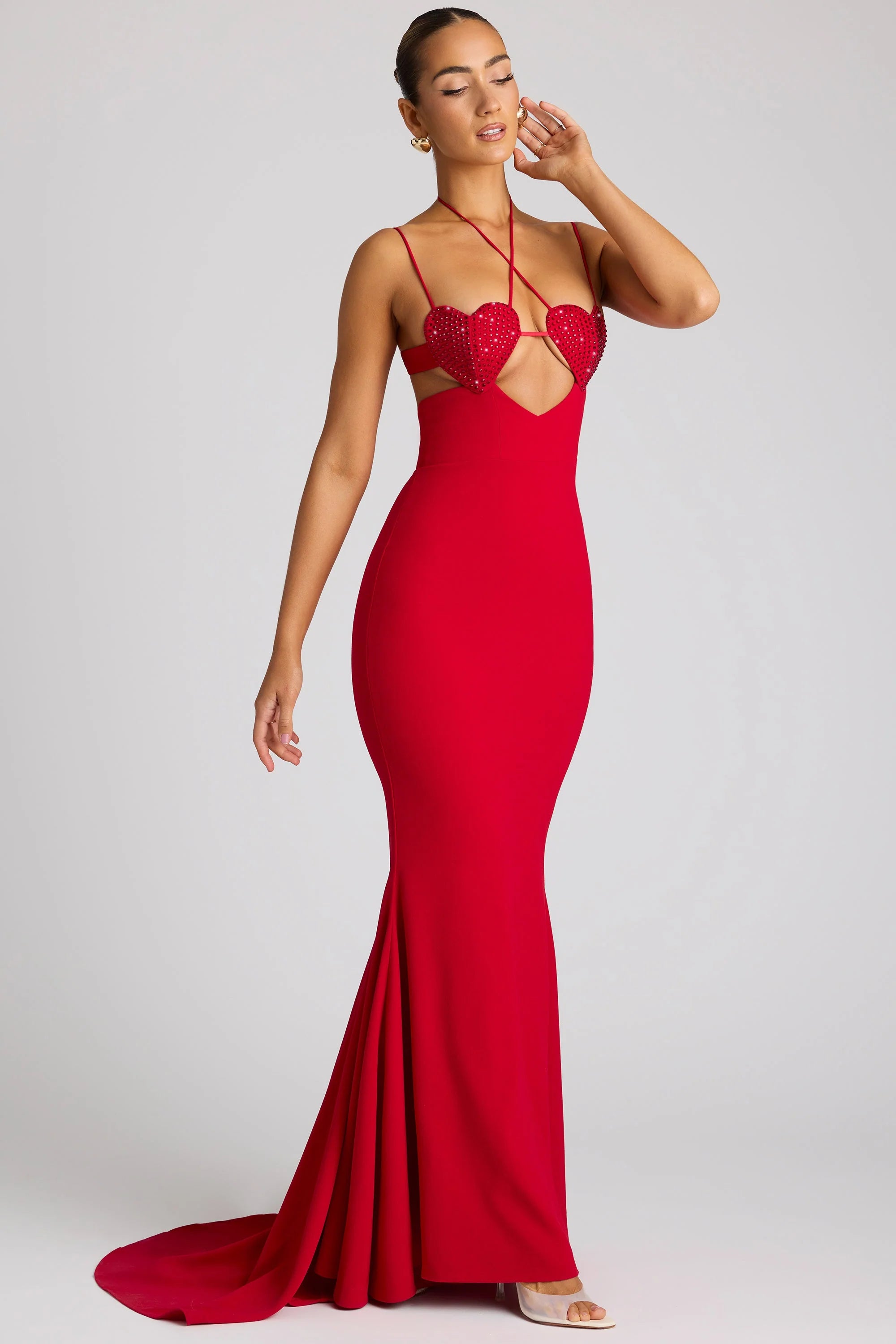 Embellished Heart Cup Detail Evening Gown in Fire Red