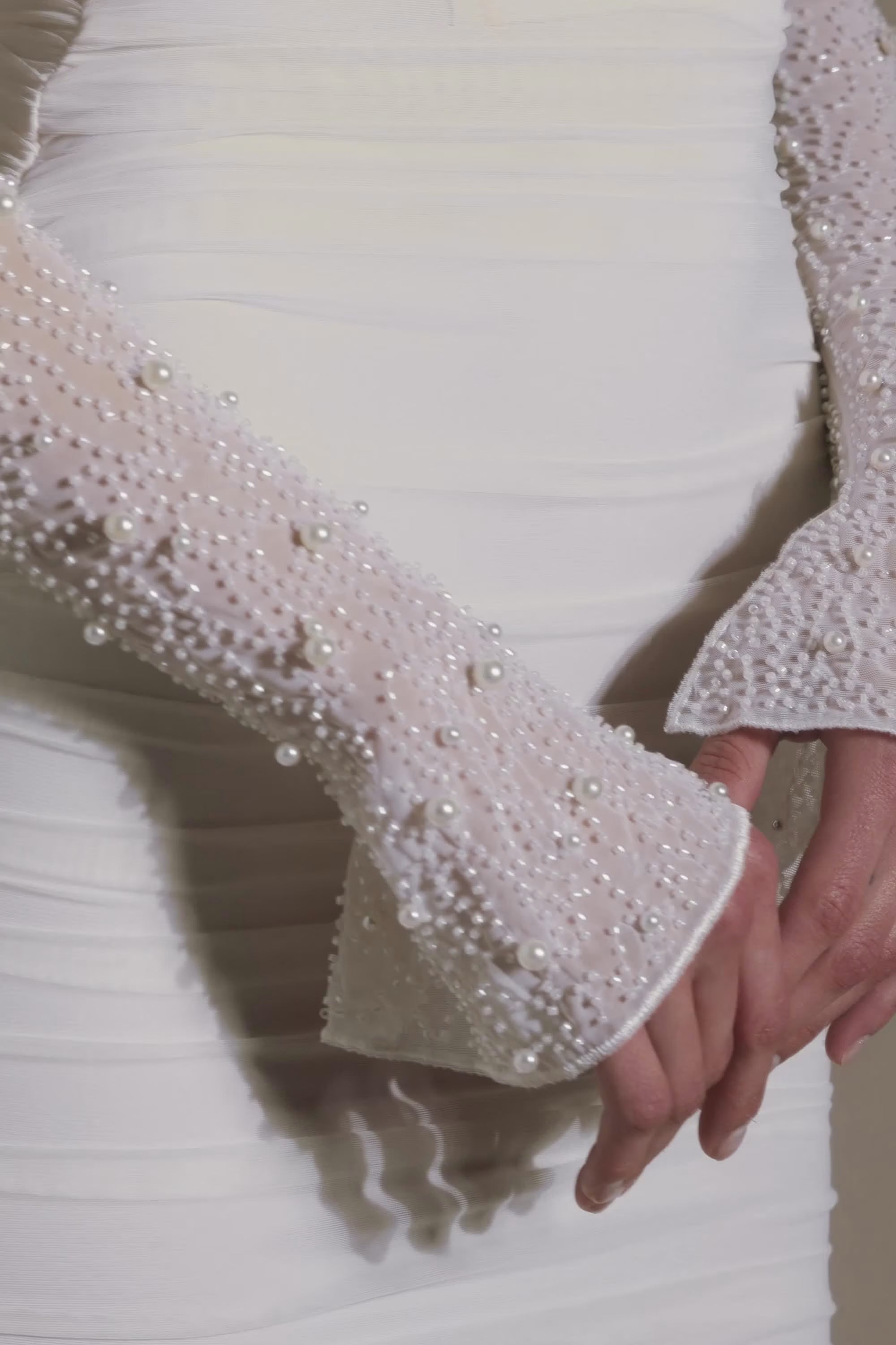 Ultra-luxe and undeniably sexy, the St. Germain mini dress is the perfect statement mini dress. Designed in our body contouring stretch mesh fabric, St. Germain is fully ruched for an endlessly flattering fit. Featuring semi sheer raglan sleeves with hand embellished pearl and bead detailing that flare at the wrist and cut to a leg lengthening mini length, St. Germain can be relied upon to exude allure at your next event.