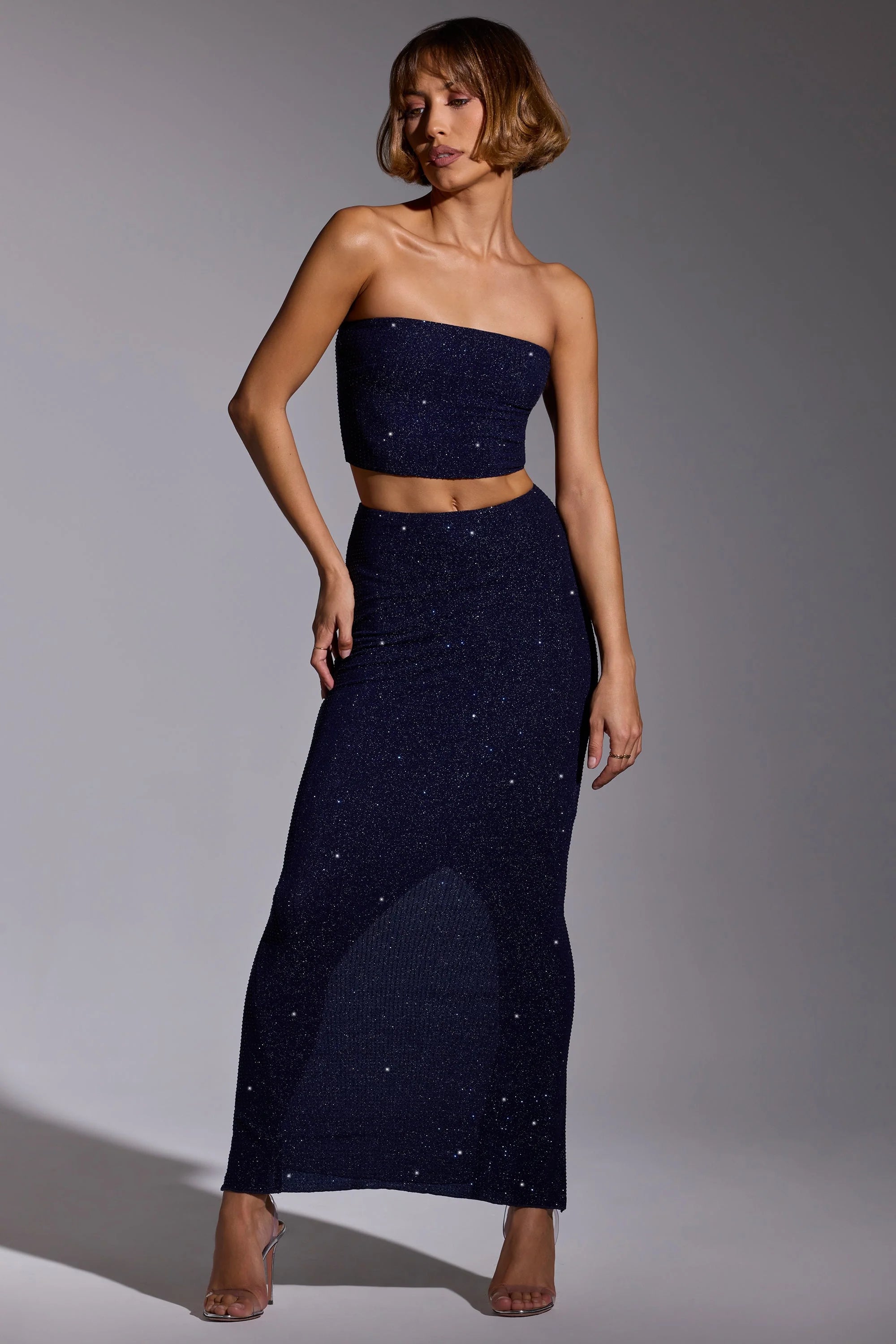 Create an unforgettable two-piece look with the glittering Melisande gown skirt. Cut to a dramatic maxi length and hand-embellished with sparkling hotfix, Melisande is made from stretch jersey fabric with woven metallic yarn. The flattering mid-rise design is destined to sparkle on the dancefloor and features a centre back split for ease of movement.