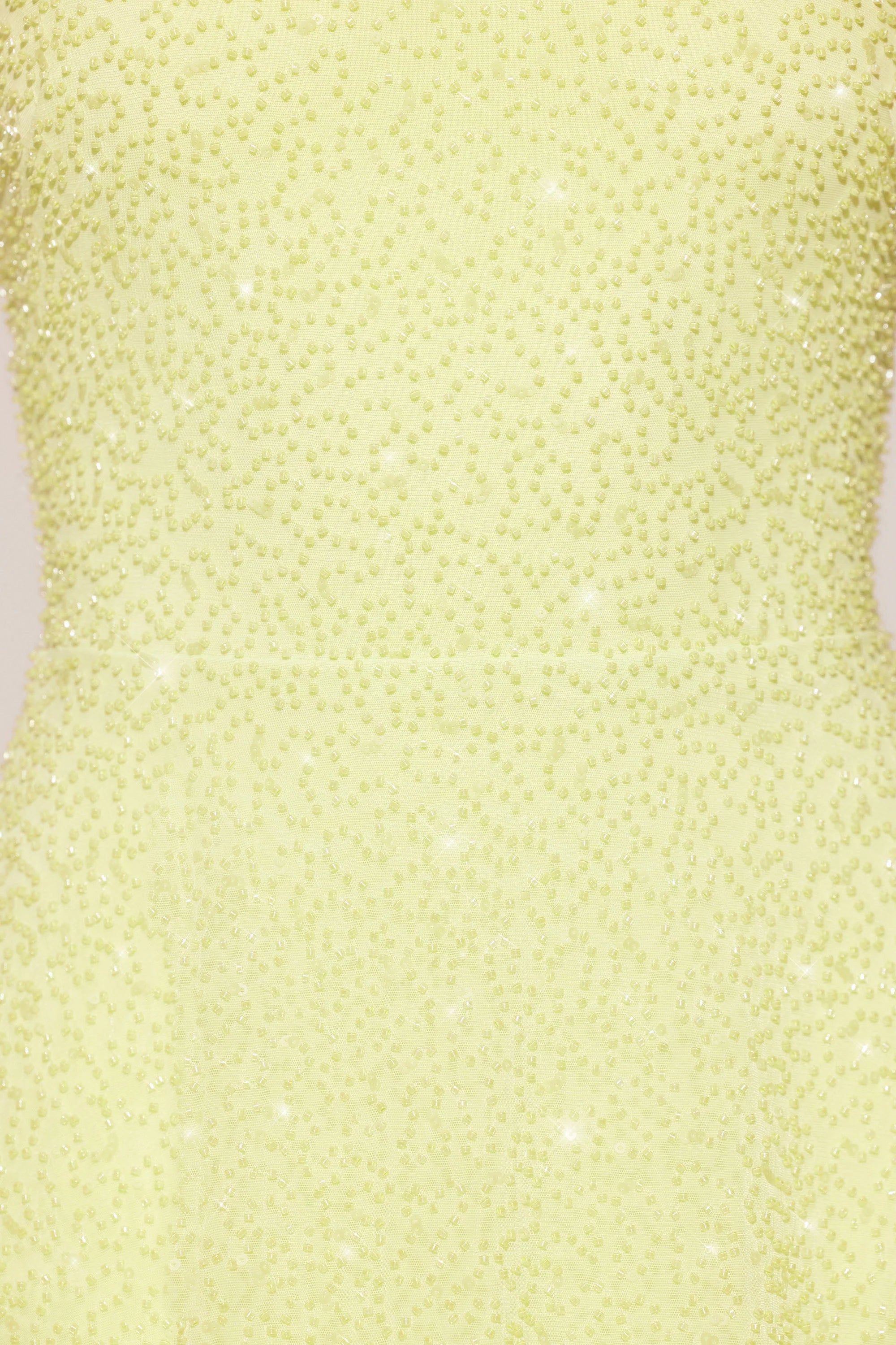 Dual layered mesh fabric with fully seeded embellishment throughout (Shell: 84% Polyester, 16% Elastane, Lining: 95% Polyester, 5% Elastane). Fully lined. Please read the wash instructions.