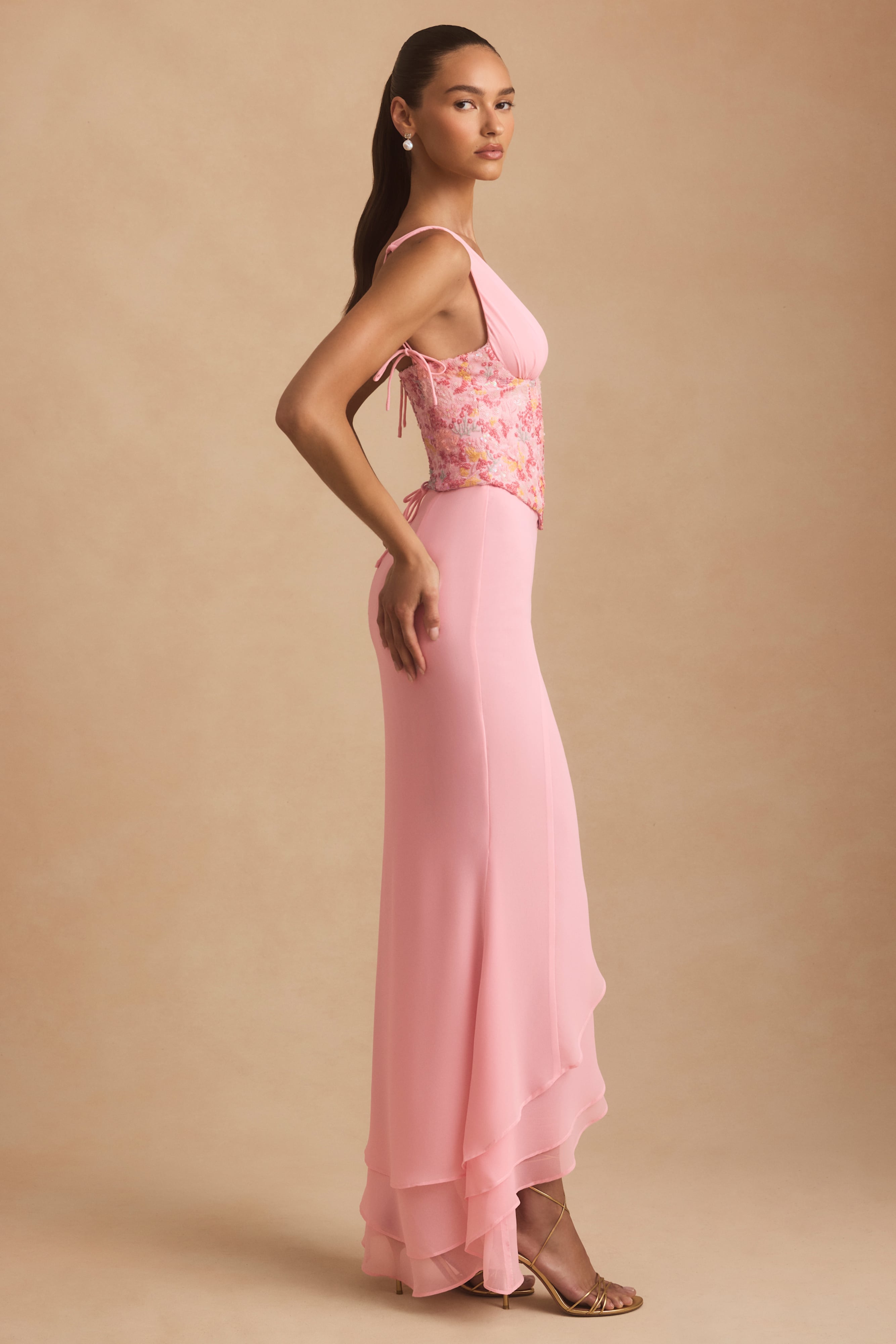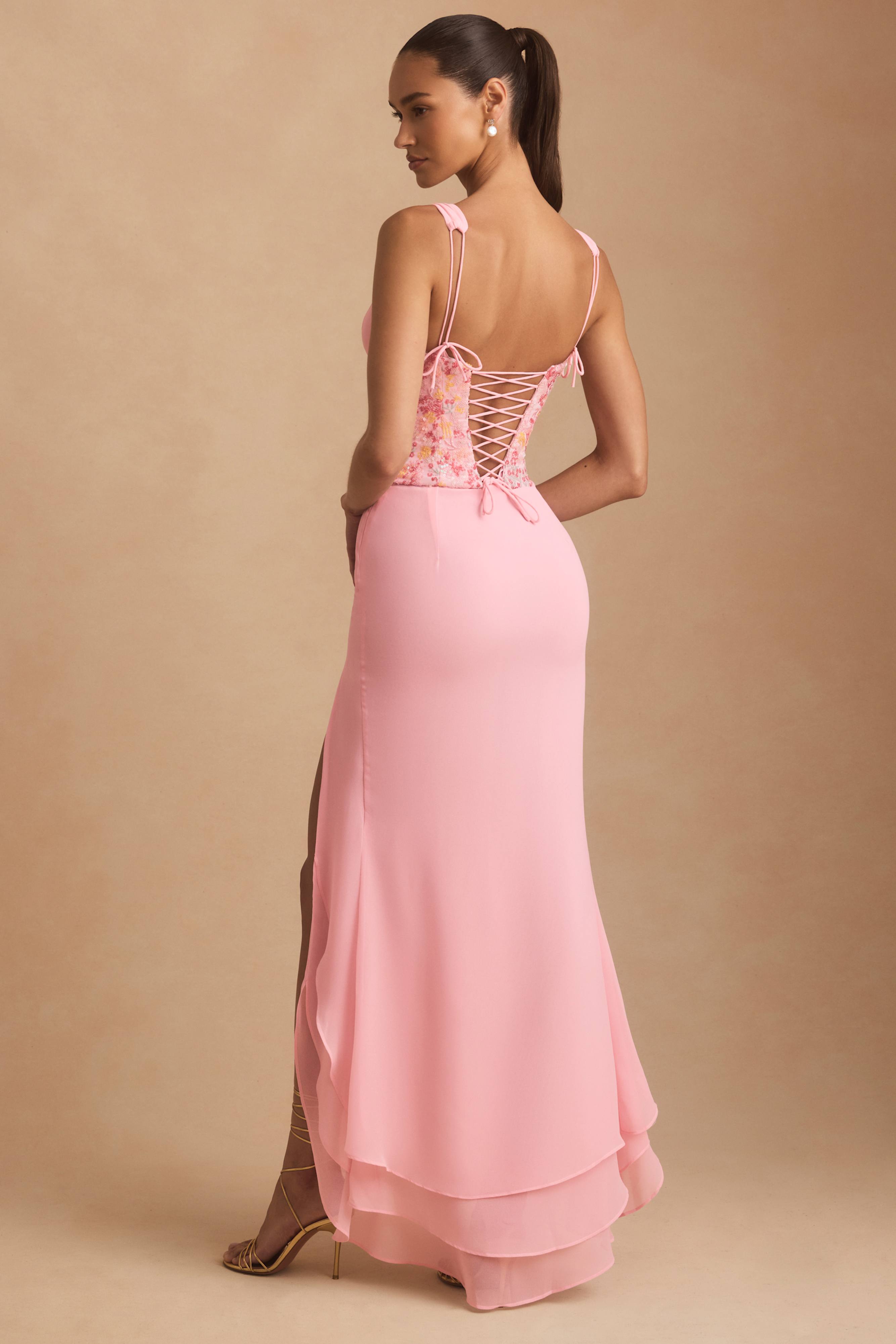 Worth making plans for, the Nathalia maxi dress is cut from lightweight chiffon with a plunging V-neckline, waterfall split hem and statement lace-up back. It’s overlaid with a waist-cinching corset decorated with coral-inspired embellishments that sparkle under spotlights. The rouleau straps are fully adjustable for your perfect fit.