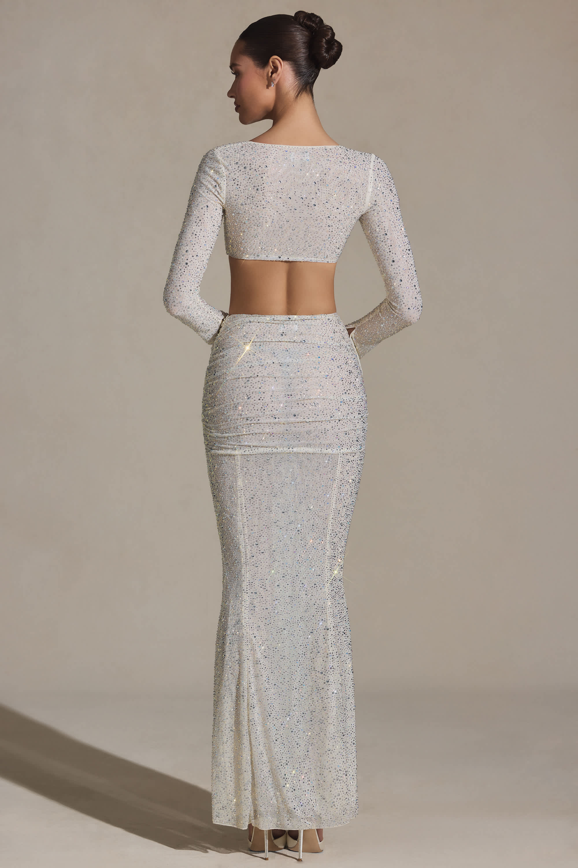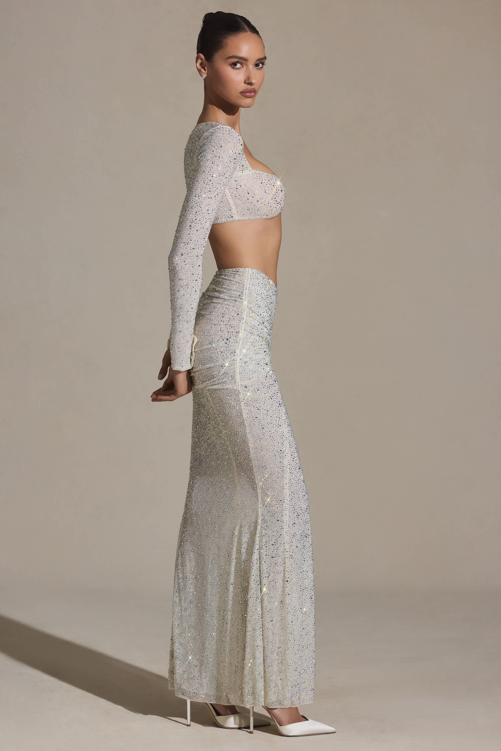 Embellished Ruched Maxi Skirt in White