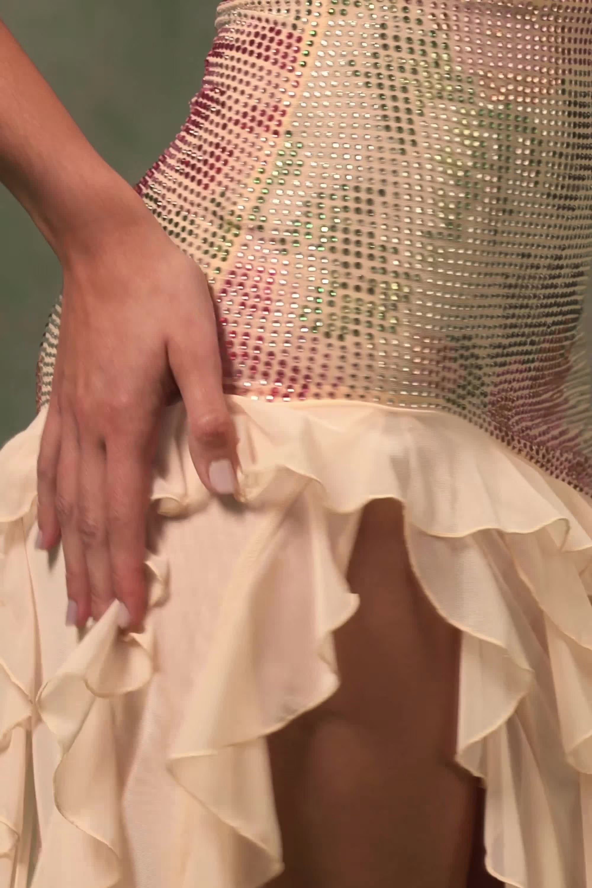 Lovingly crafted with extra-special occasions in mind, the Diletta gown is uplifted with layers of cascading ruffles that create a dynamic look with every step. It’s crafted from lightweight stretch georgette to a figure-skimming column silhouette punctuated with a thigh-high split at the side. The bandeau neckline is anchored with internal silicon taping for a secure fit.
