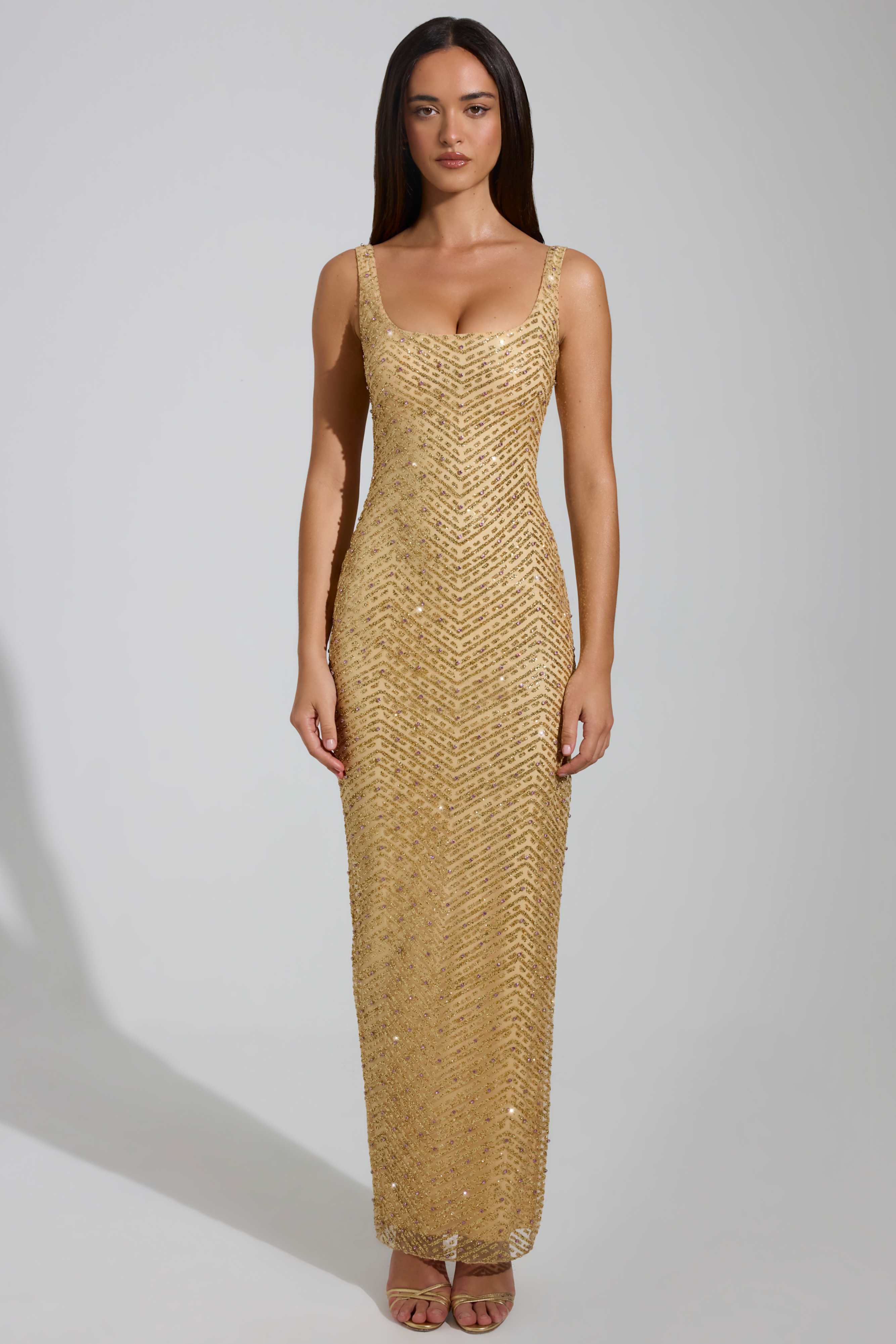 Iconic sparkle from every angle. The Yarina maxi dress is crafted from premium glitter mesh in a chevron design and adorned with contrasting pink diamantés that catch the light. Cut to a flattering scoop neckline with fixed shoulder straps, a thigh-high split, and in a slim silhouette, it's perfect for your most opulent events.