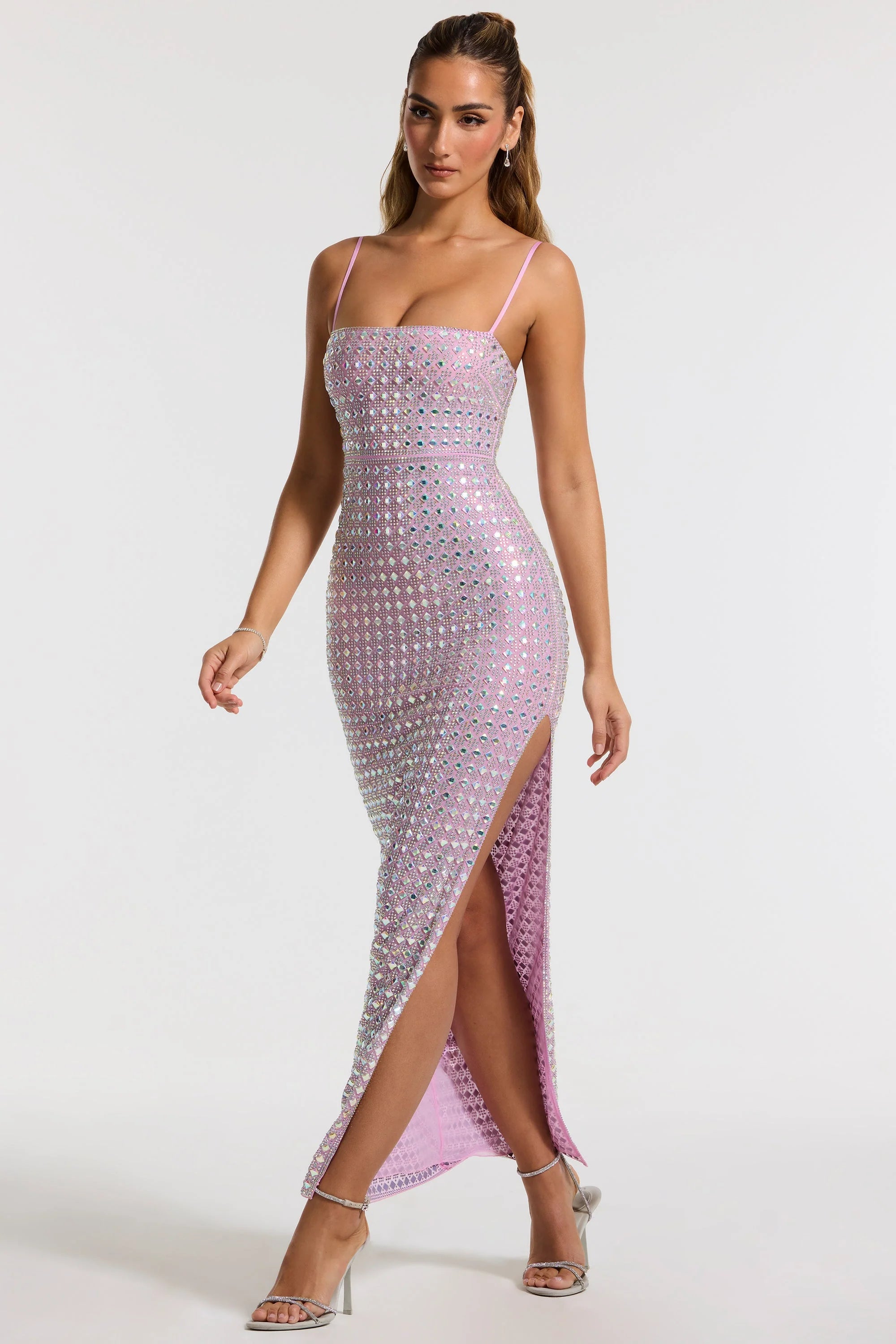 Featuring a low, open back with strappy detailing, a flattering column shape, and a thigh-high side split, our Prisha evening maxi gown was designed for elegant moments. Hand-finished with mirrored detailing, this embellished maxi dress was curated in our ultra-soft, sculpting, stretch mesh fabric for a close yet comfortable fit.
