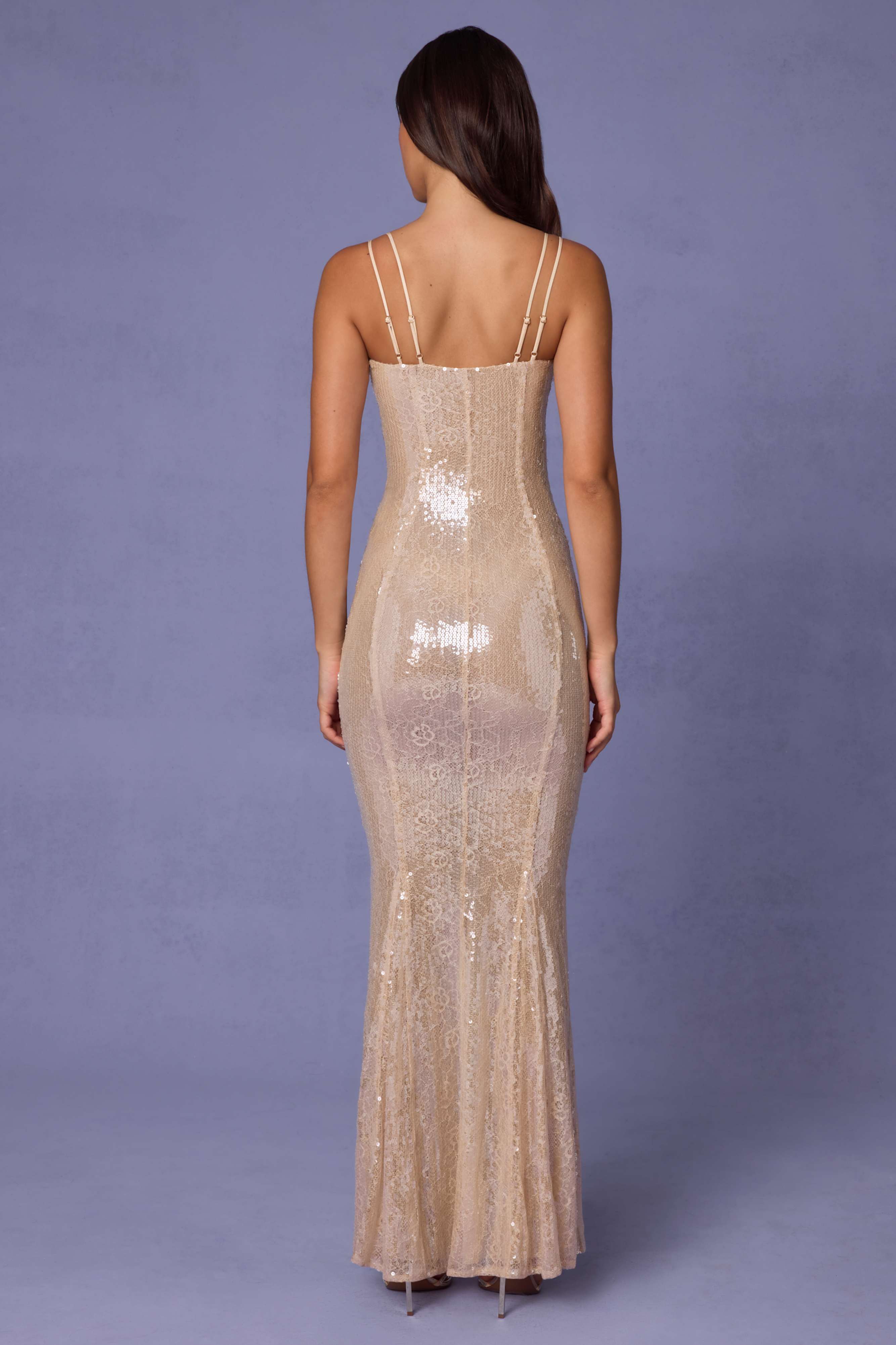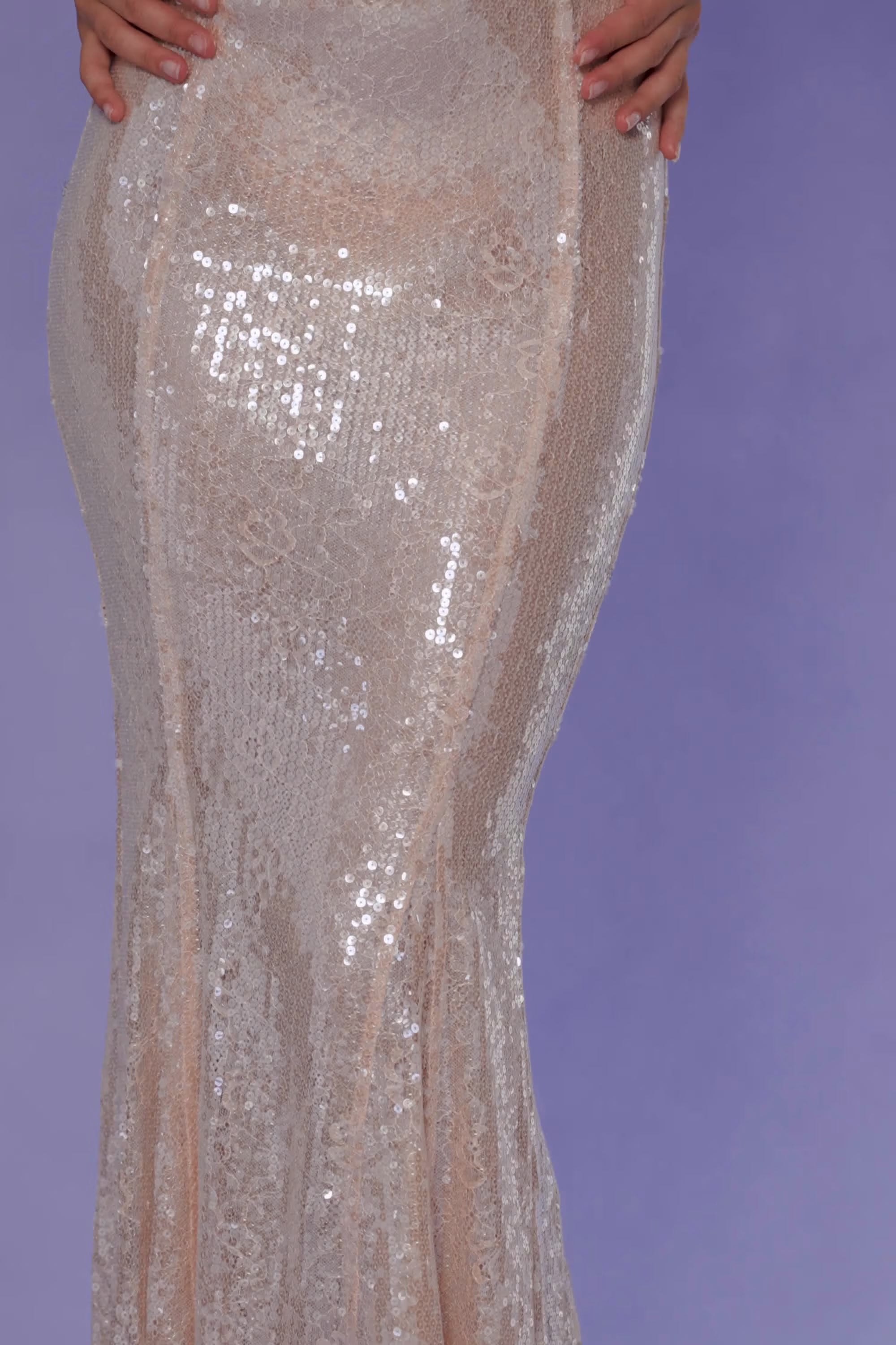 Designed to elevate your most cherished occasions, our Sima gown is crafted from premium sequin lace and lined with our signature power mesh for a sculpted, figure-enhancing fit. Finished with a gently flared hem and delicate godet detailing, it delivers effortless glamour for your biggest nights.