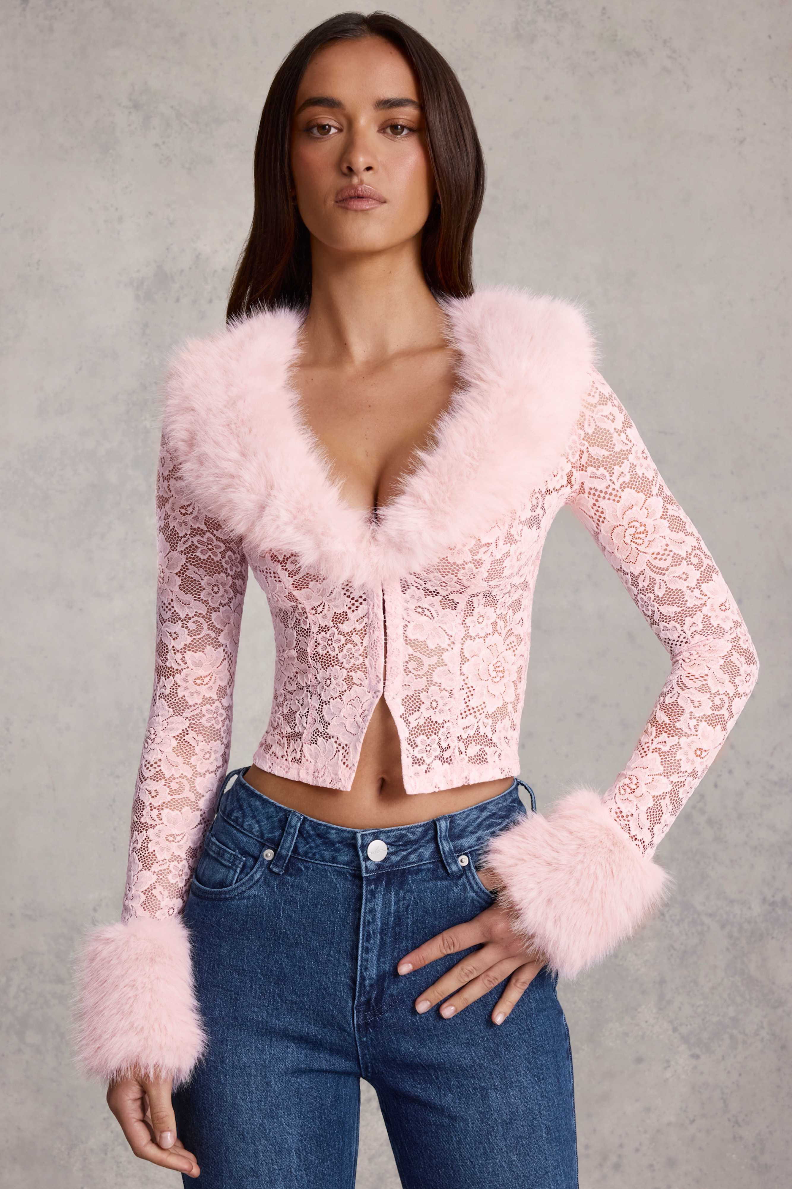 Noemy is here for all your main character moments. Crafted from premium lace with a soft faux-fur collar and cuffs, it's the perfect blend of elegant and bold. Cut to a flirty cropped length with a plunging neckline, hook-and-eye fastening, and split hem detail, it’s made for long walks and late nights in the city.