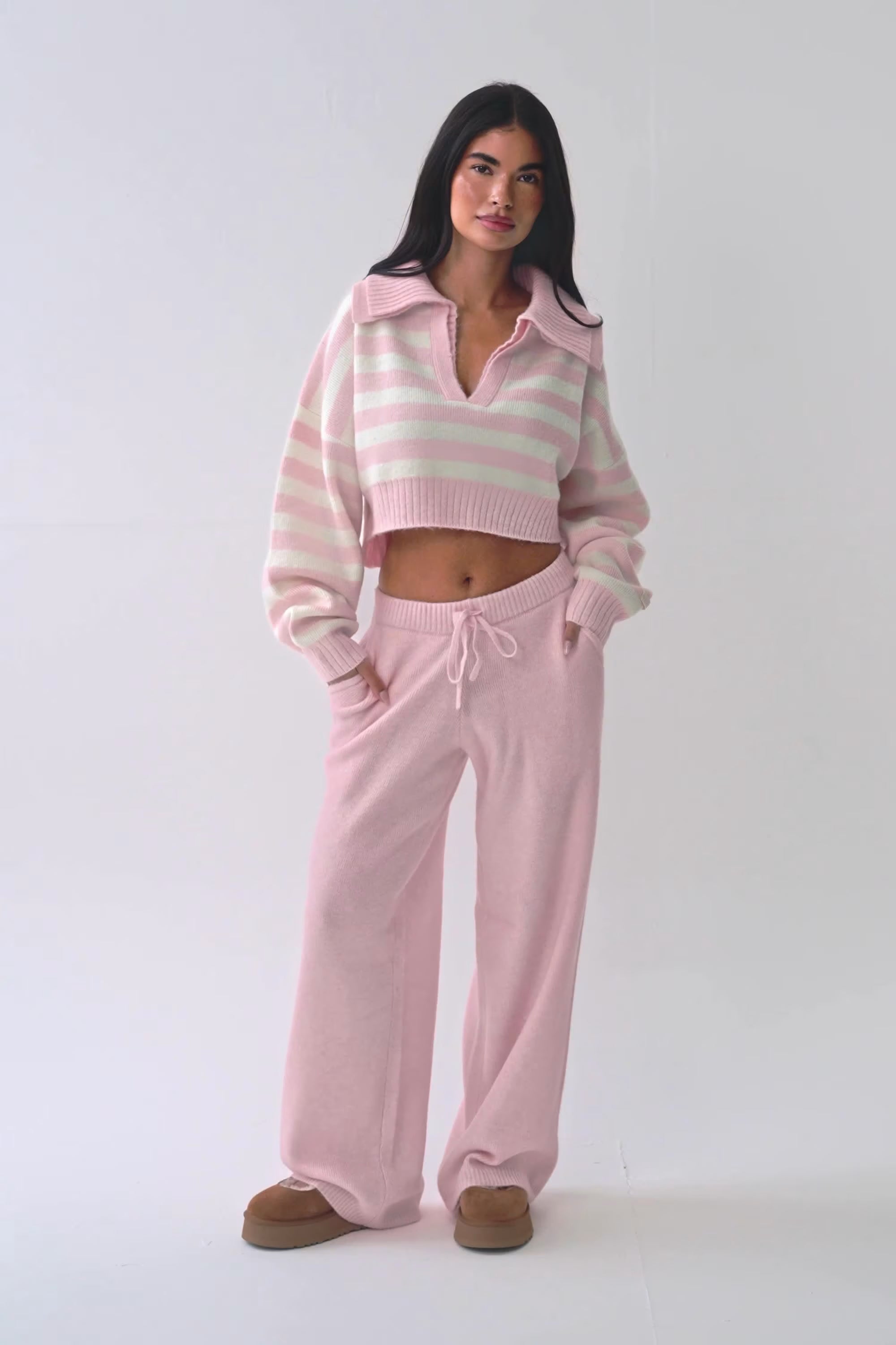 Knit Mid-Rise Wide-Leg Joggers in Soft Pink