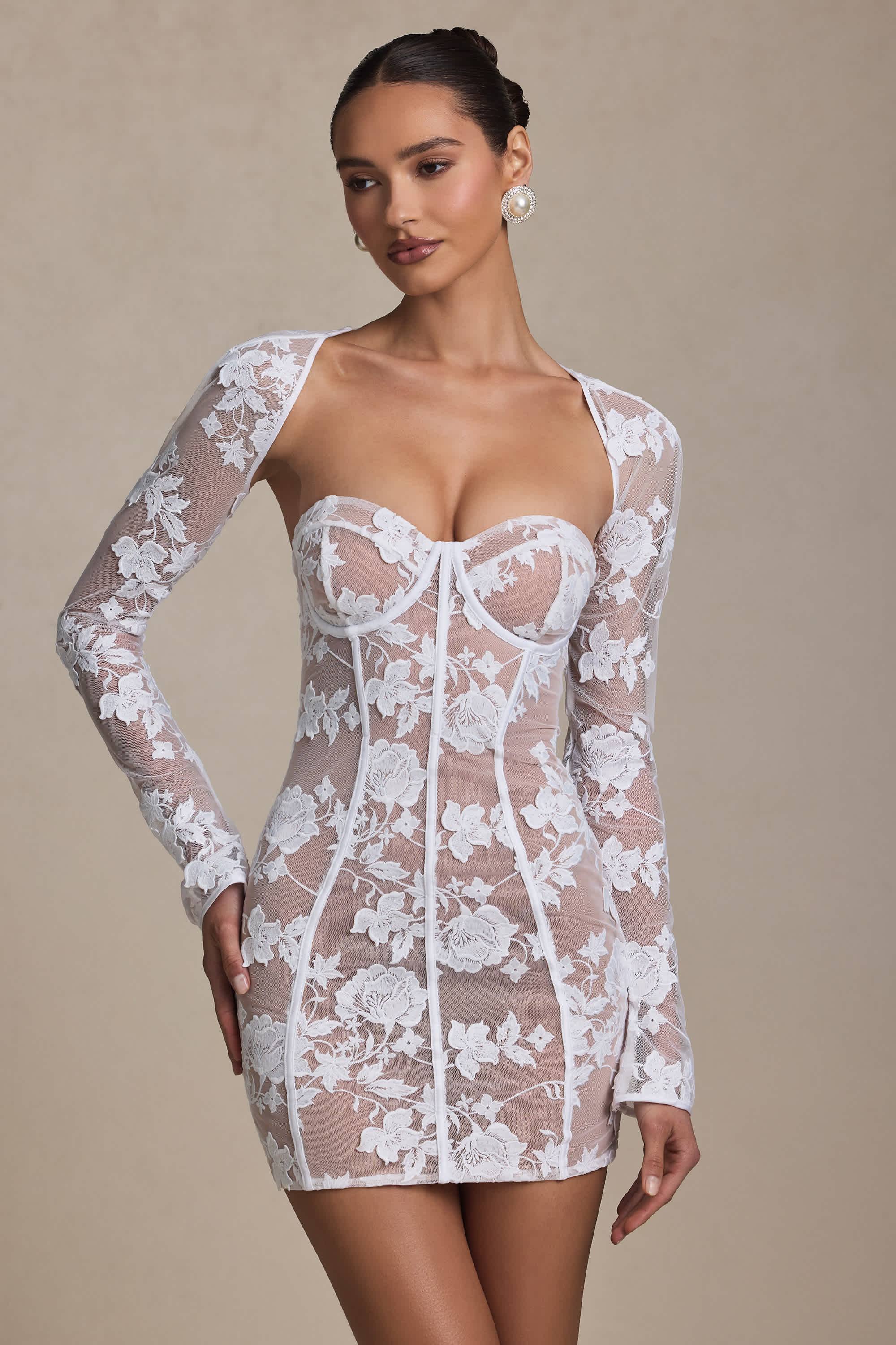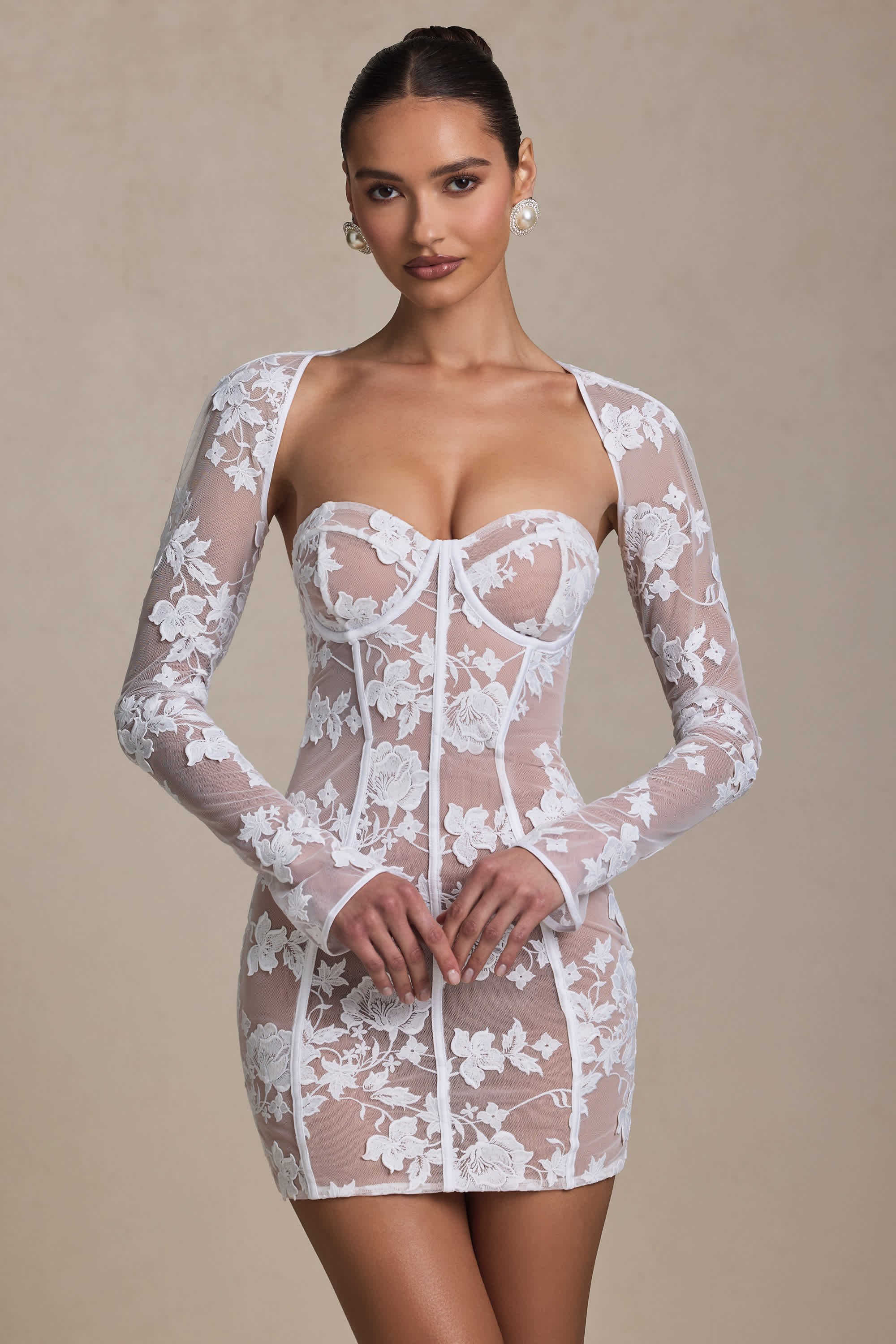 Delicate and dreamy, meet the Andreia mini dress. Crafted from premium 20D mesh and satin to a figure-hugging silhouette, it’s overlaid with delicate lace-inspired floral embroidery. It’s elevated with a cupped sweetheart neckline for enhanced support, long fitted sleeves and an adjustable lace-up panel at the back for your perfect fit.