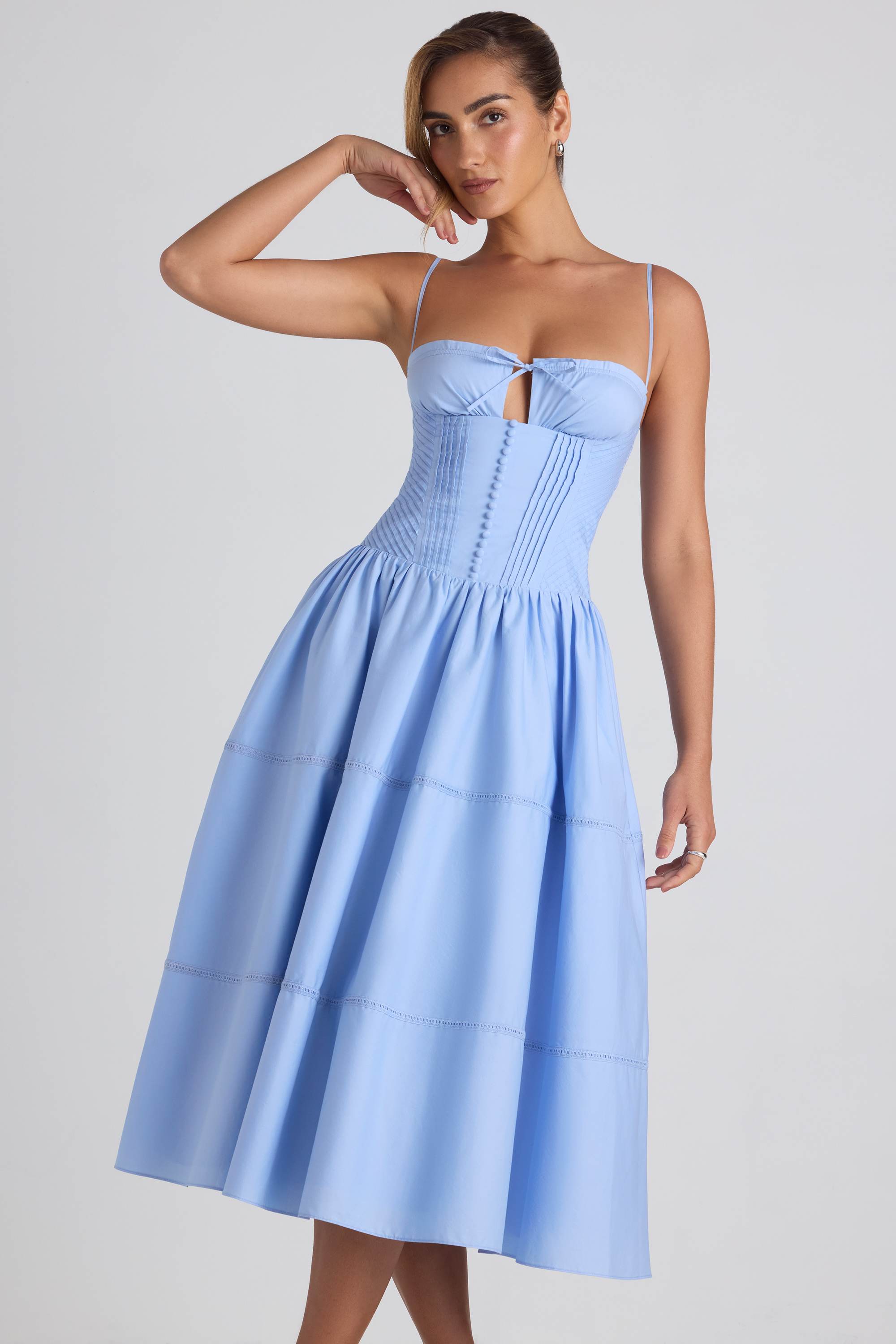 Lace-Trim Pintucked Poplin Midaxi Dress in Sky Blue