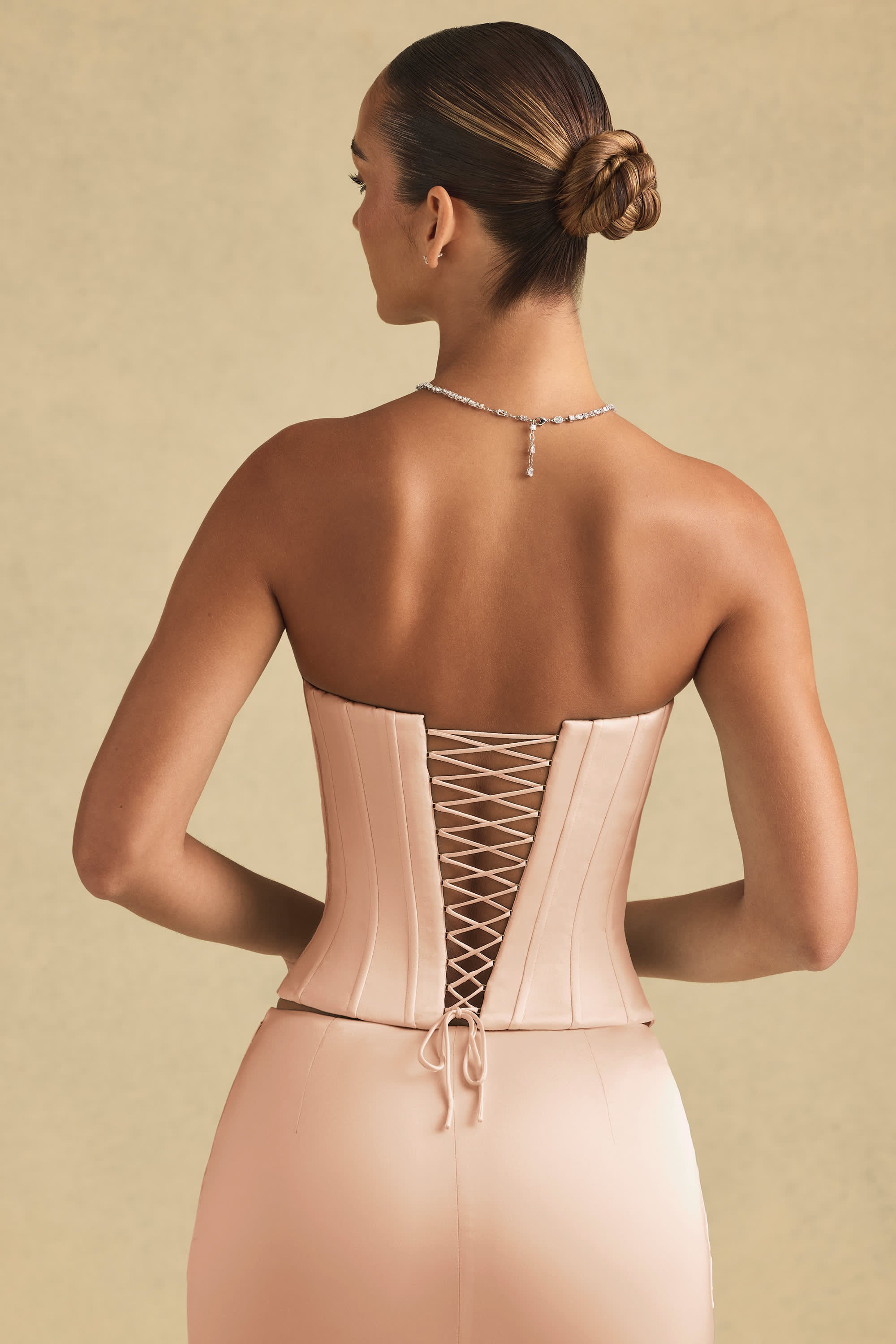 A figure-defining style thatโs perfect for styling this season and beyond, the Araminta corset top is crafted from premium satin to a boned silhouette for enhanced support and shaping. Framed with a sweetheart neckline, it features a curved hem, moulded cups, and an open back complete with adjustable lace-up detailing for your perfect fit.