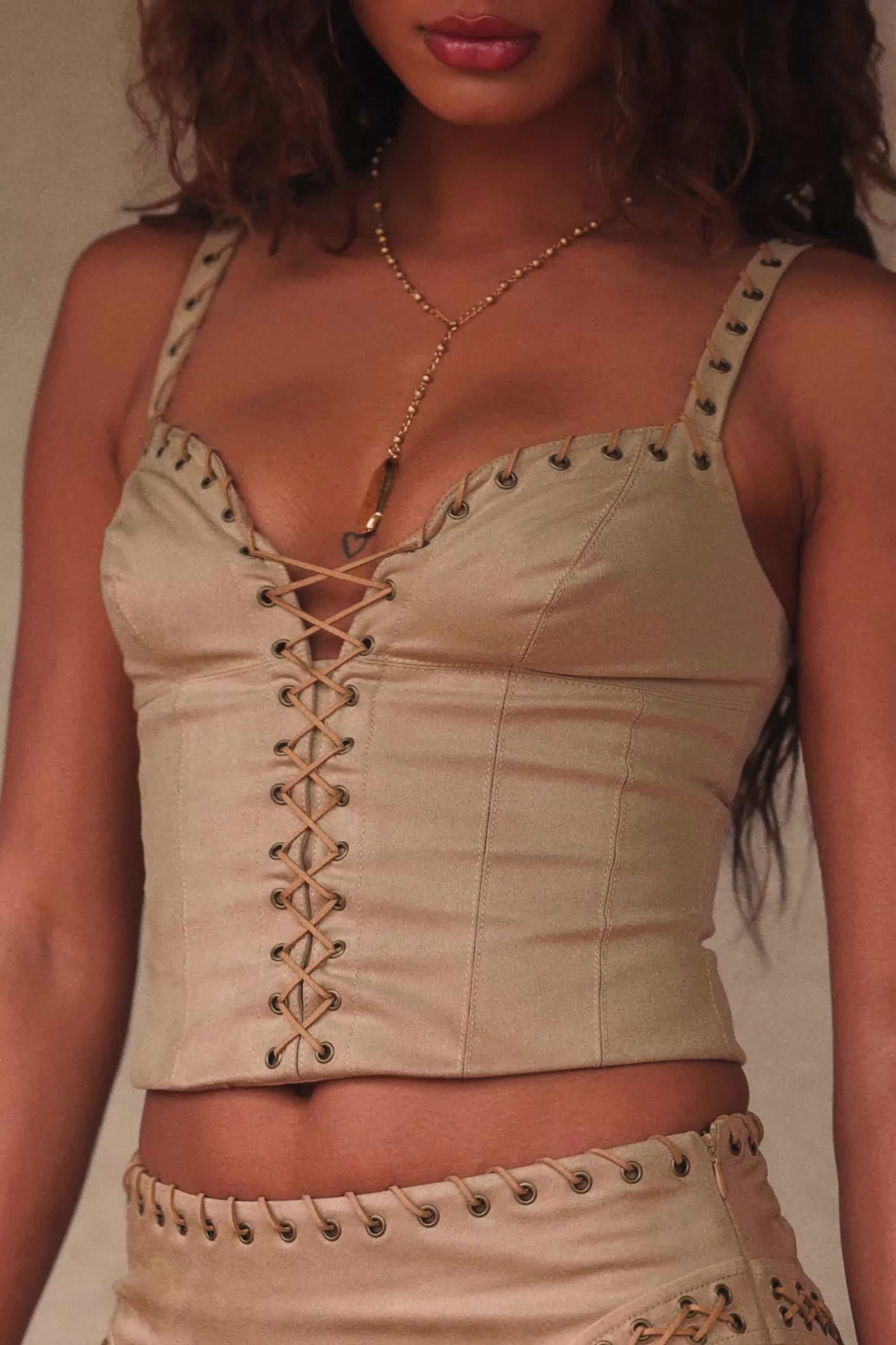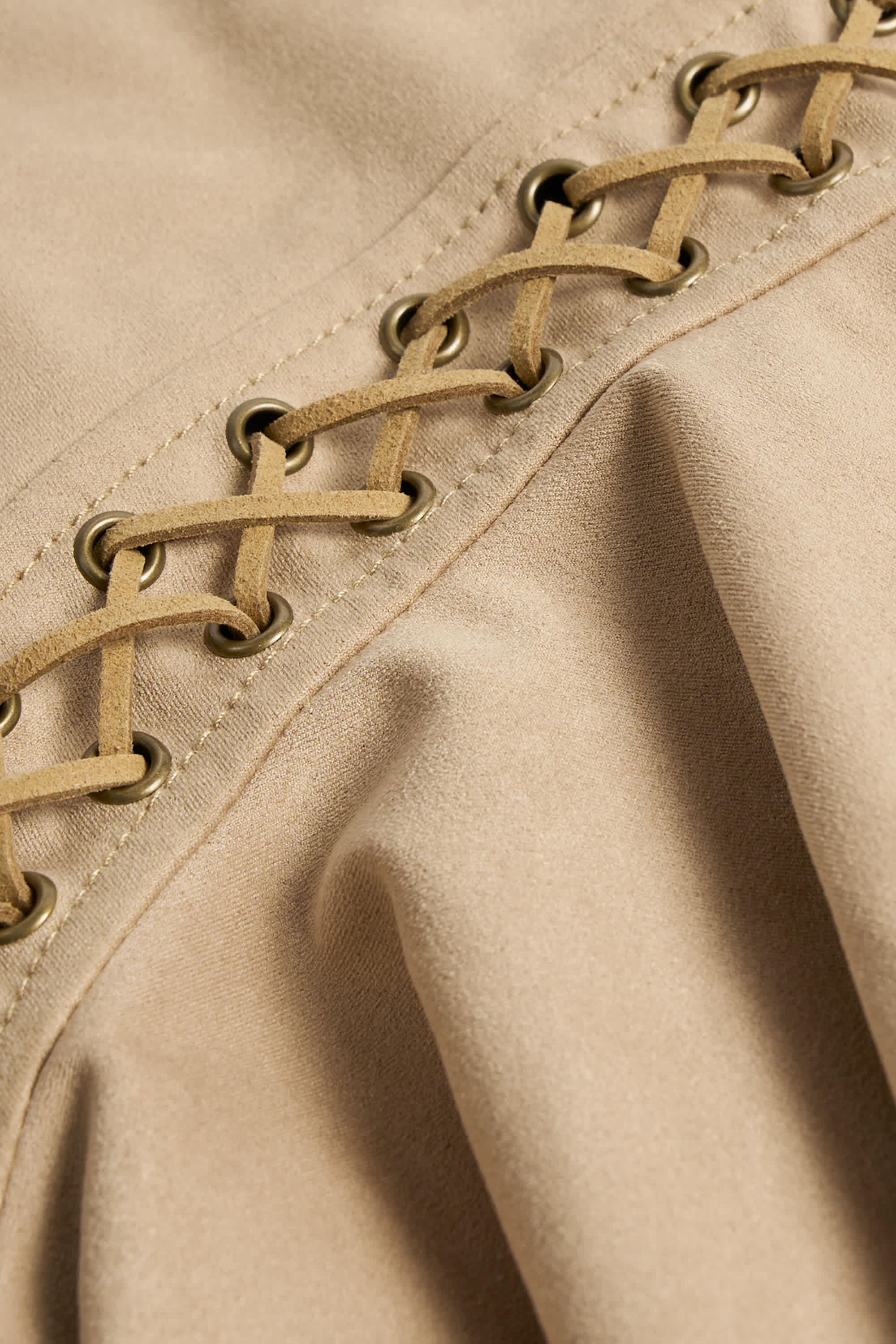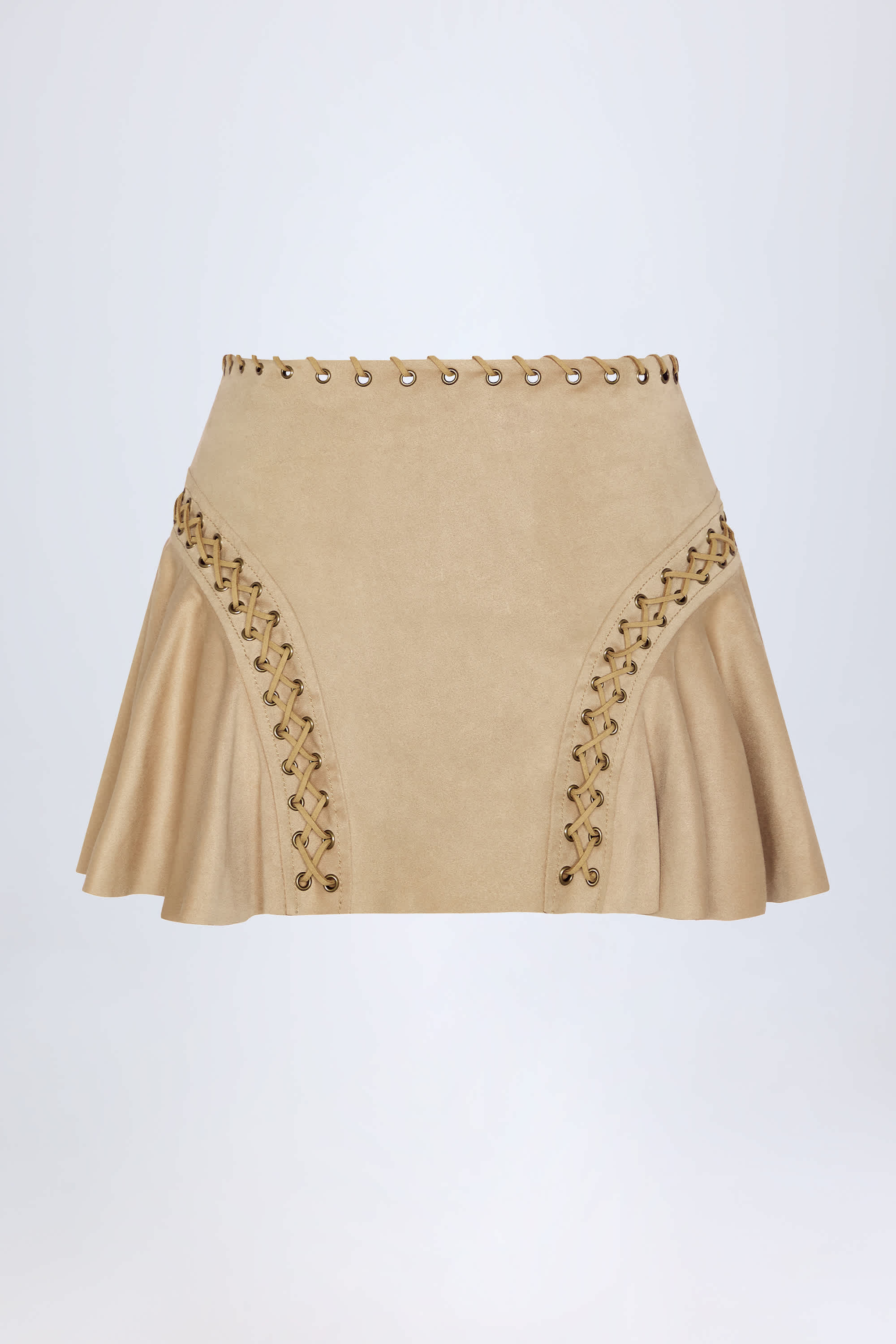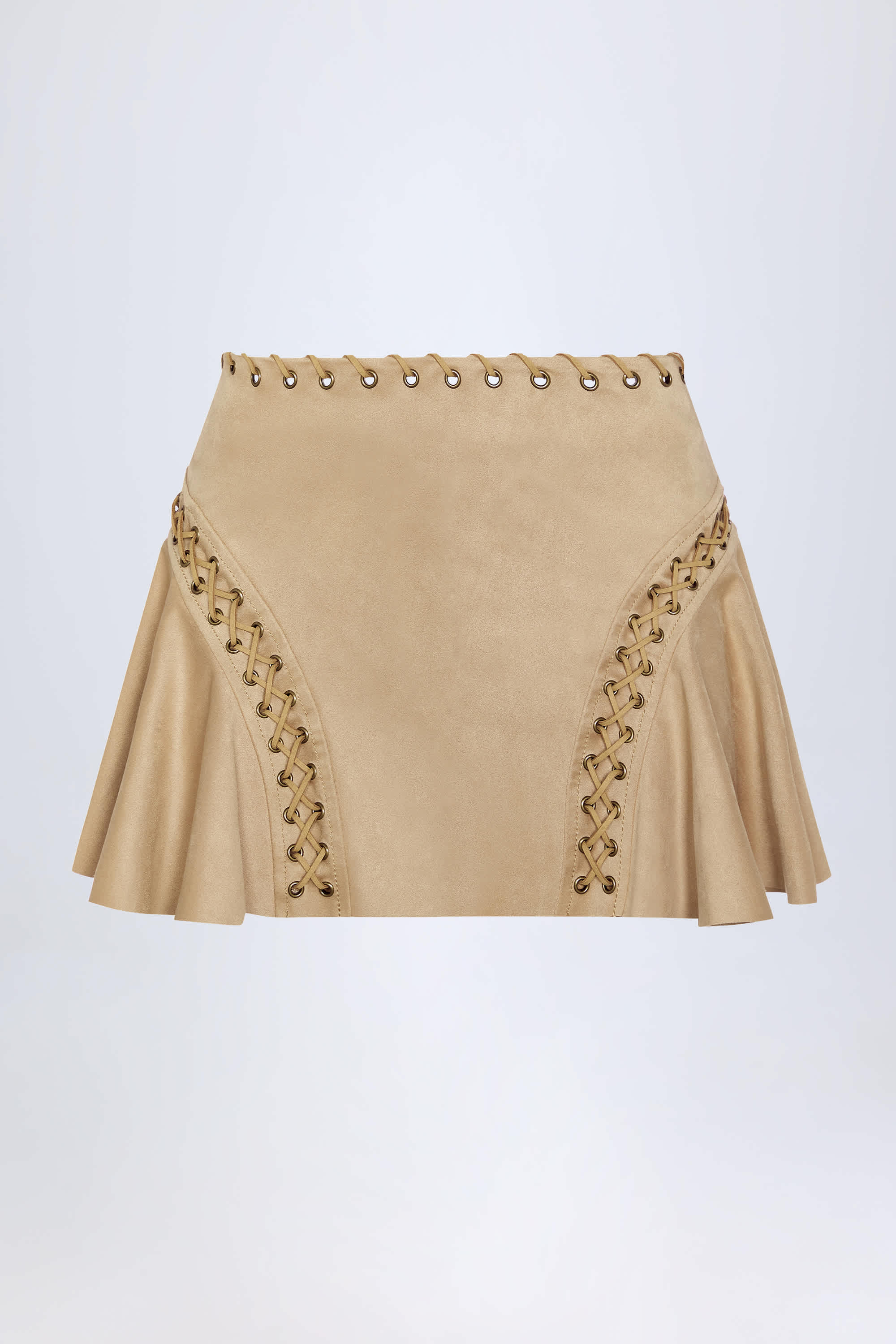 Lace-Up Mid-Rise Mini Skirt in Tan