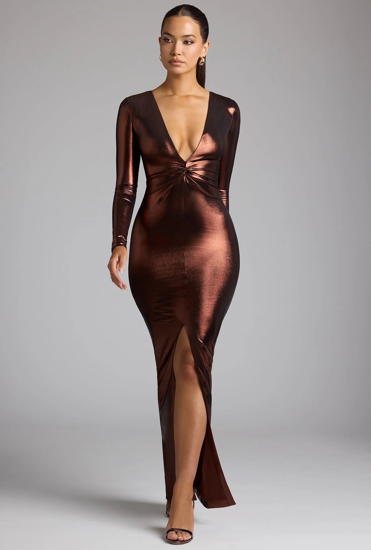 Long Sleeve Metallic Jersey Evening Gown in Copper Bronze