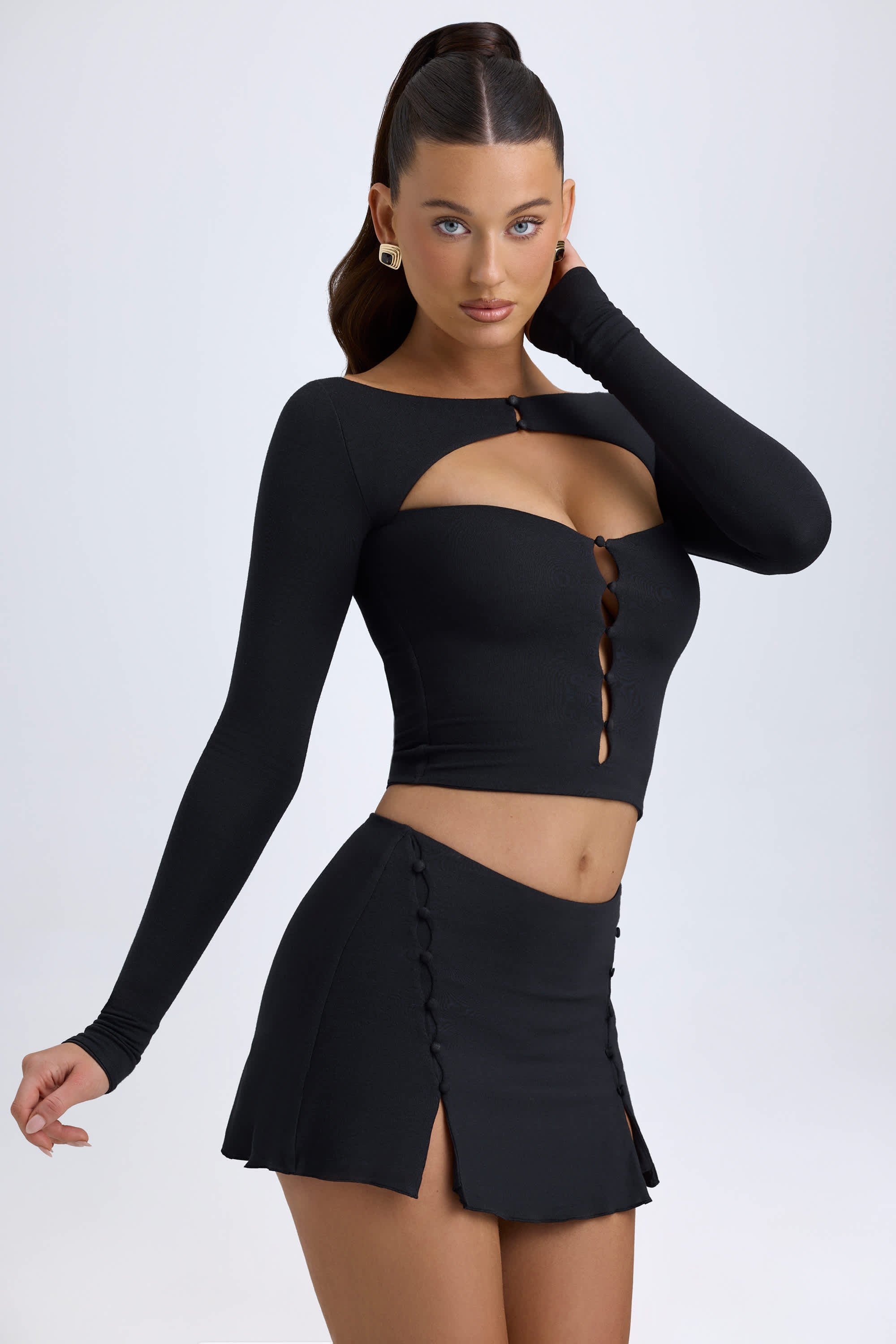 Chic co-ords. Perfect for pairing with a tonal top from the collection, the Dalla A-line mini skirt is crafted from buttery soft and breathable jersey made with TENCEL™ Modal fibres derived from controlled or certified wood sources. Designed for a low-rise fit, it’s spliced with two symmetric splits and traced with asymmetric fabric-covered buttons on either side.