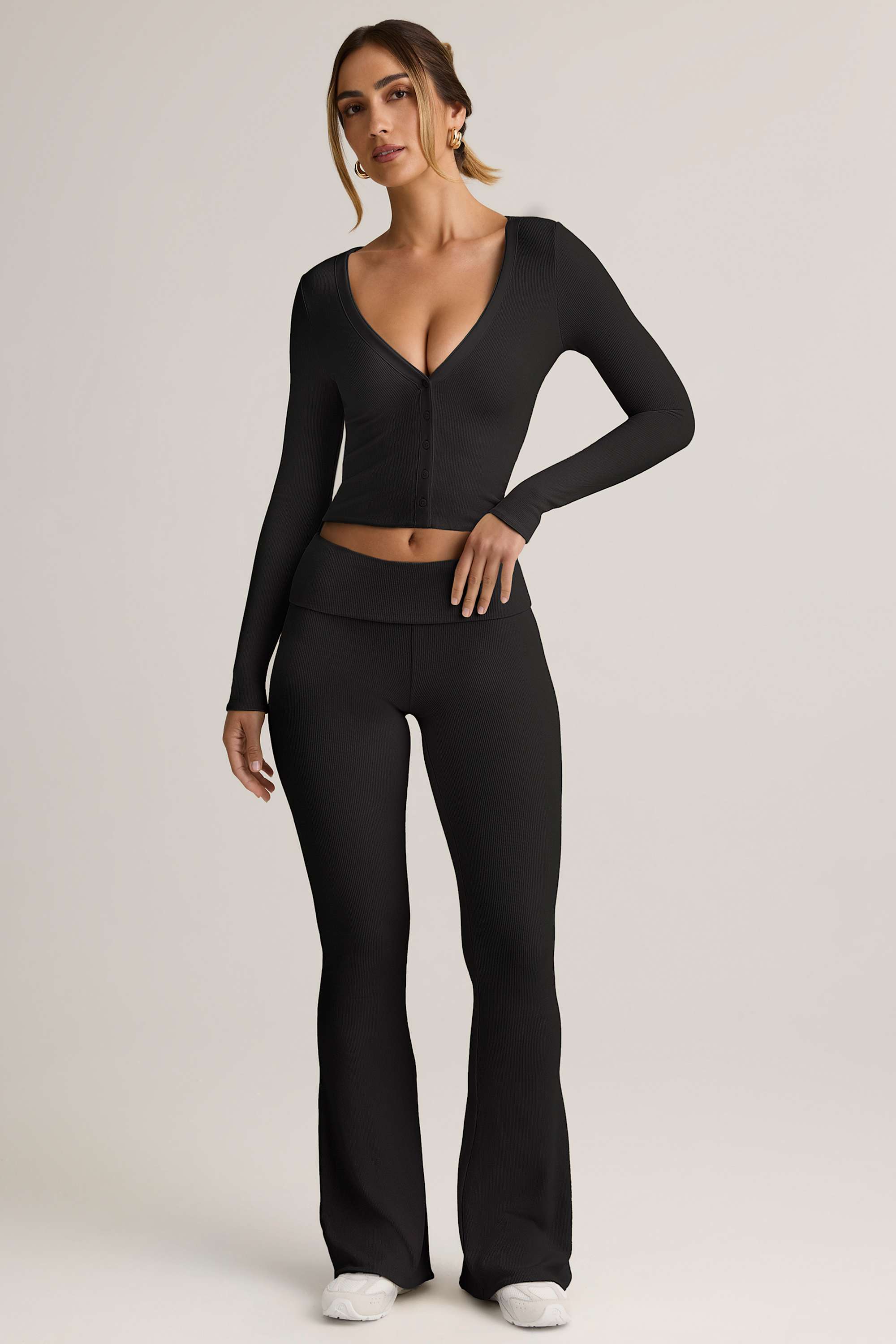 Modal Ribbed Foldover Flared Trousers in Black