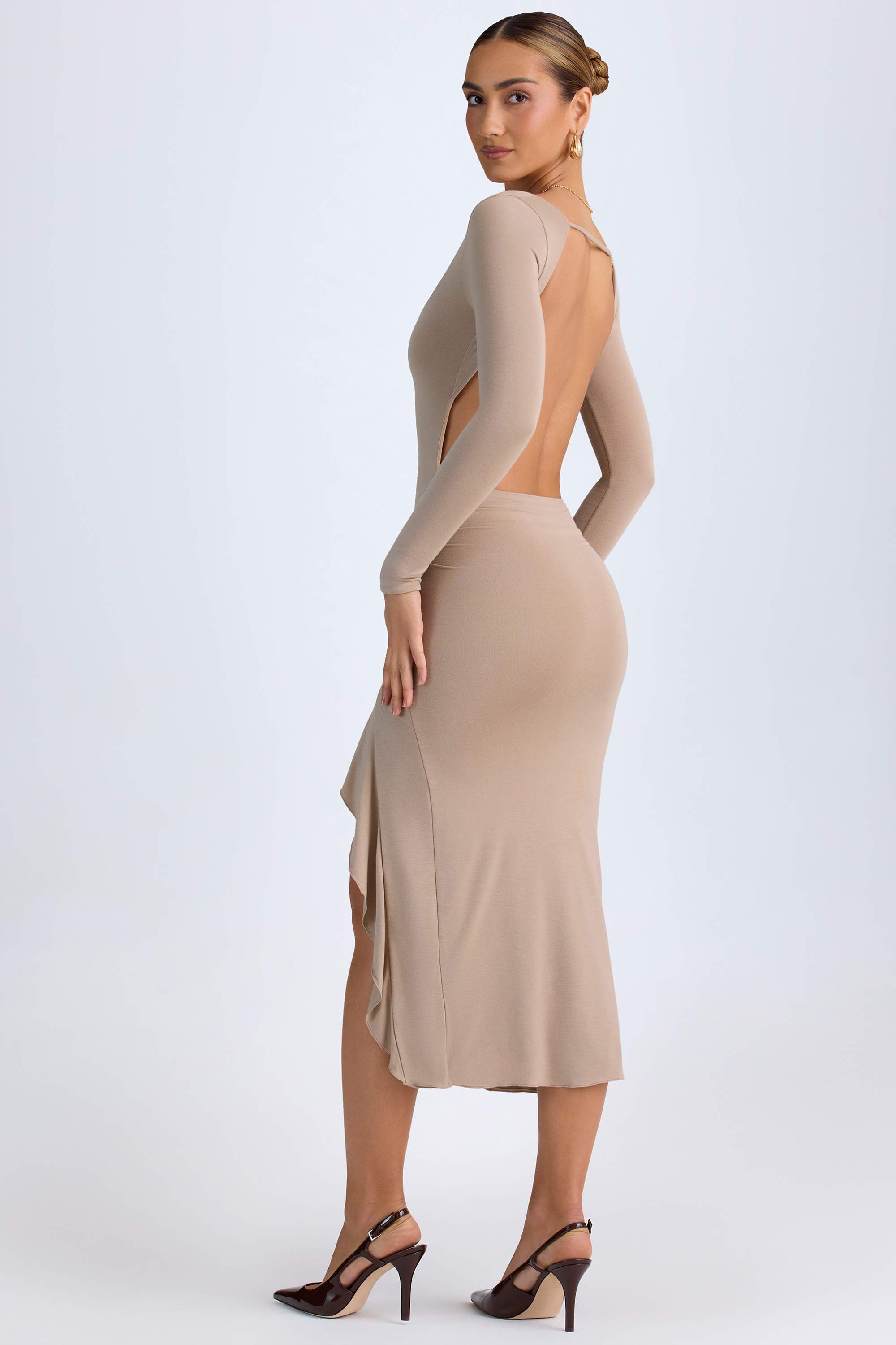 Understated glamour. Perfect for date nights and evening plans, the Tarai midaxi dress is crafted from buttery soft, breathable and stretchy jersey made with TENCEL™ Modal fibres derived from controlled or certified wood sources. It’s cut to a figure-skimming fit with a flattering waterfall ruffle trim at one side and features a statement open back, complete with an adjustable strap for your perfect fit.