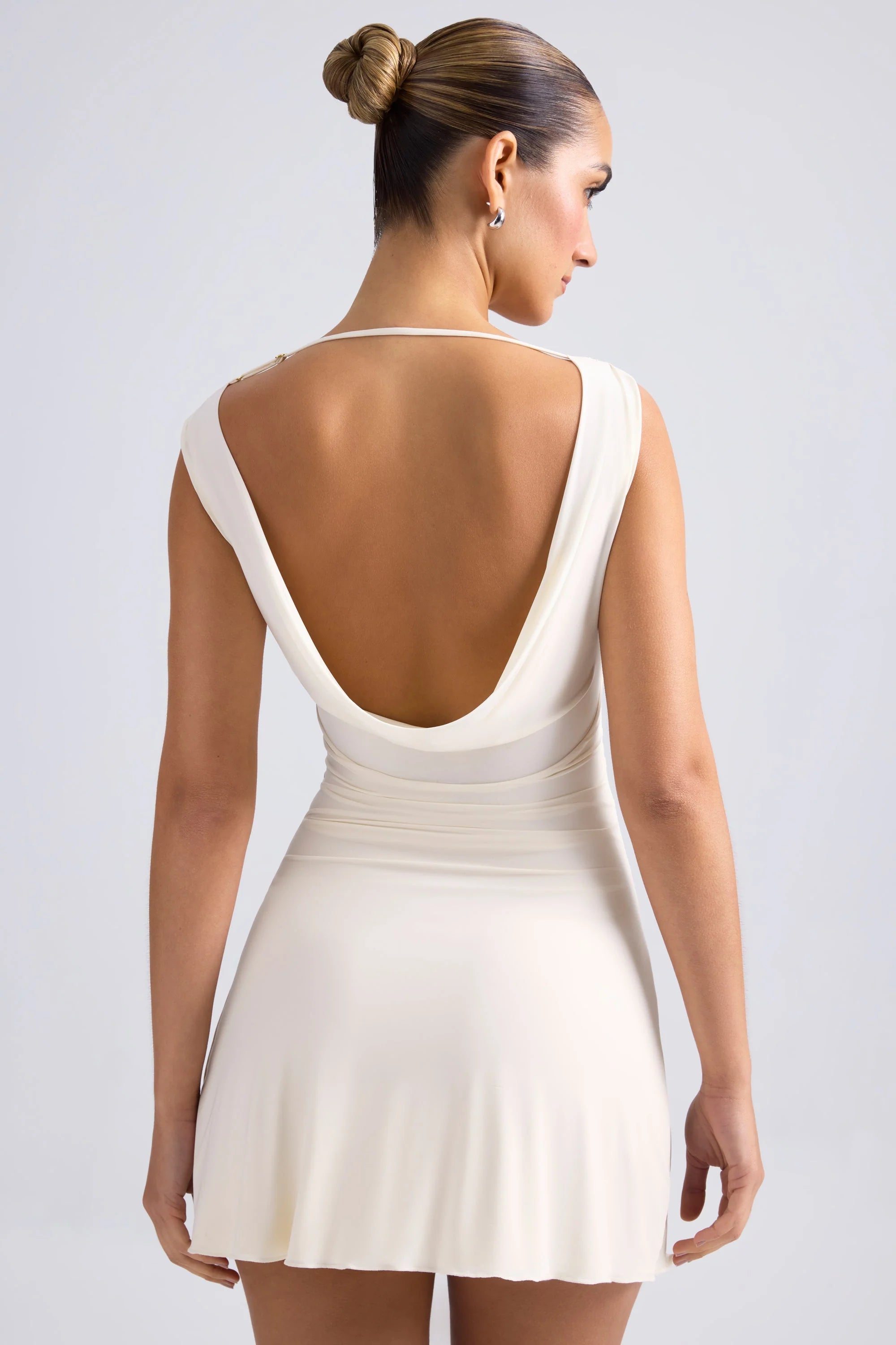 Capturing the essence of endless nights, the Tigen mini dress is rendered in two summery hues. It’s cut from our premium sheer jersey fabric to a subtle A-line silhouette with off-shoulder cap sleeves and enhanced with precisely placed ruching at the waist. It turns to reveal a low cut-out back with draped cowl detailing.