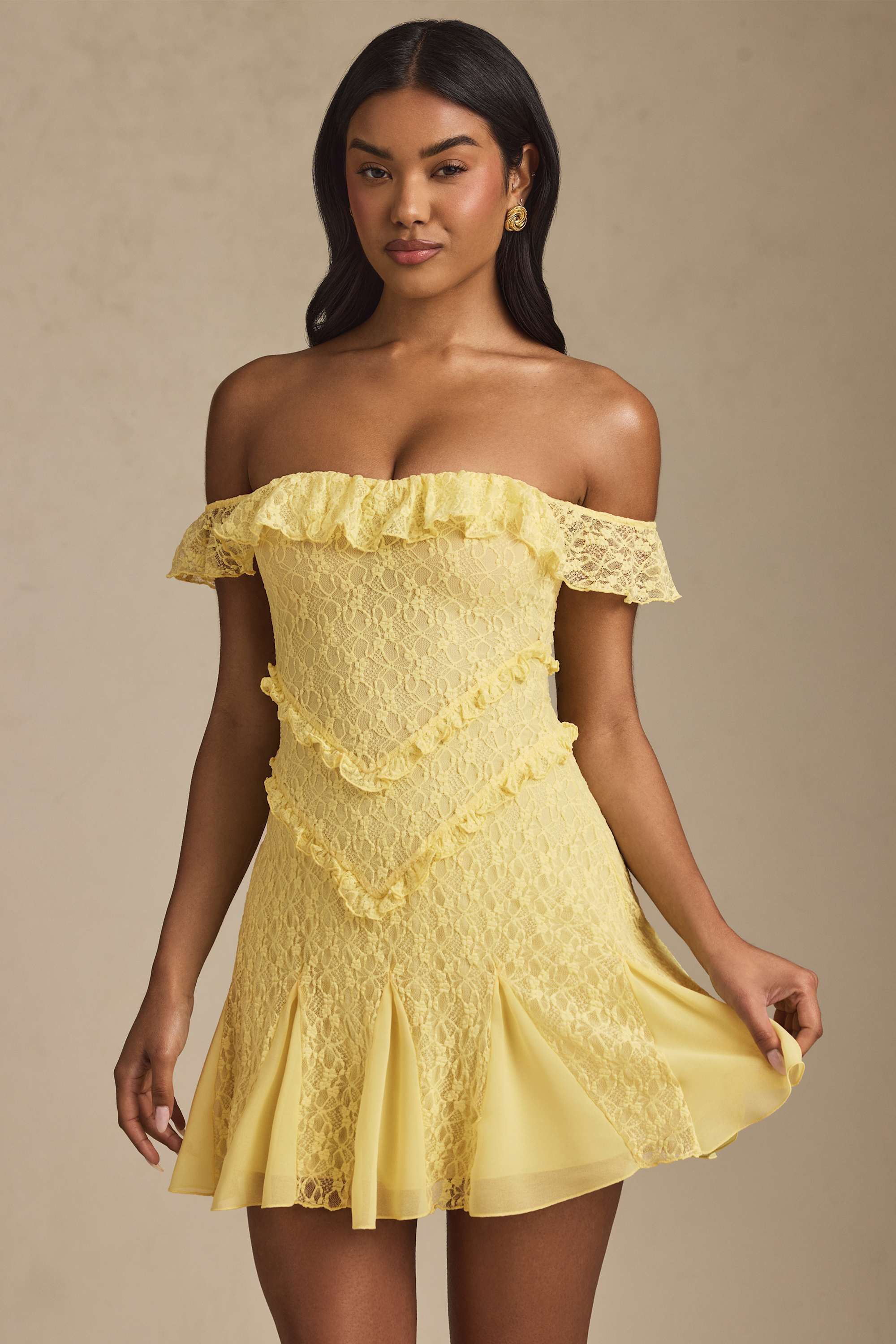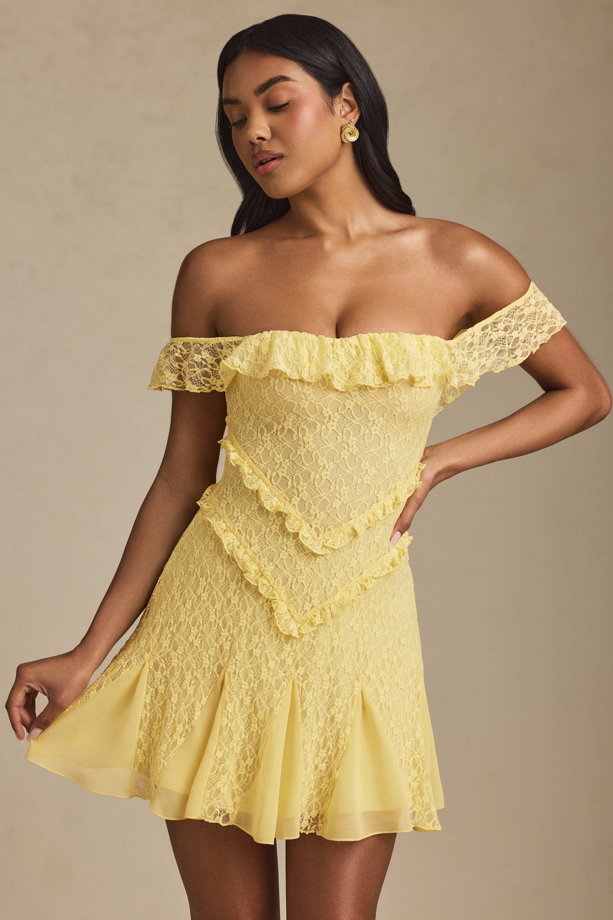 Off-Shoulder Lace A-Line Mini Dress in Pastel Yellow