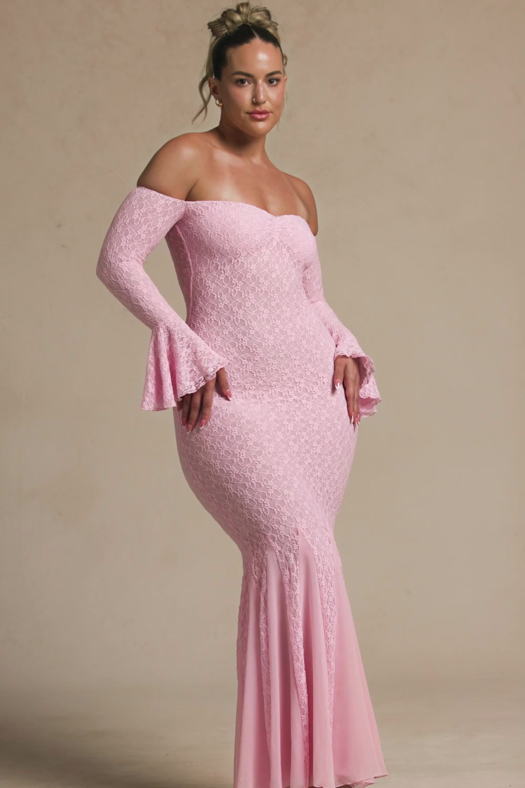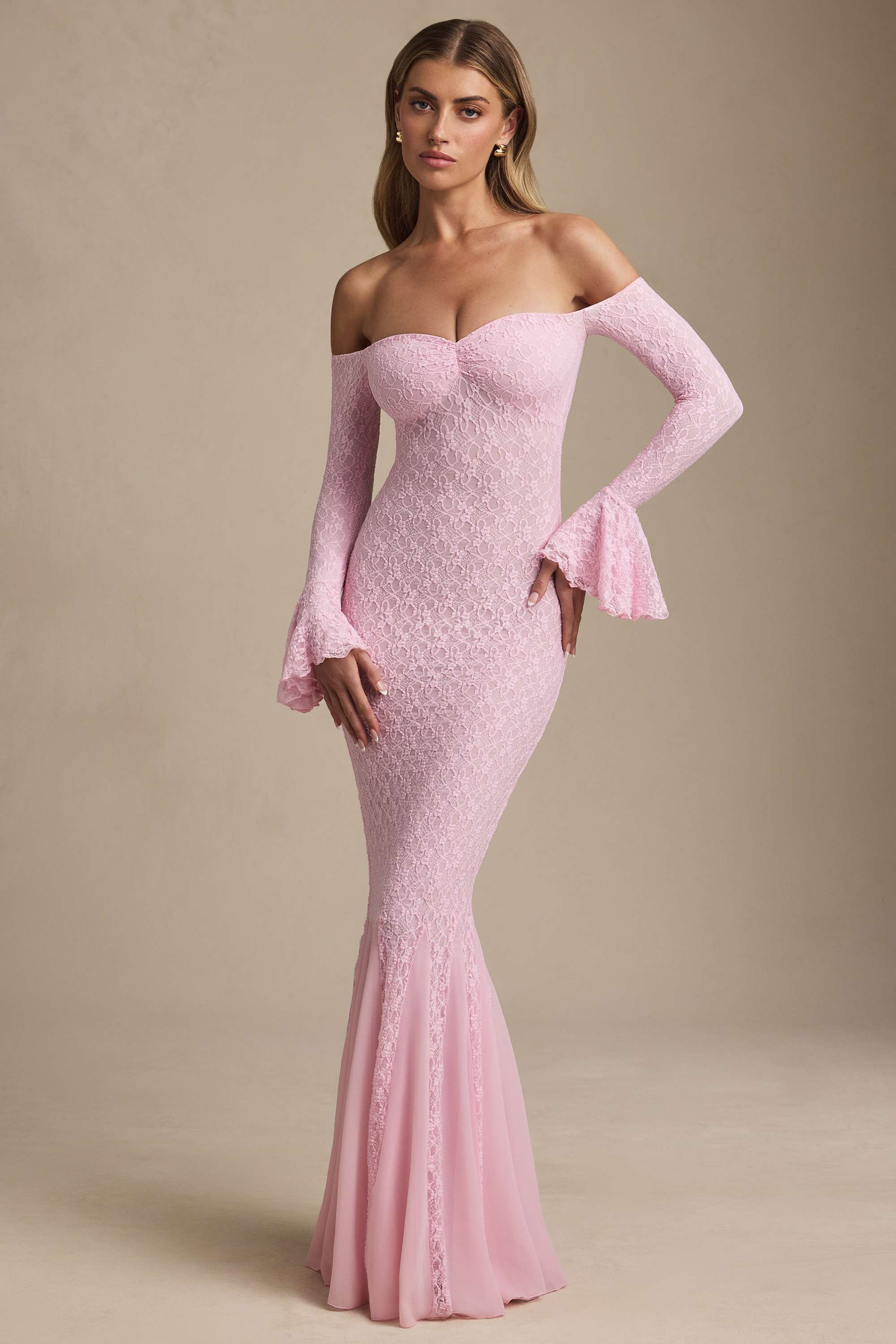 Off-Shoulder Ruffle Lace Maxi Dress in Soft Pink
