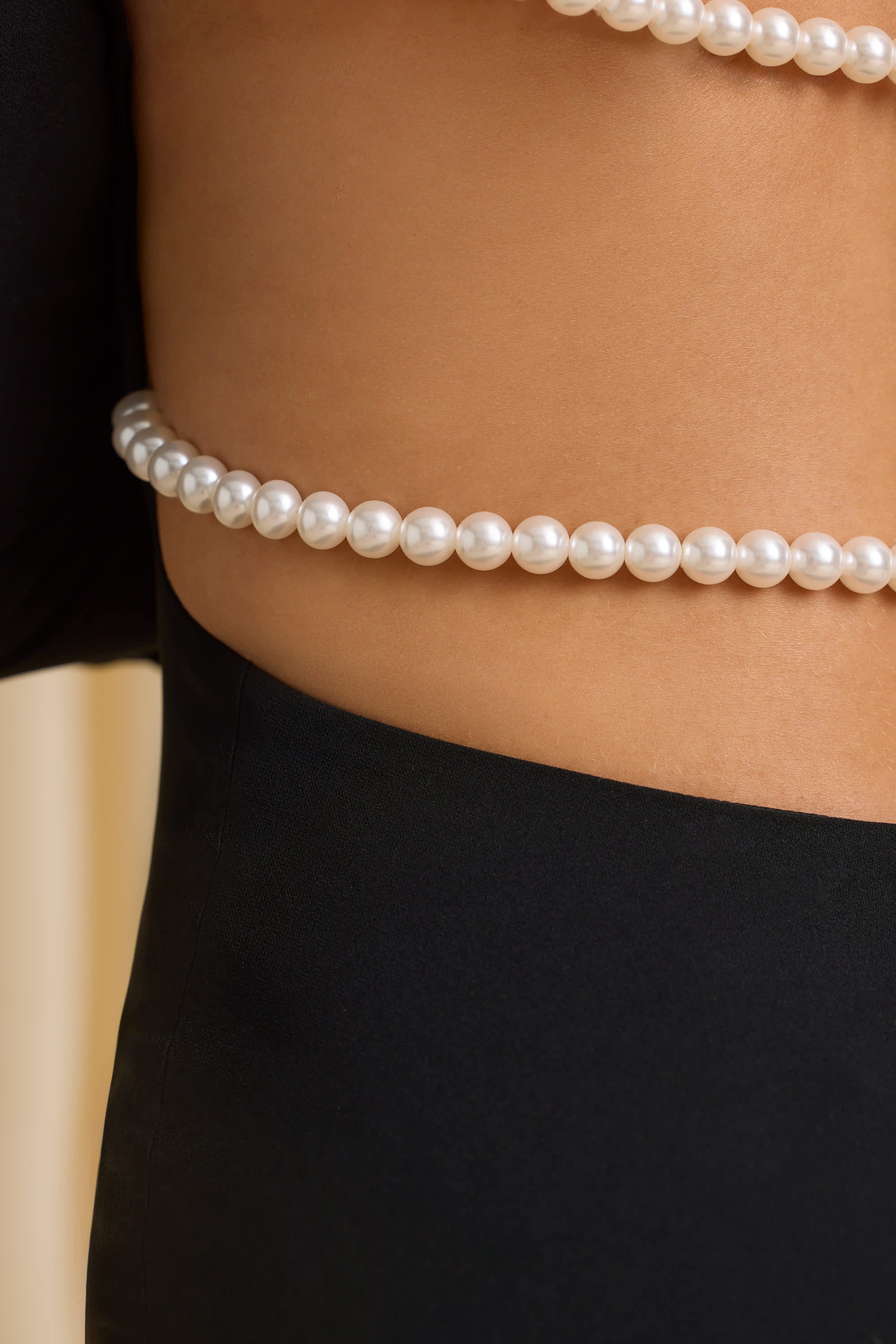 Your party wardrobe just got an upgrade, thanks to our Akari mini dress. Crafted from premium stretch woven fabric that sculpts to your shape and lined with lightweight stretch satin, it’s cut to a signature bodycon silhouette framed with long flared sleeves and a cut-out back detailed with two rows of lustrous faux pearls, cementing the decadent aesthetic of the collection.