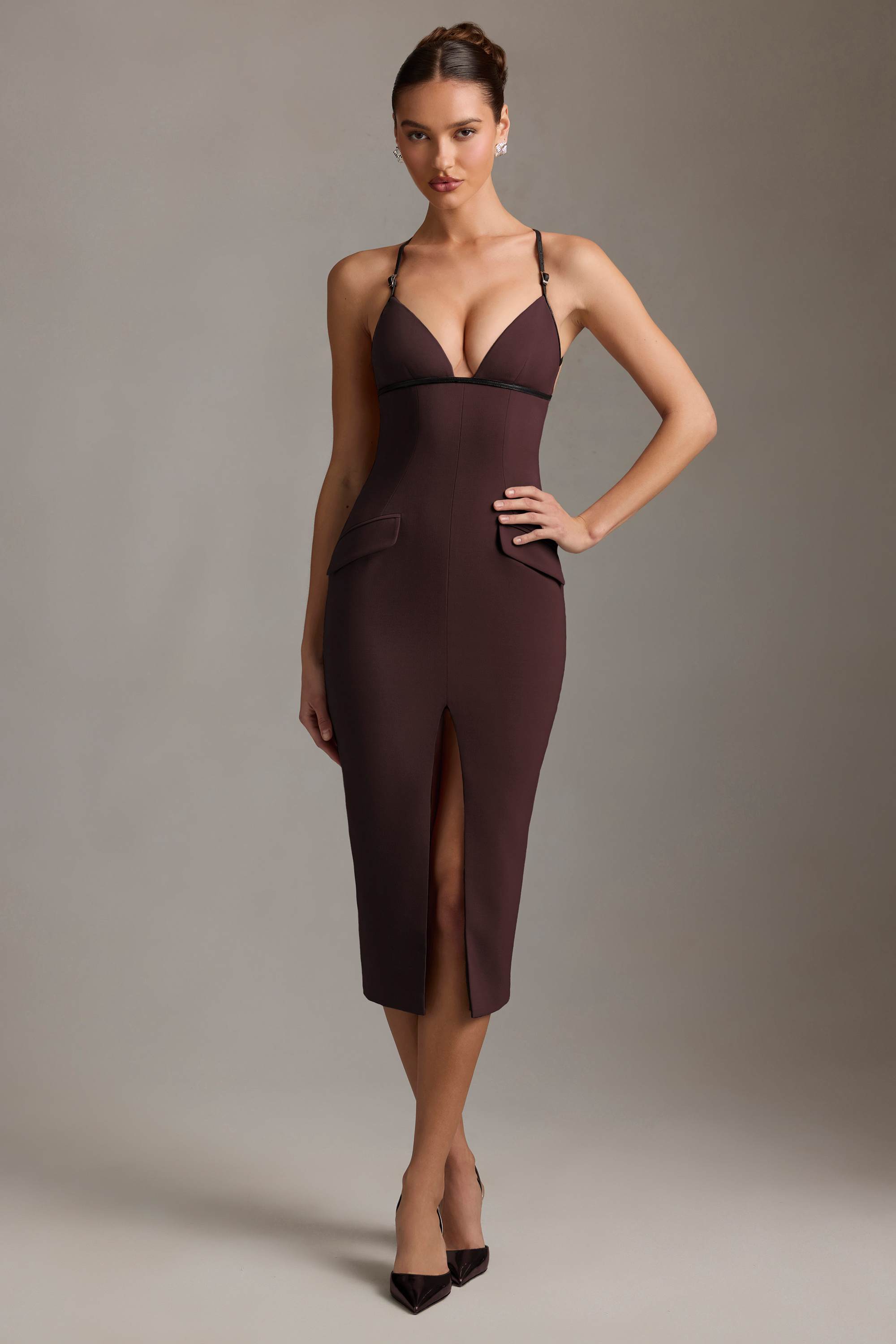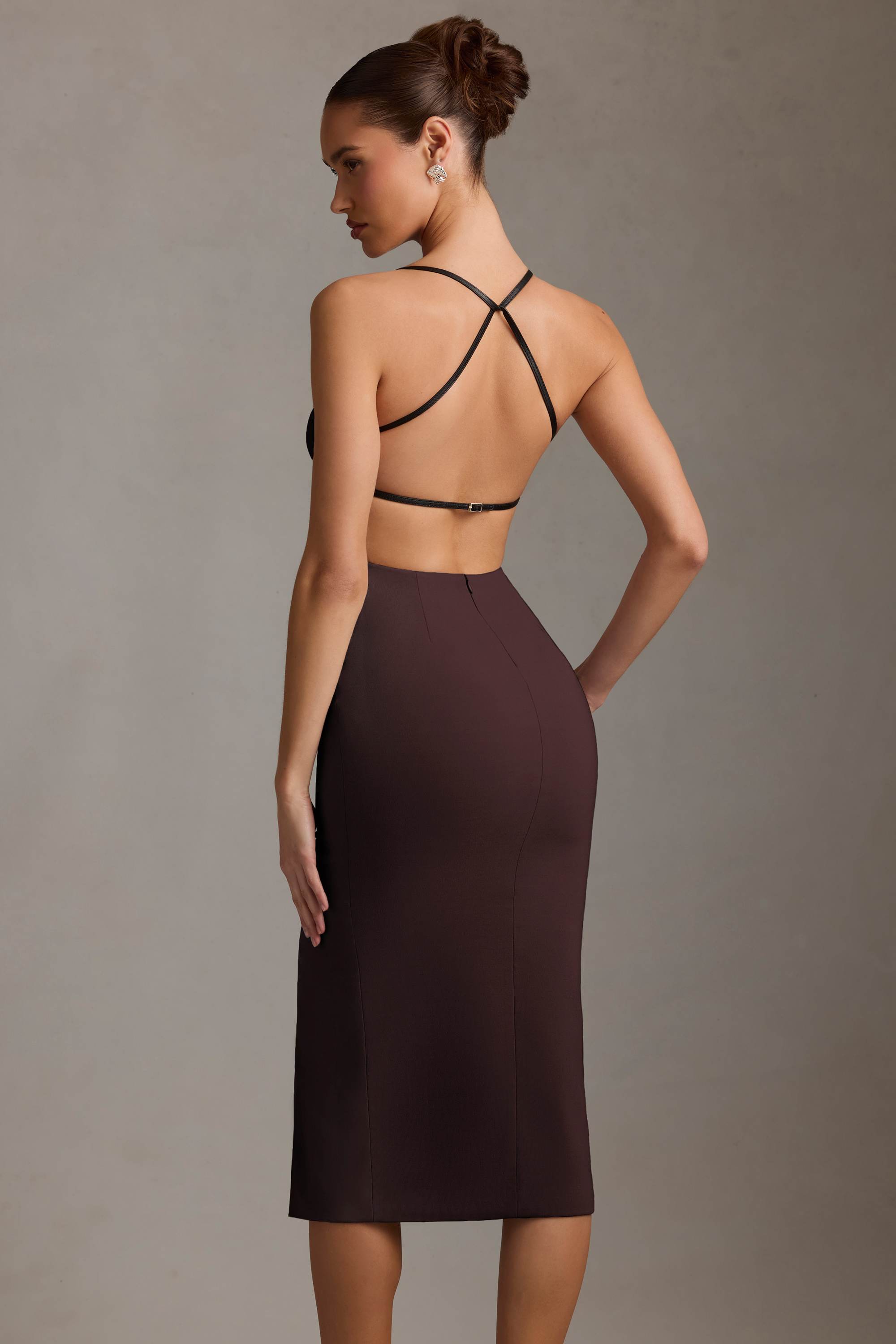 Plunge-Neck Backless Midaxi Dress in Chocolate Brown