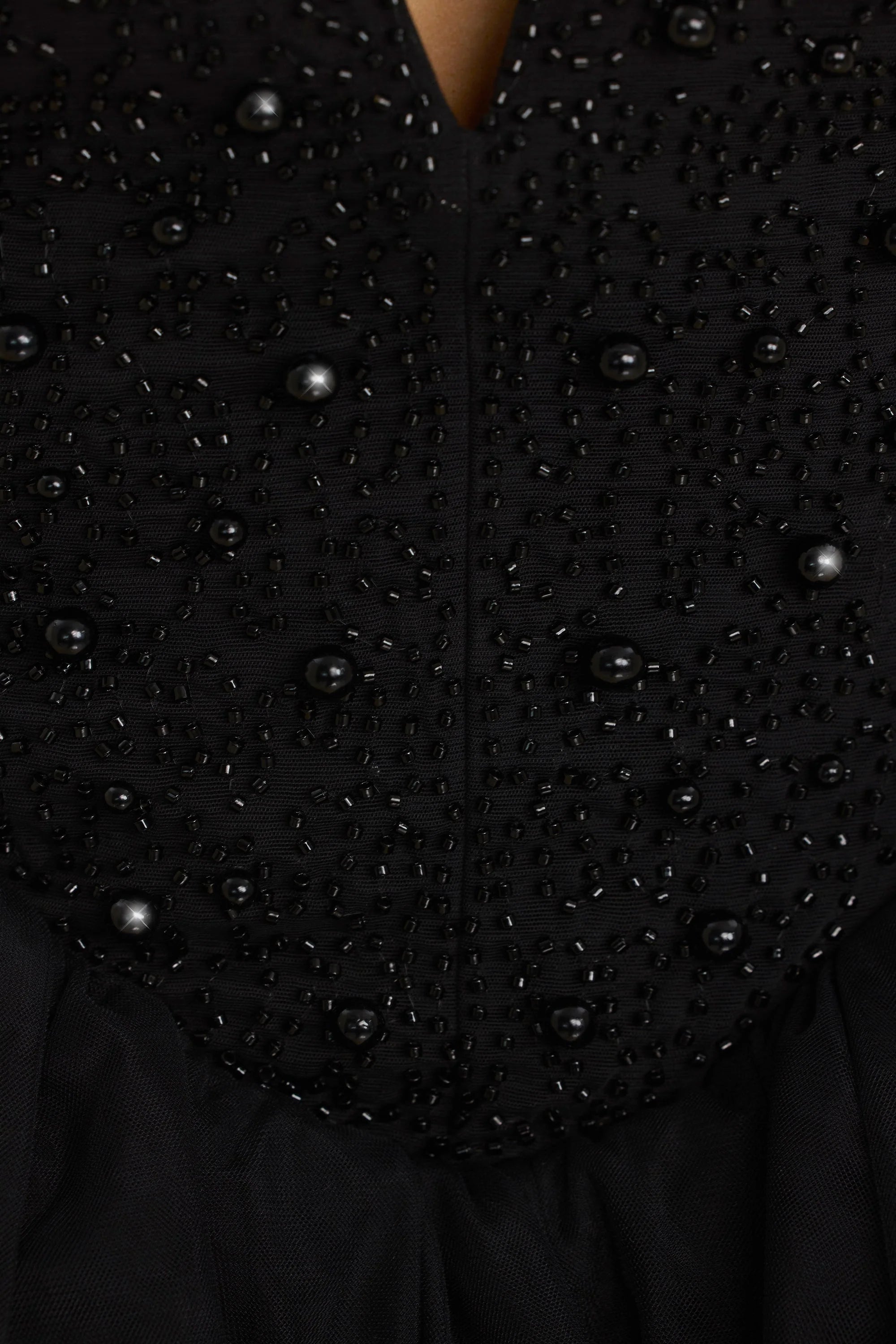 Premium mesh corset with delicate artisanal hand embellishment throughout (Shell: 100% Nylon, Lining: 94% Polyester, 6% Elastane). Fully lined tulle skirt. This garment contains delicate artisanal hand embellishment and it is normal that overtime embellishment may become loose. Additional embellishment has been provided for repairs. Style runs slightly smaller. We recommend sizing up if you are between sizes.