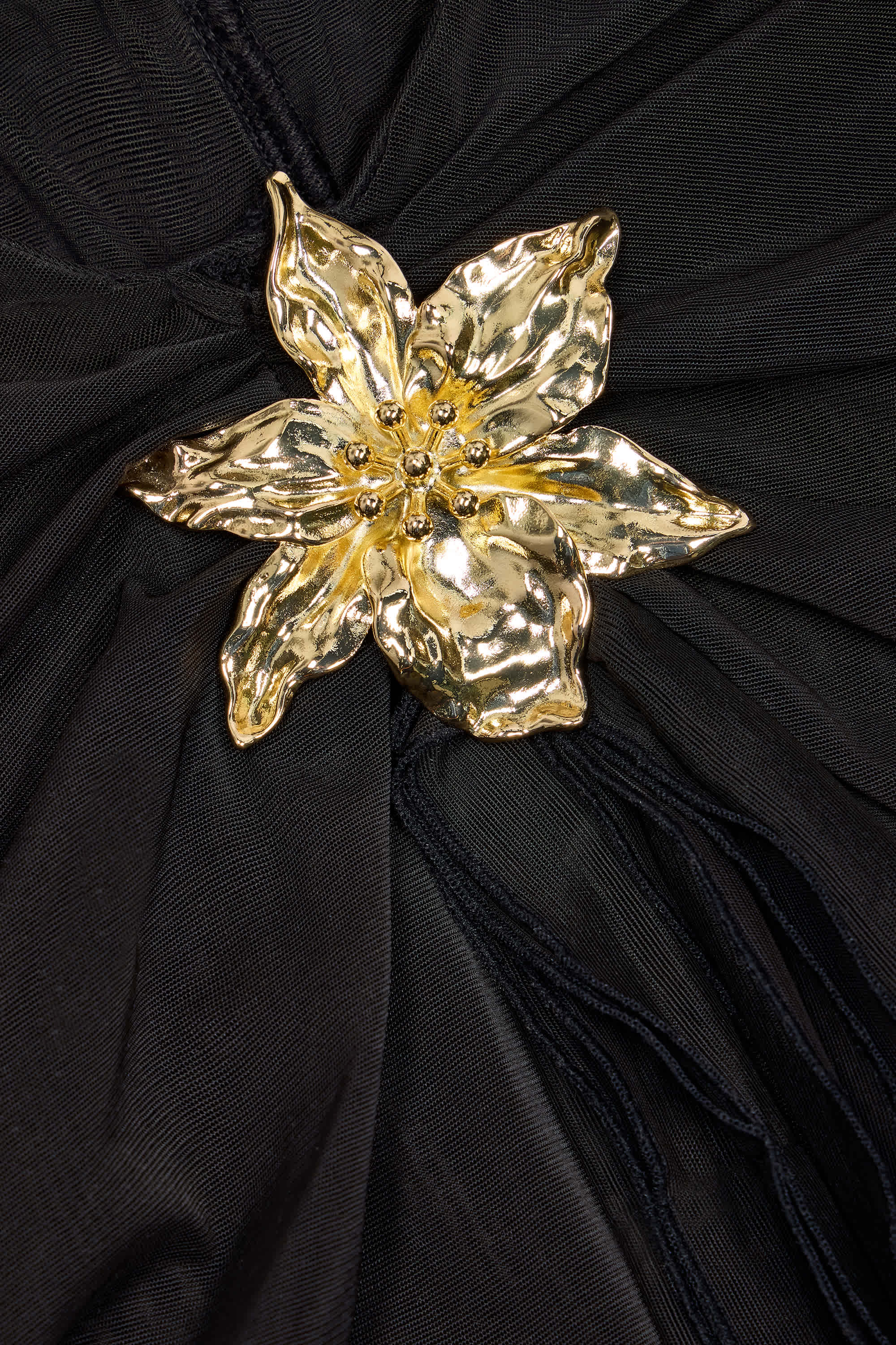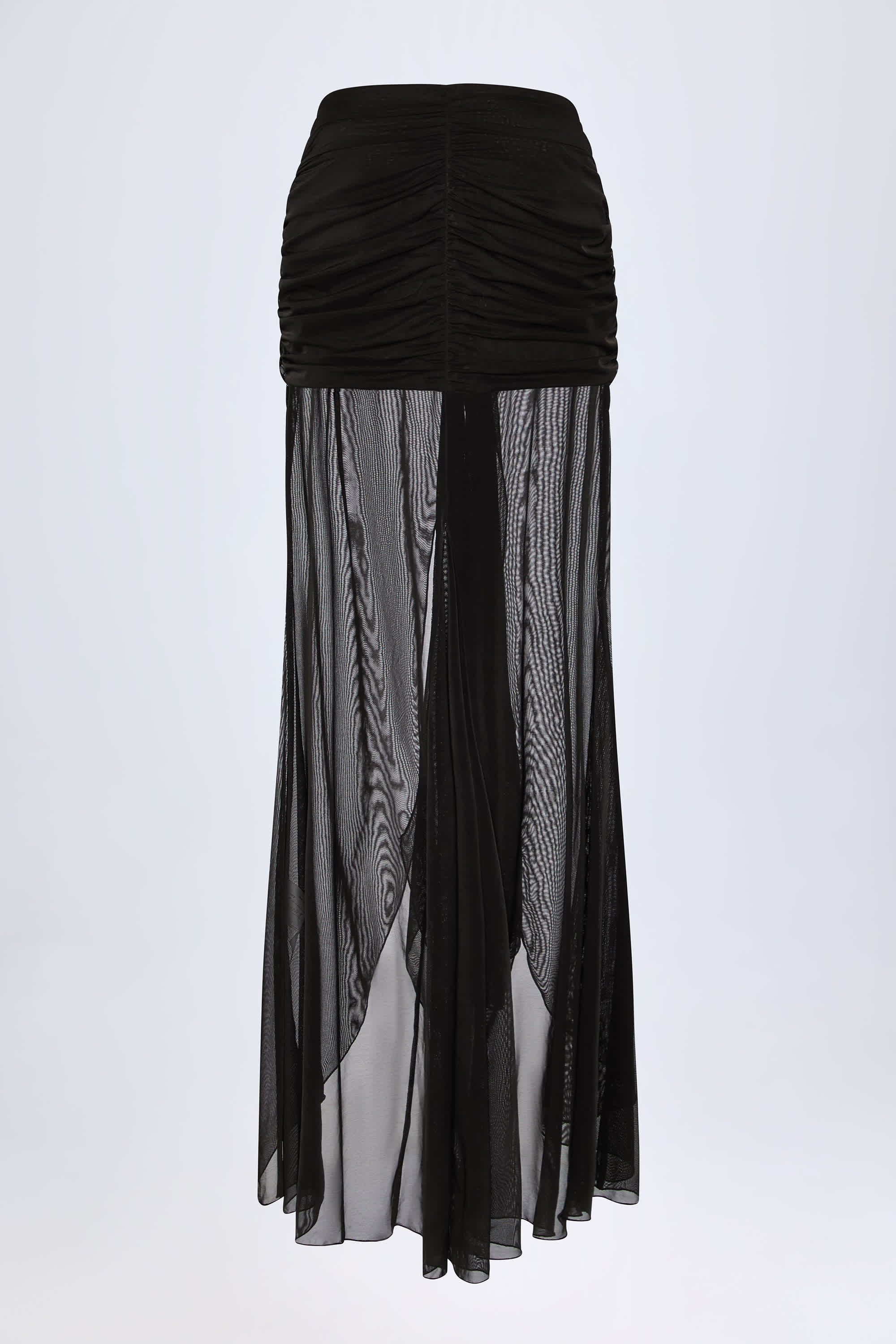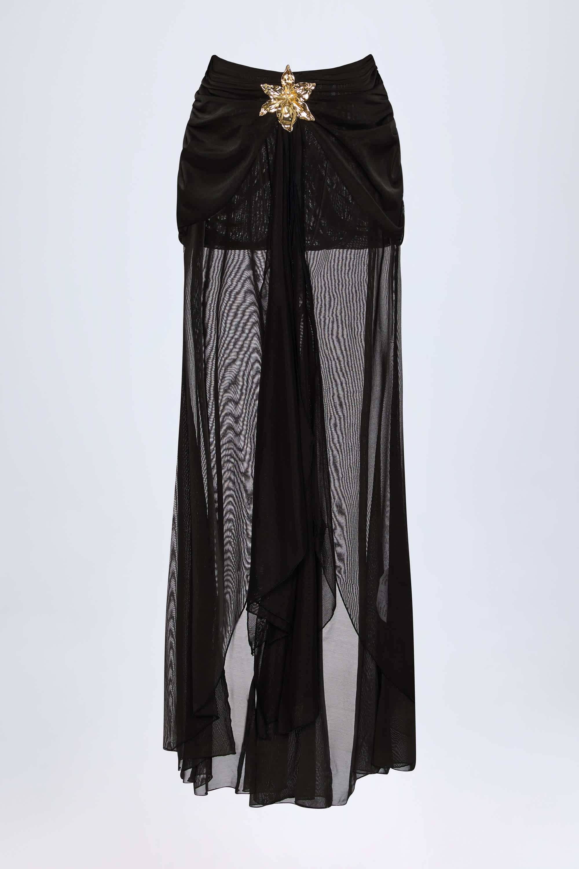 A sheer moment. The Bacalar maxi skirt is crafted from premium, ultra-light 20D stretch mesh for a barely-there feel and maximum impact on your next tropical getaway. Cut to a low-rise silhouette, it features a figure-flattering dipped V-waist, partially lined ruched overlay and a high-low fishtail hem with godet detailing for dynamic movement with every step. It’s embellished with custom floral hardware at the front that pairs back perfectly with our swim separates for a complete resort look.