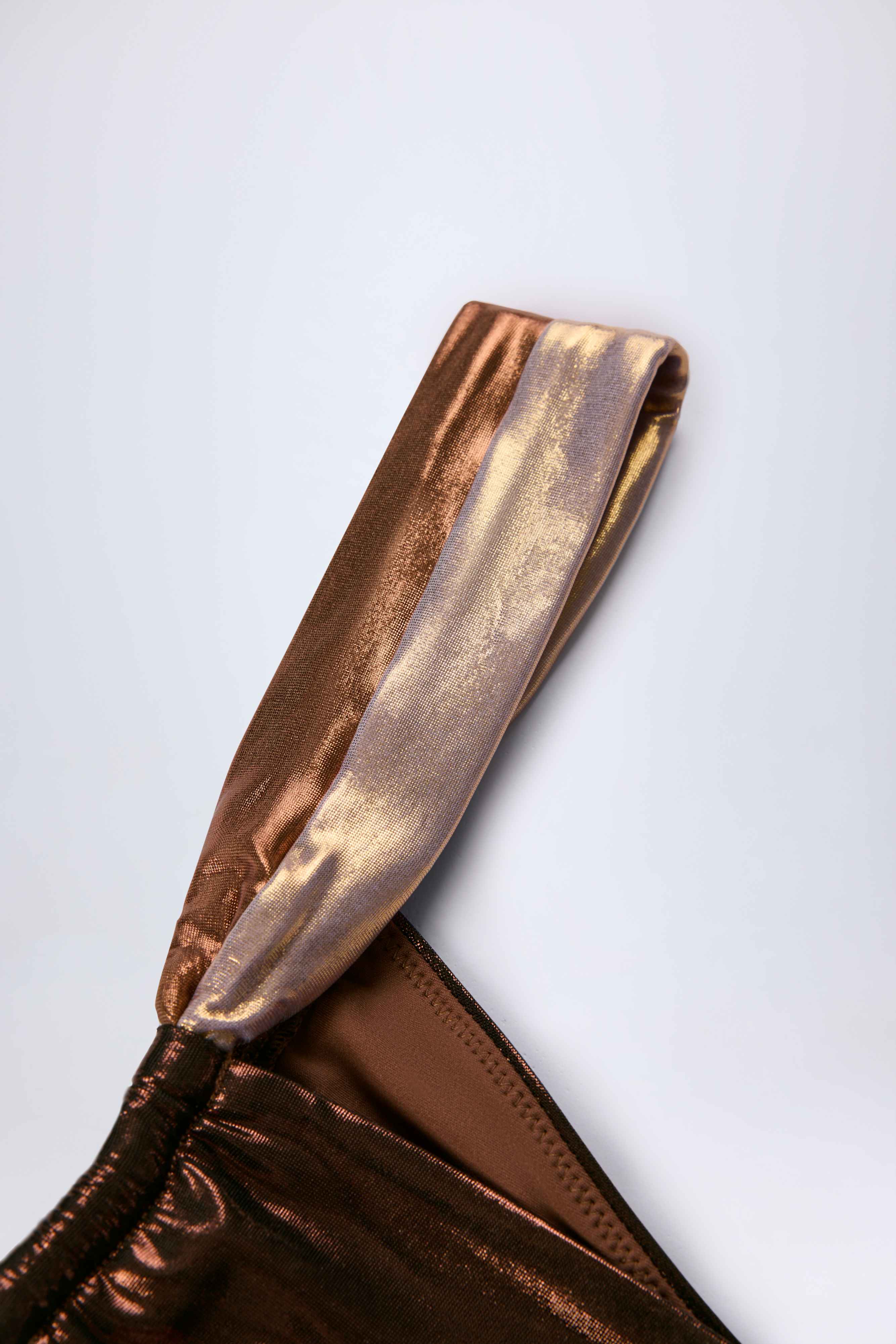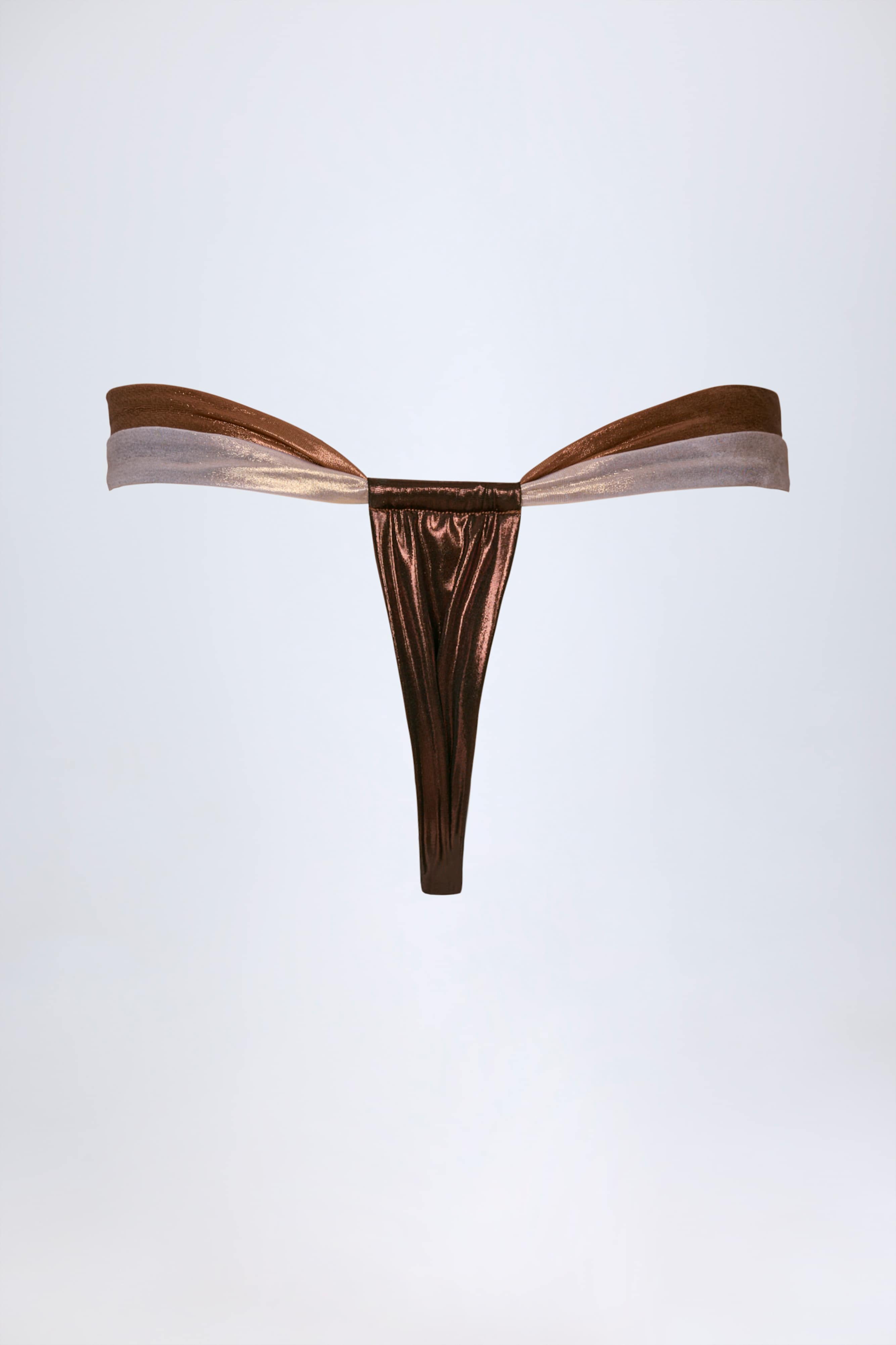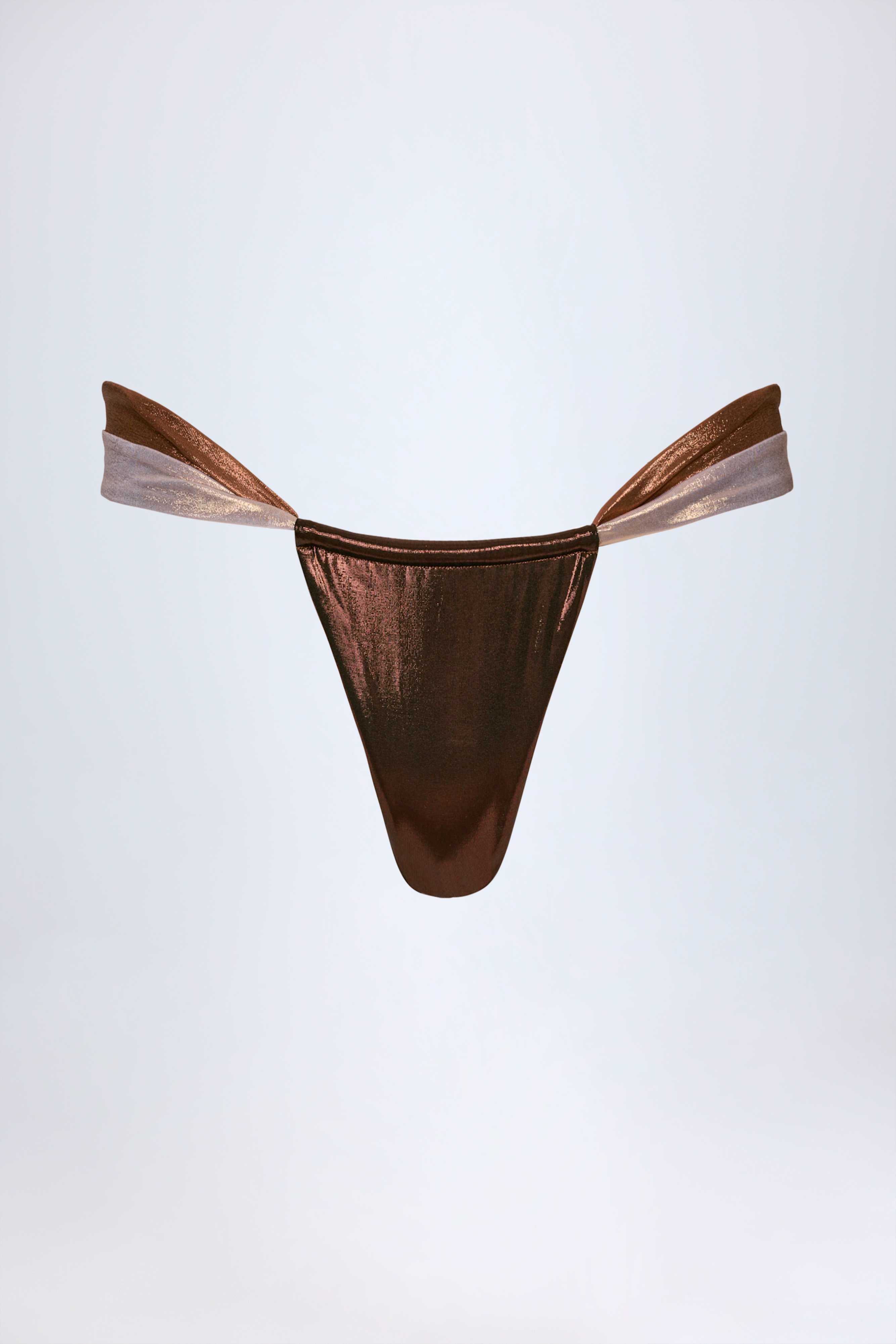 Catch every ray in Maravi. Crafted from our premium foiled jersey, this thong-silhouette bikini bottom features a ruched, two-toned design, perfect for those sun-drenched days. It offers adjustable coverage and wide straps for a comfortable fit.