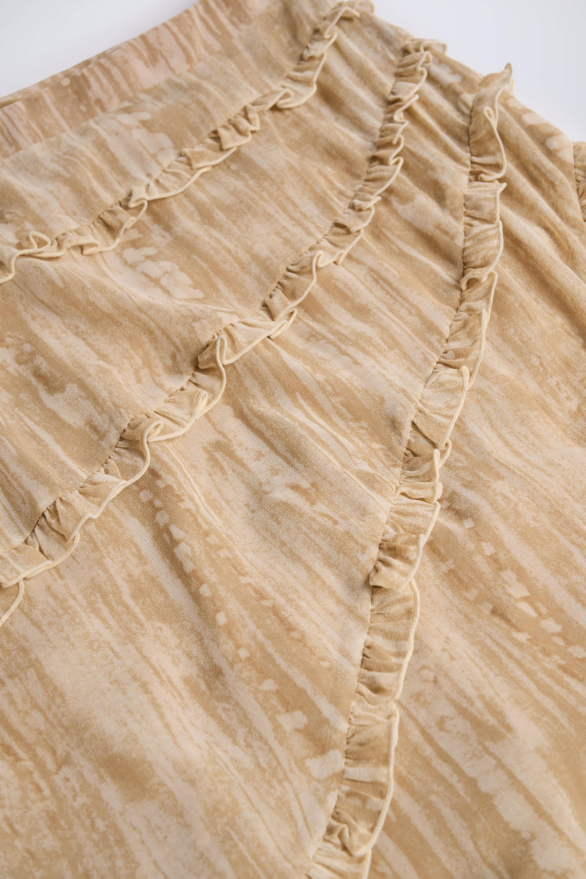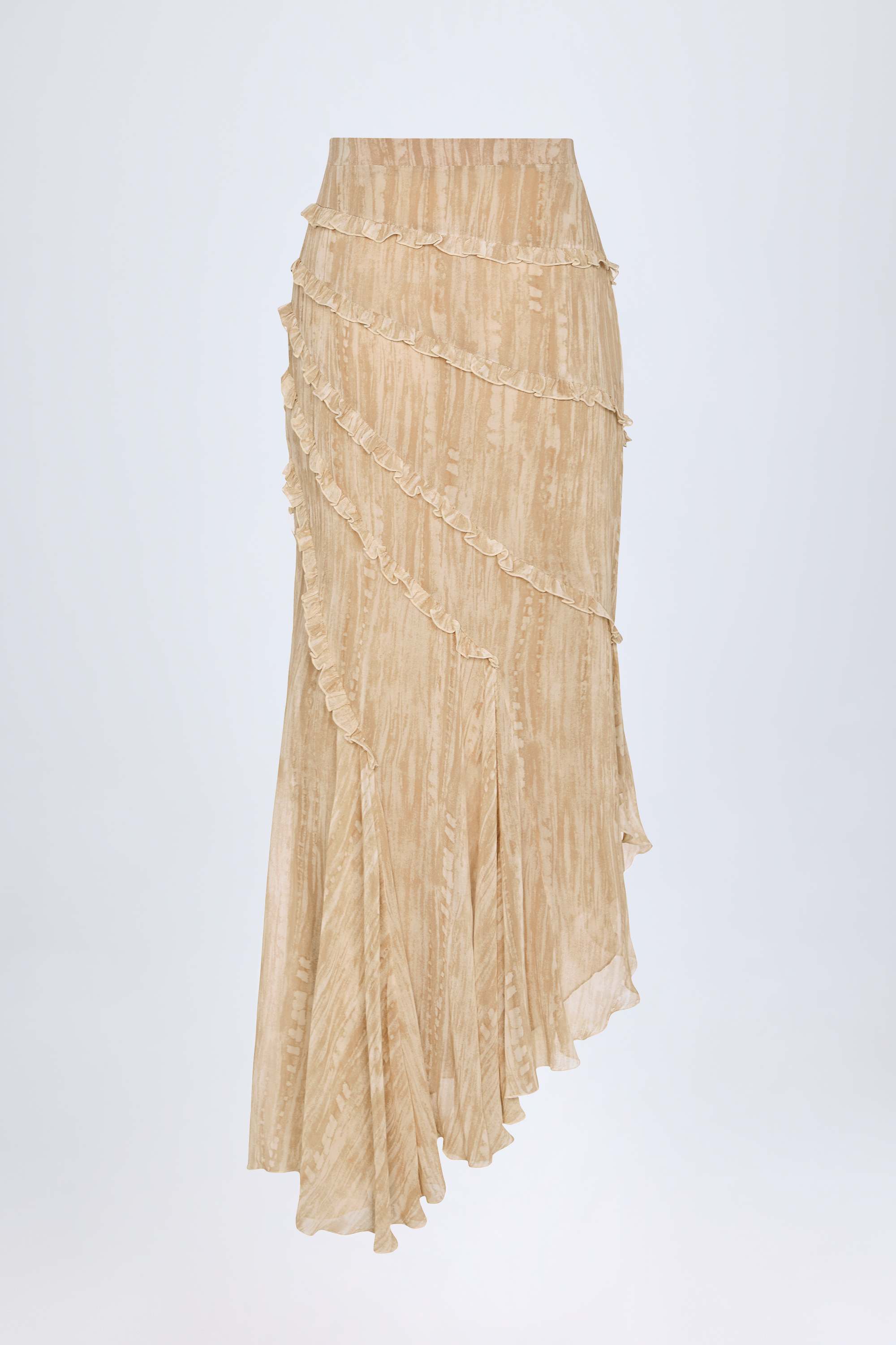 Boho spirit, elevated details. Crafted from premium, lightweight chiffon with a custom textured print, the Novina maxi skirt is cut to a breezy asymmetric silhouette traced with tonal ruffle trims for a dynamic finish. It’s designed for a universally flattering mid-rise fit for effortless styling with a cropped top or tank.
