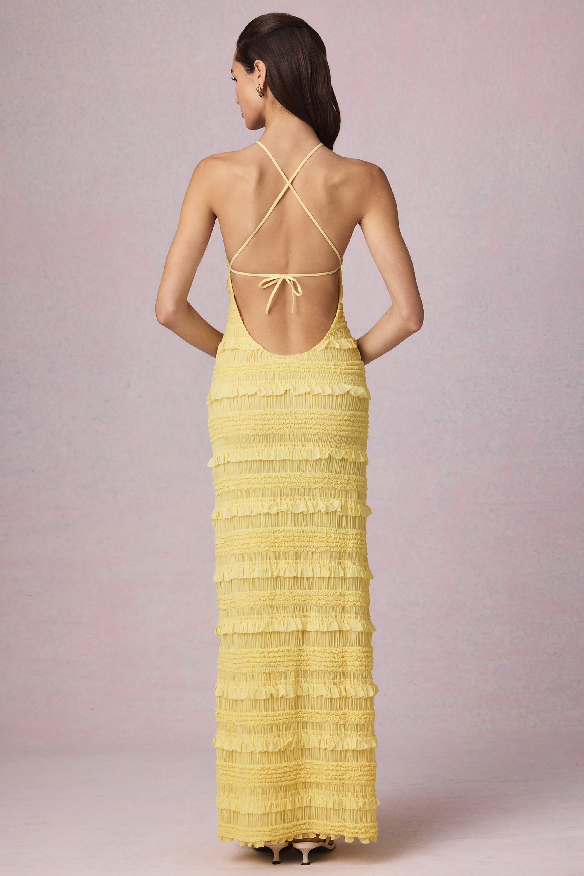 Designed to turn heads, the Tove maxi dress is a seasonal staple for golden hour moments and garden parties. Crafted from premium textured stretch mesh with delicate ruffle detailing throughout, it’s cut to a halterneck silhouette and features a low open back with crossover tie straps for your perfect fit every time. It’s finished with a pretty ruffled hem that’s best balanced with delicate heels.