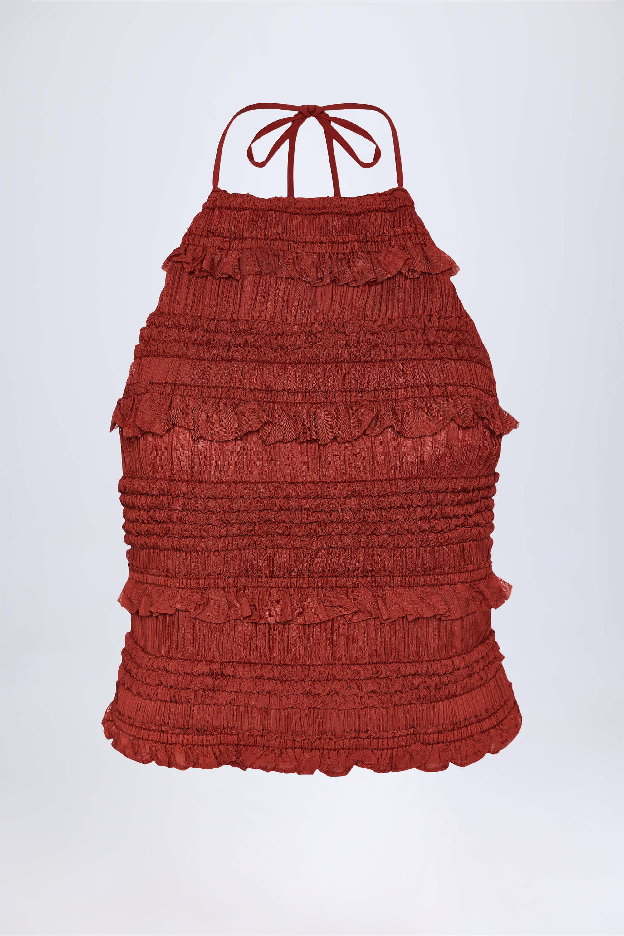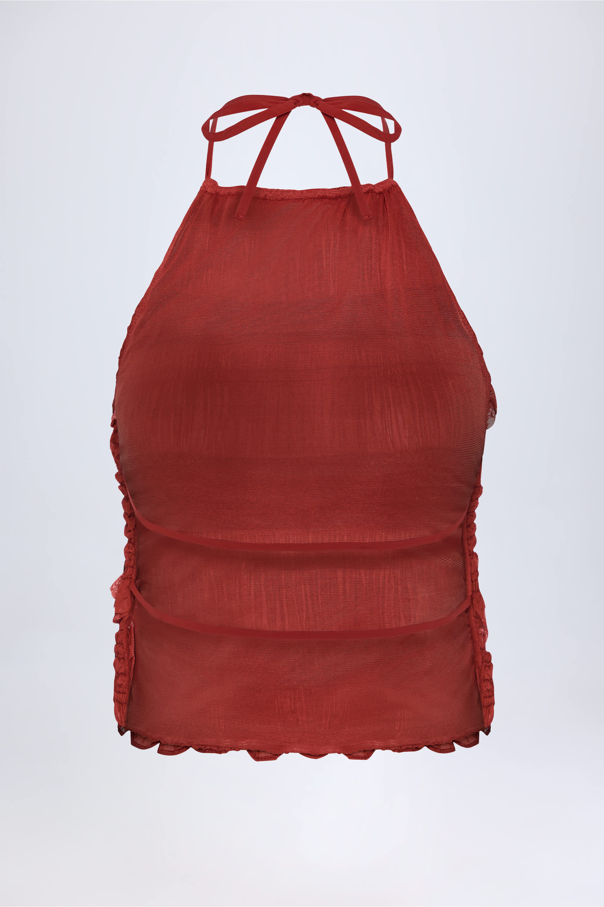 If you love details as much as we do, you’ll love the Natesha top. It’s crafted from our premium, custom-designed textured mesh elevated with cutesy ruffle trims for a statement look. Cut to a high-neck silhouette, it features an open back with two slender straps and a halterneck tie fastening for your perfect fit.